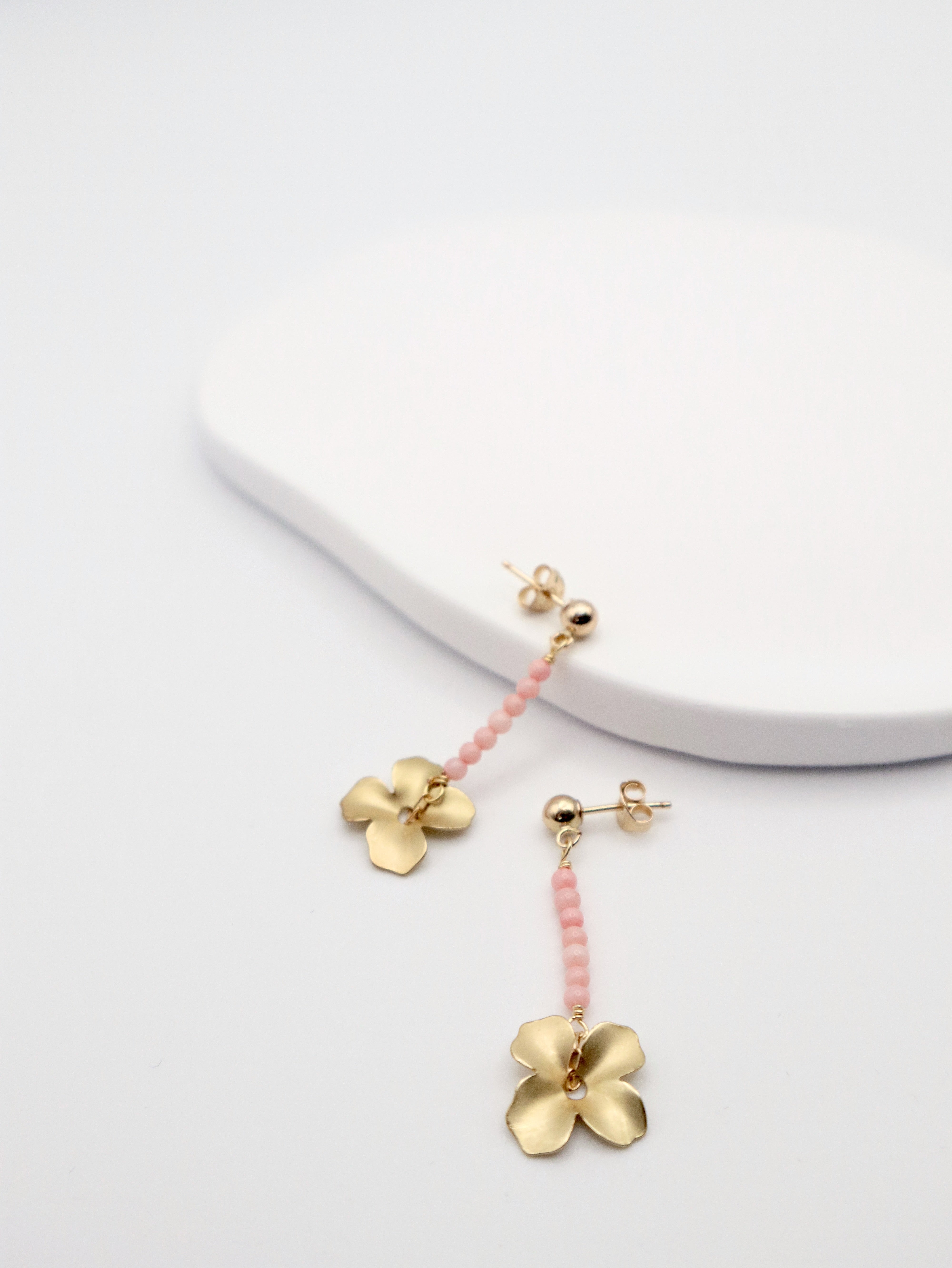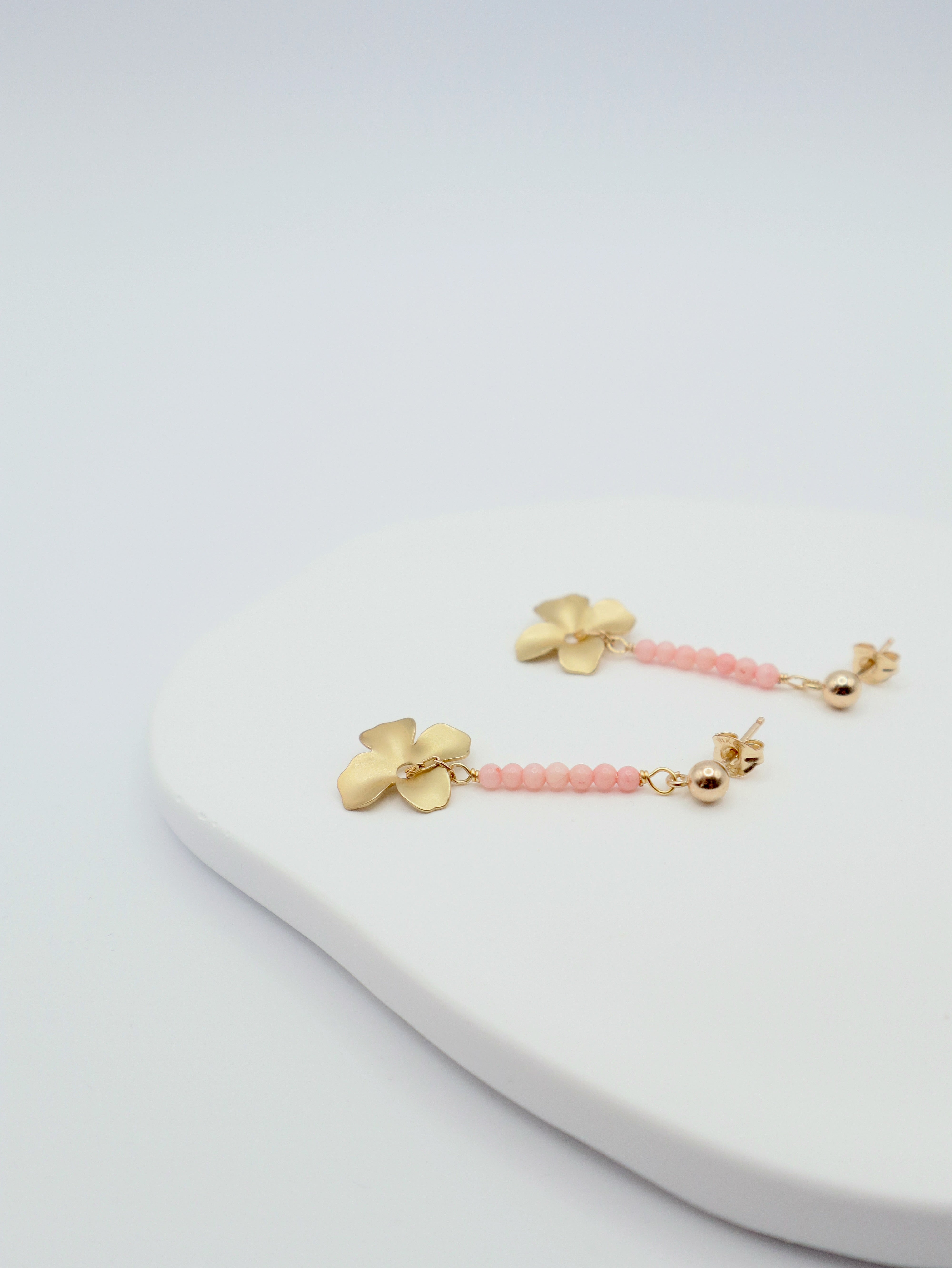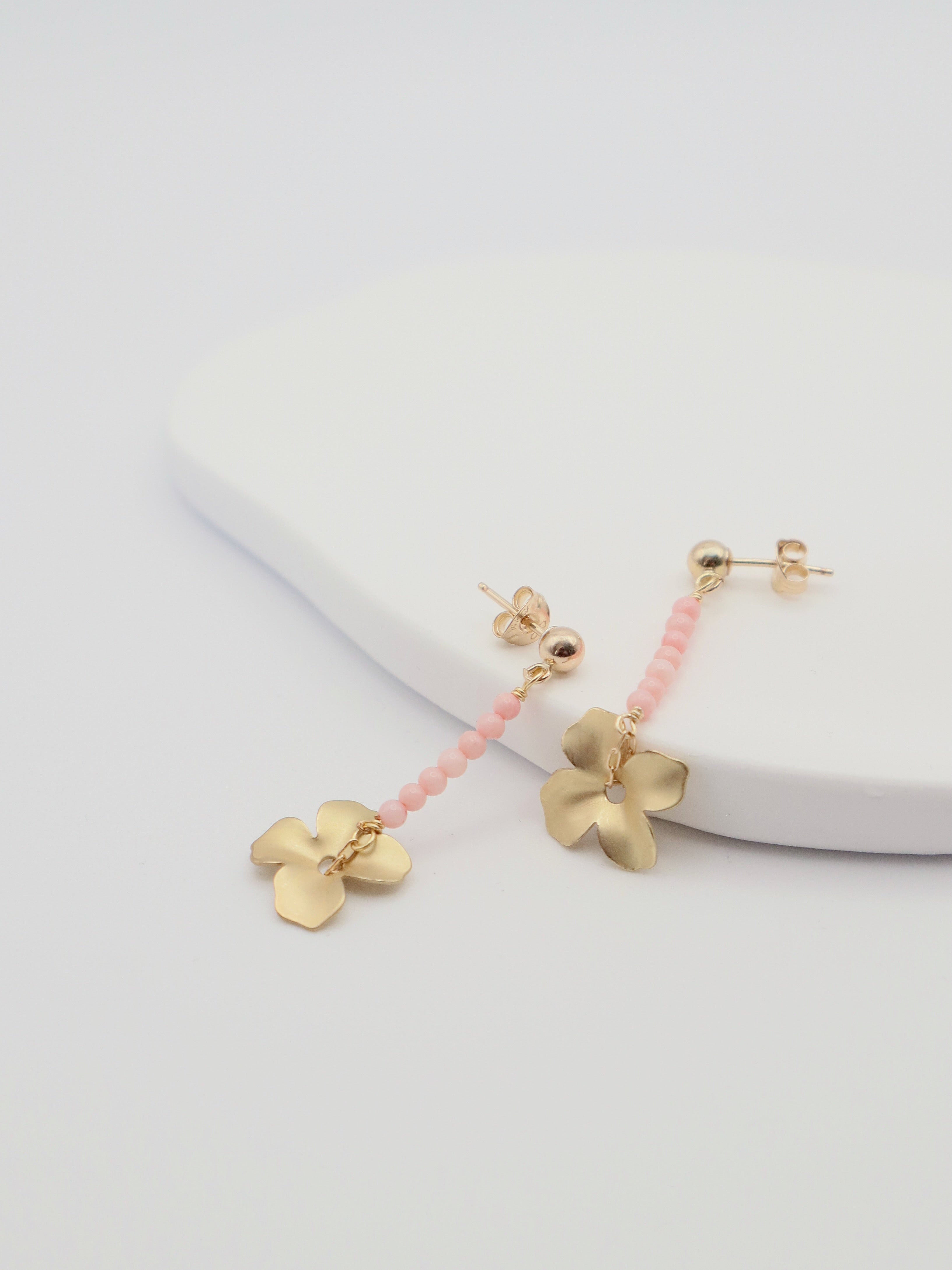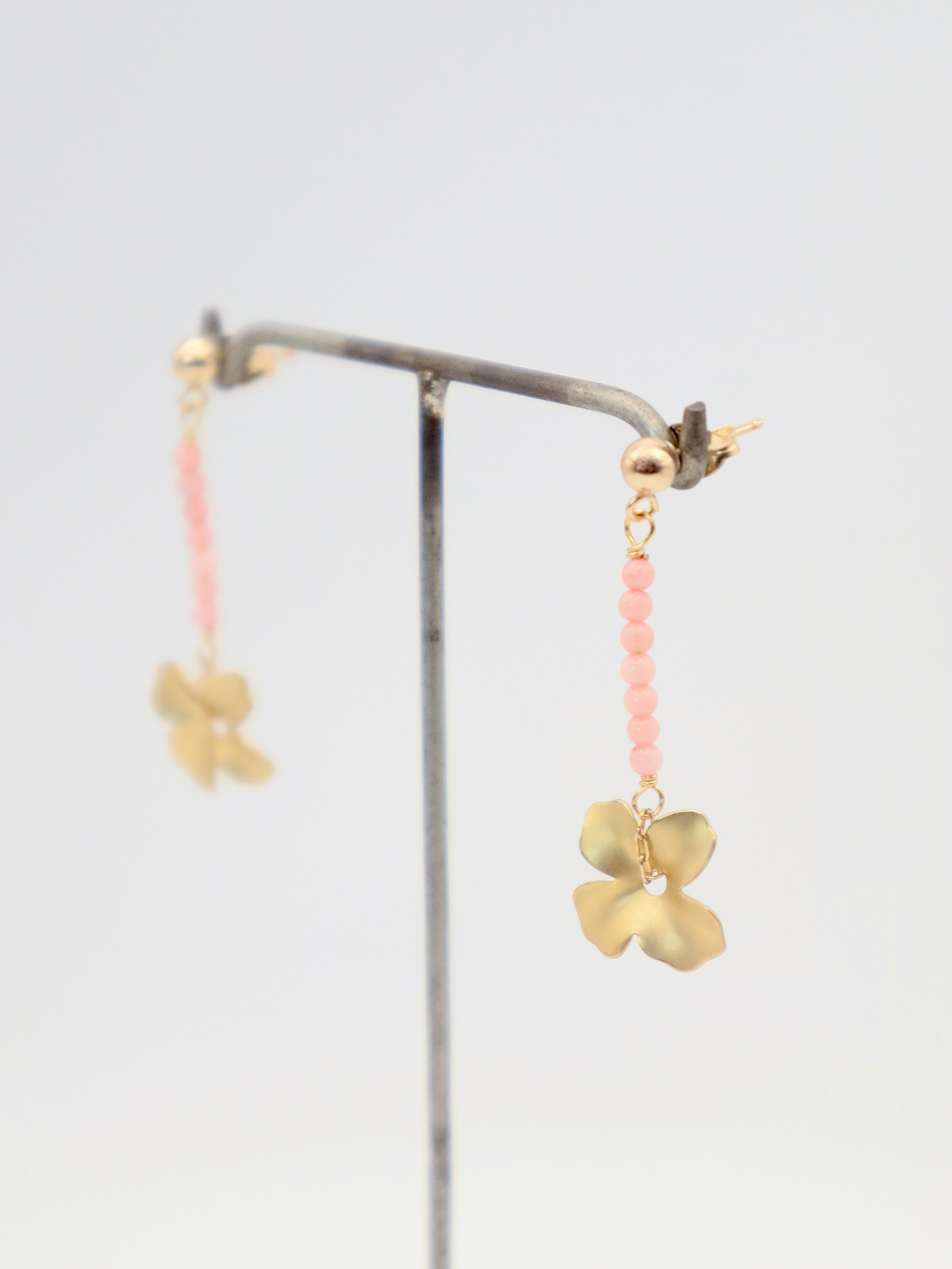 Coral beaded line stud earrings with a matte gold flower drop. Assembled by hand in our Dublin studio.