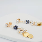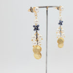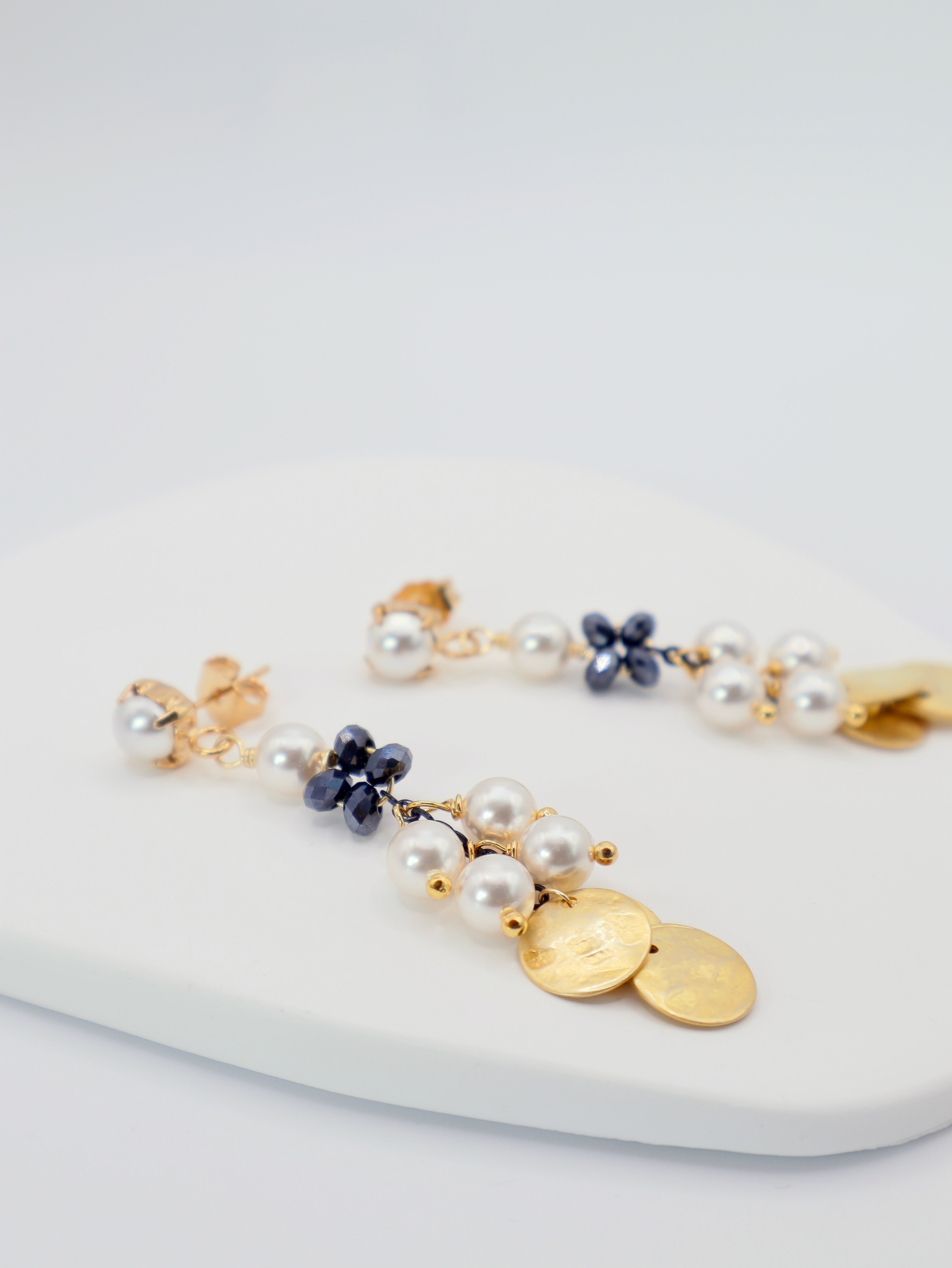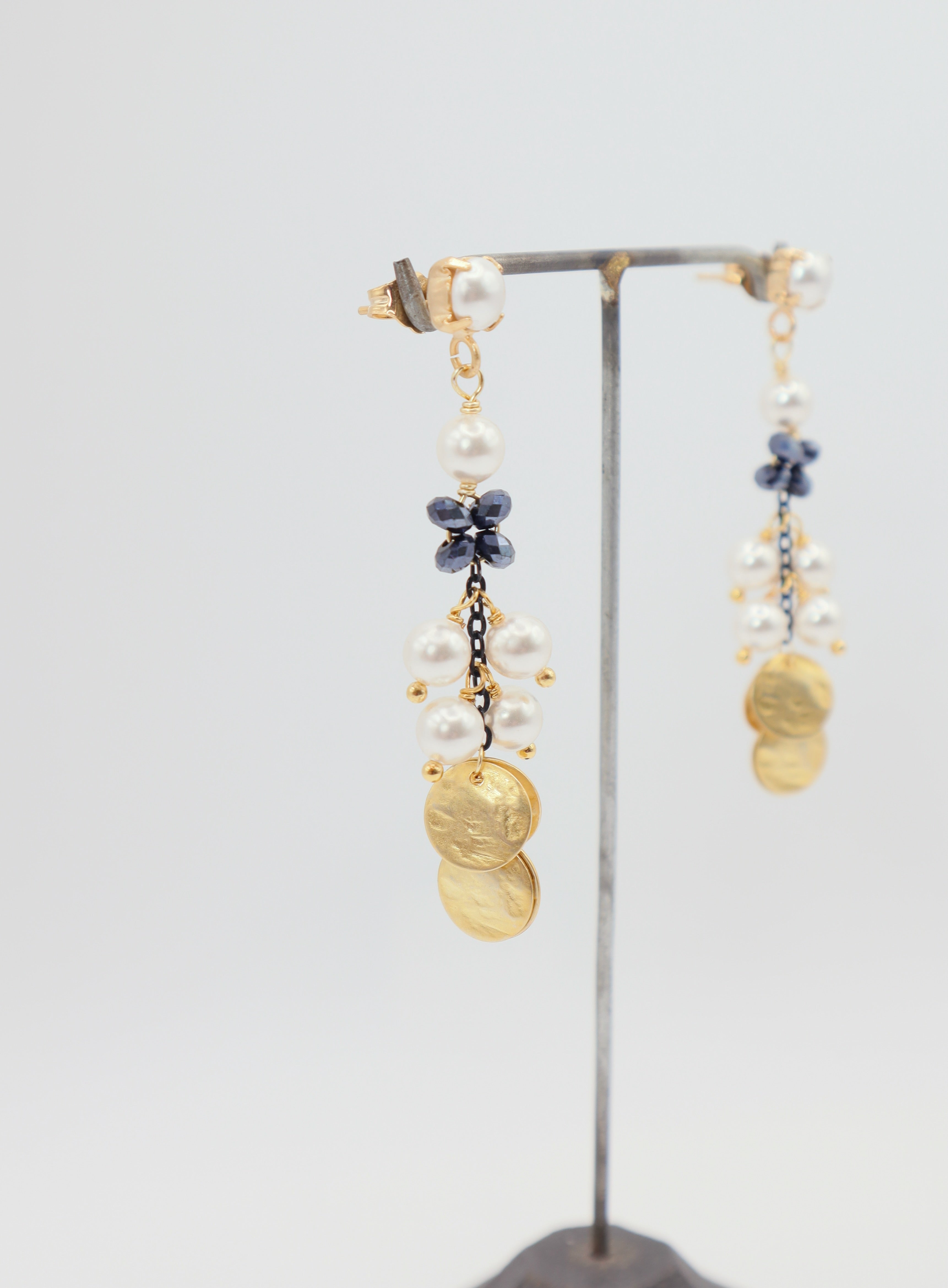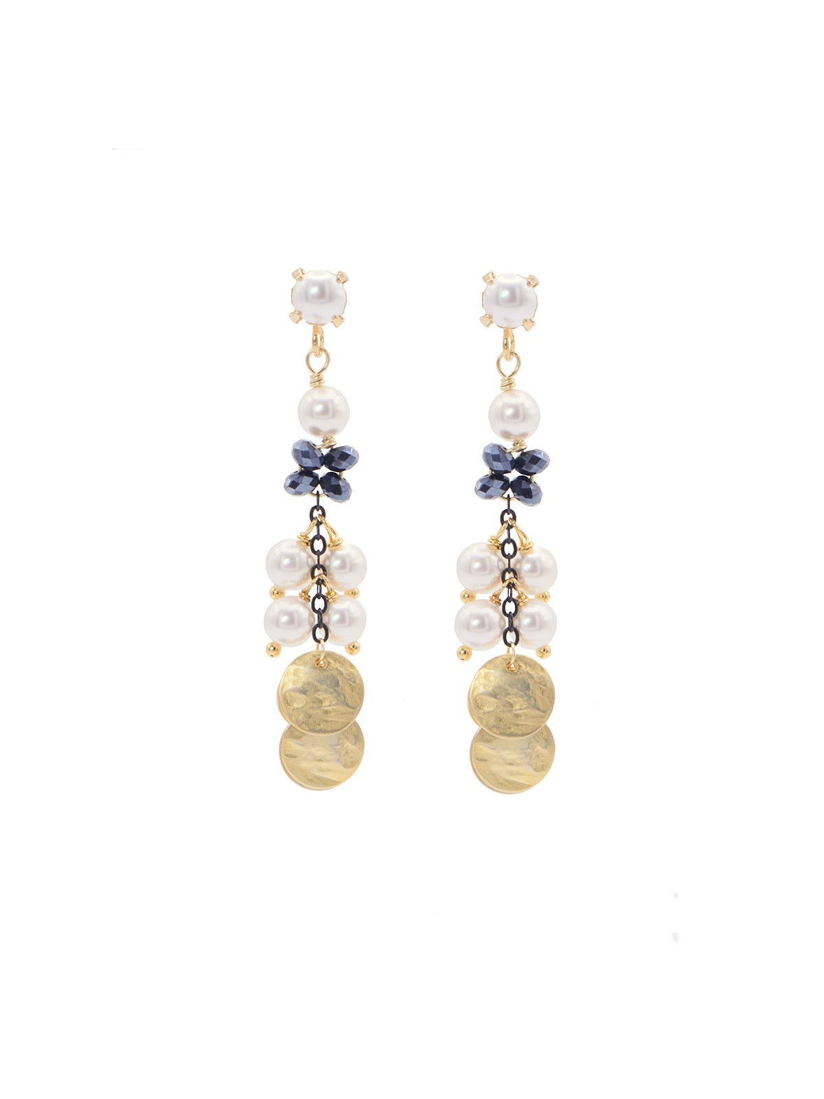 Featuring a cascade of luminous white crystal pearls, jet-black crystal clusters, and layered hammered gold discs, this pair captures movement and texture with grace.