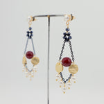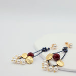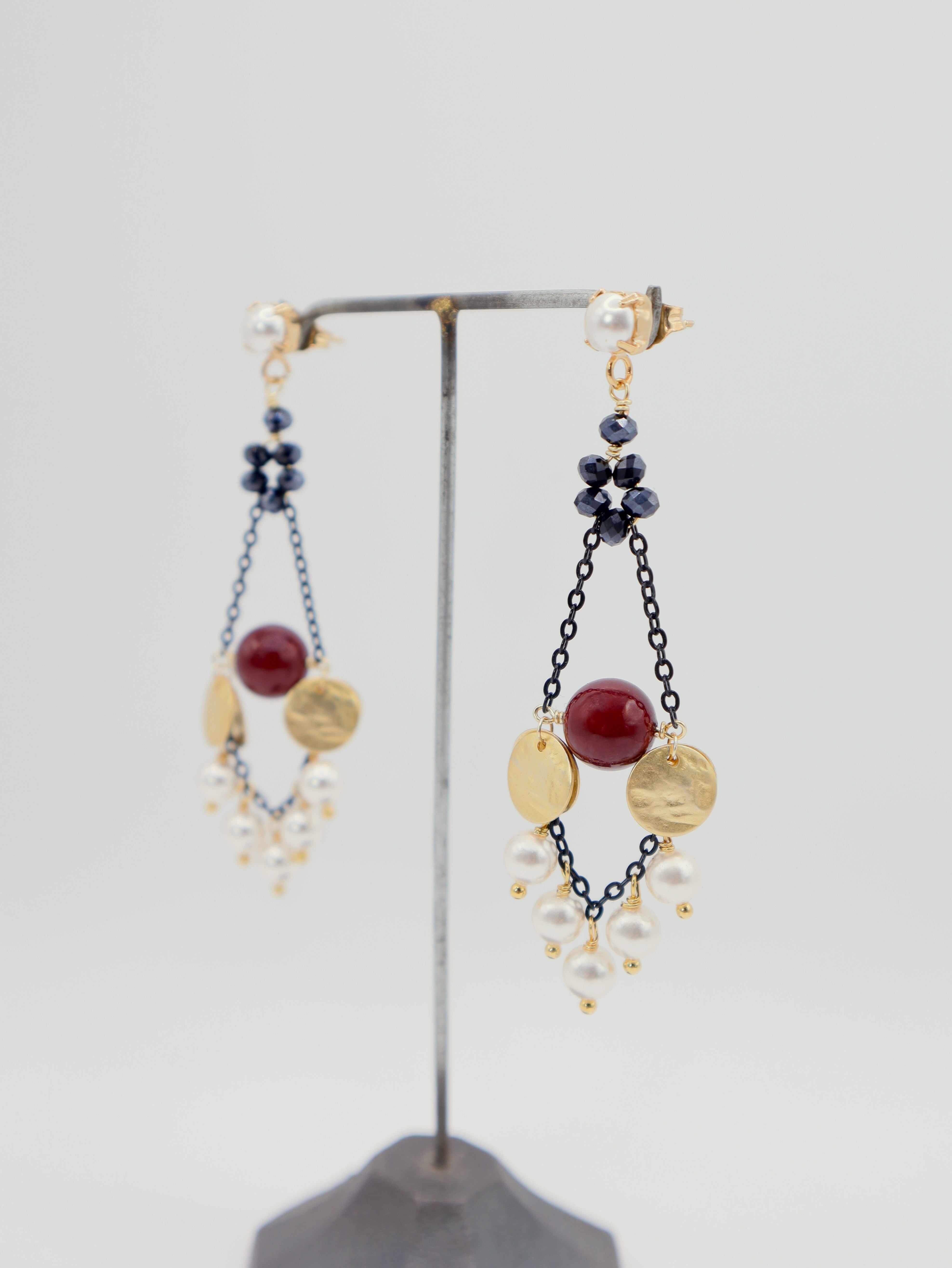 The Carmen Earrings are designed to make an entrance — with a bold teardrop silhouette framed in black chain, burgundy shell pearls, hammered gold discs, and luminous pearl drops.