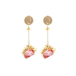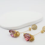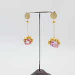 Anchored by circular posts, they flow down to delicate chains and onto the main spotlight: rose pink glass stones surrounded by matte gold wavy discs.
