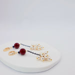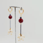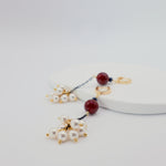 The Chylah Earrings feature a striking blend of contrast and movement — with rich burgundy shell pearls, jet-black crystal accents, and a playful cluster of luminous white pearls.