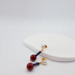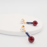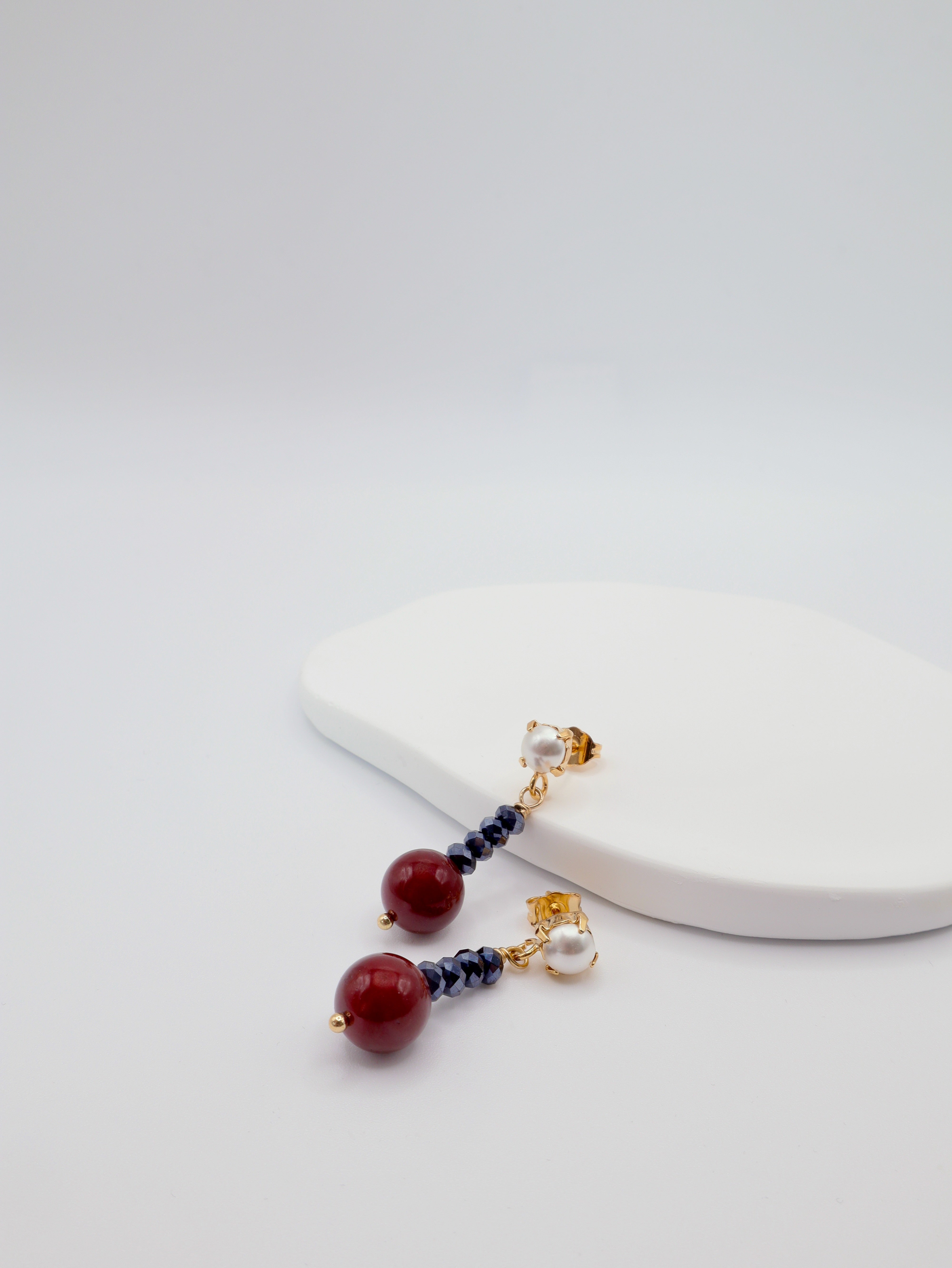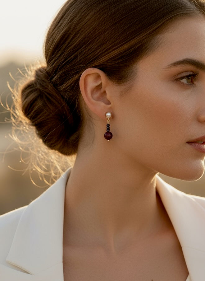 The Clair Earrings blend classic beauty with modern edge — a delicate balance of deep burgundy shell pearls, faceted black crystals, and luminous white pearls.