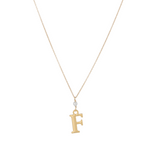 Matte gold plated "F" initial charm necklace. It is suspended on a Swarovski crystal pearl from our classic gold filled chain and closes with a mini toggle clasp surrounded by two little pearls.