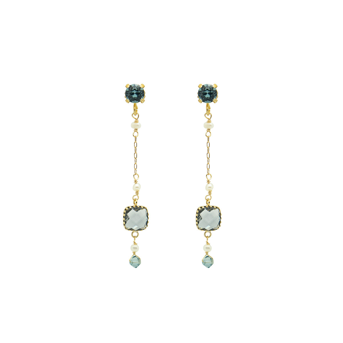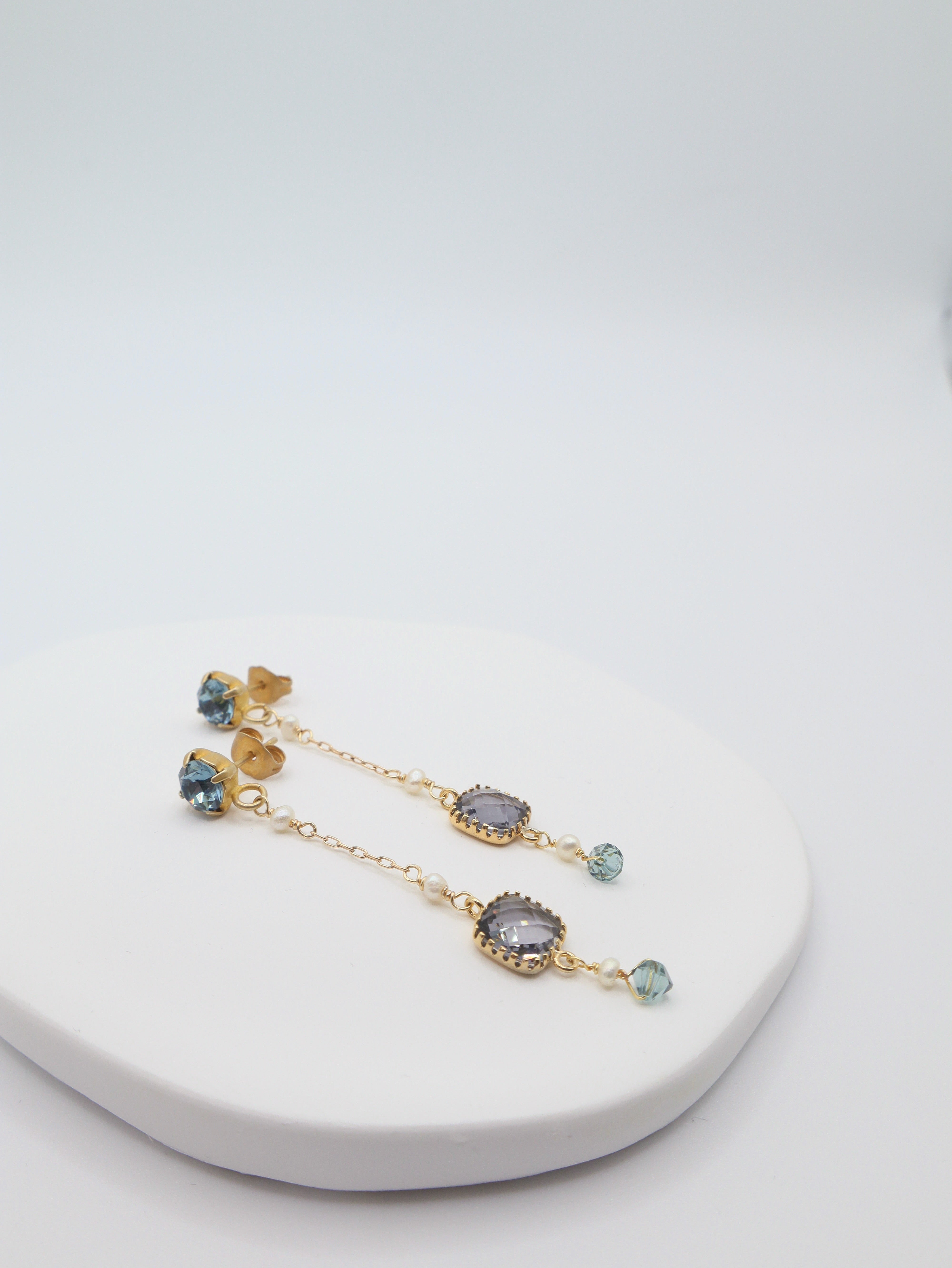 Their sleek profiles are highlighted by aqua studs that cascade down to gold-tone chains, with adornments of micro pearls and smoke square drops.