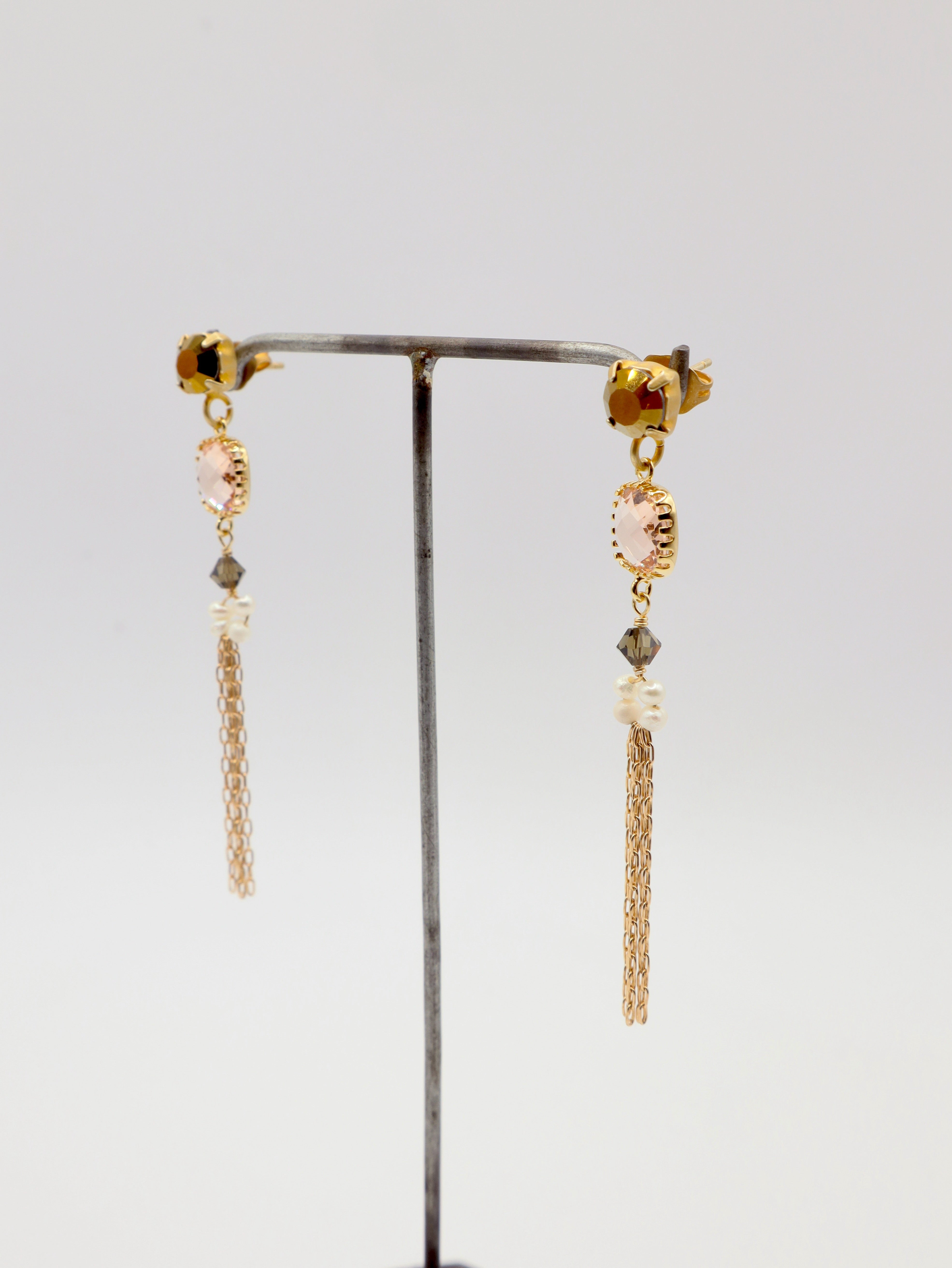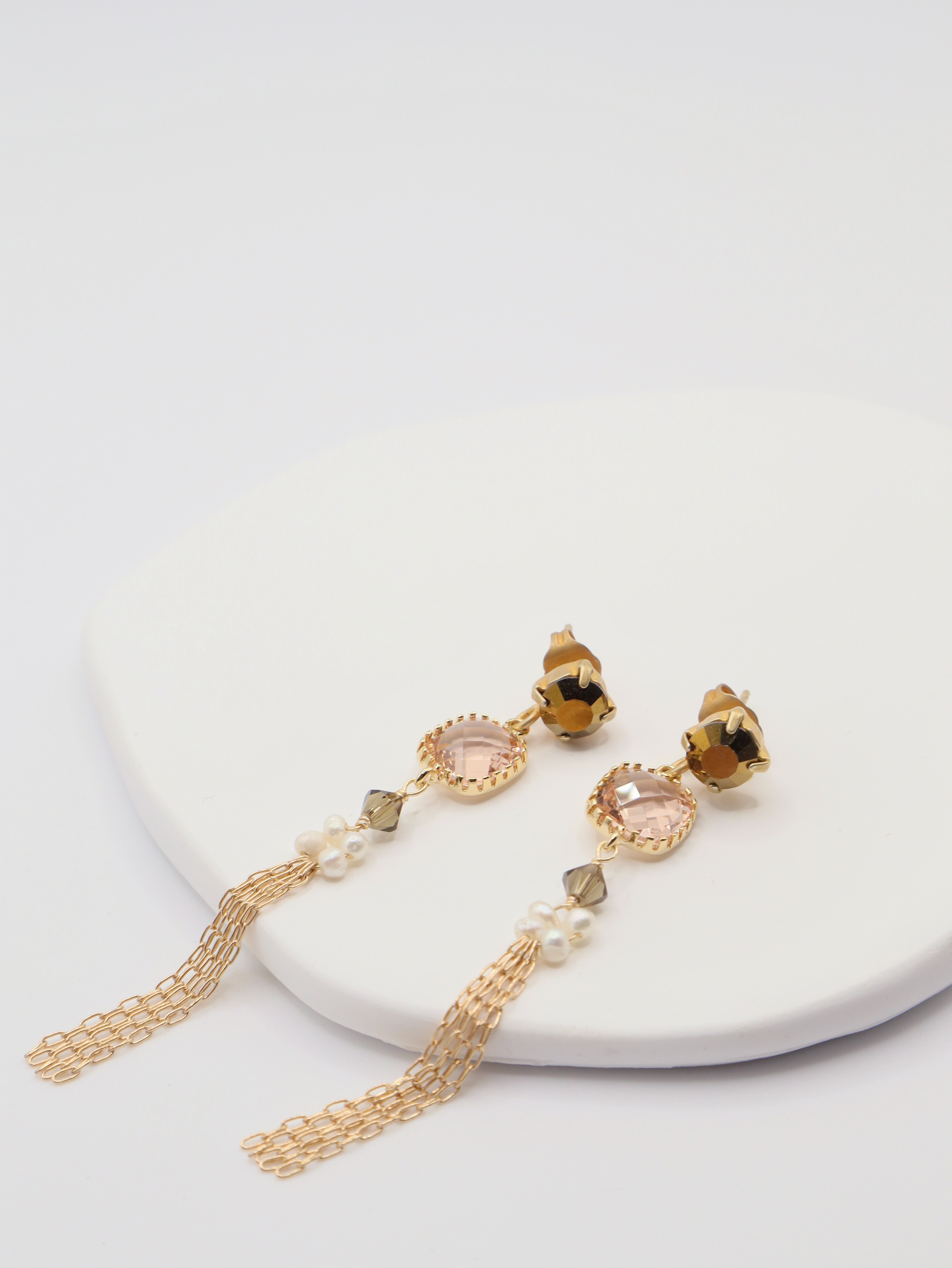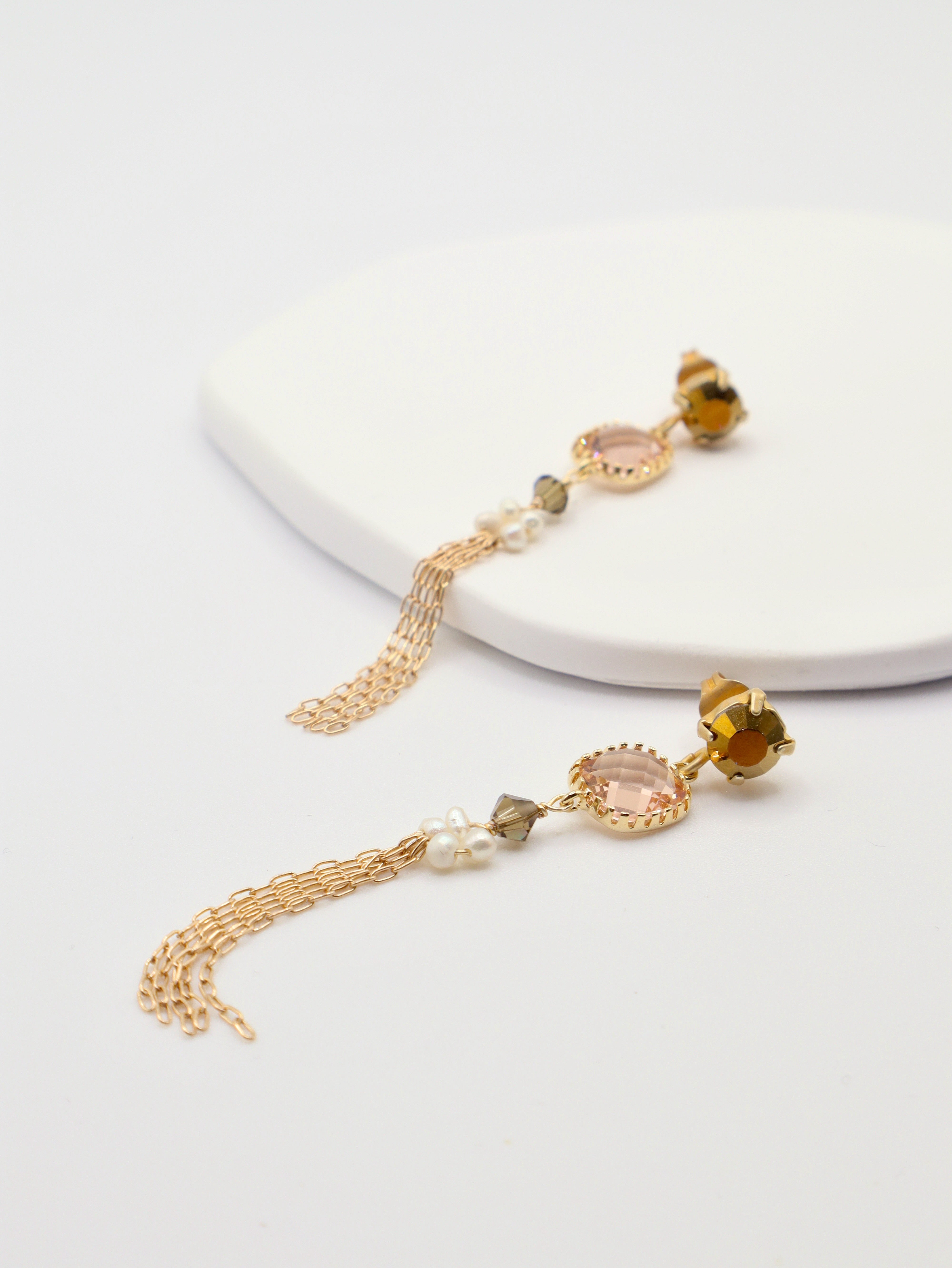 Bronze sport dangling peach square stones, giving way to micro pearls and gold fringe chains that are begging for the dance floor.