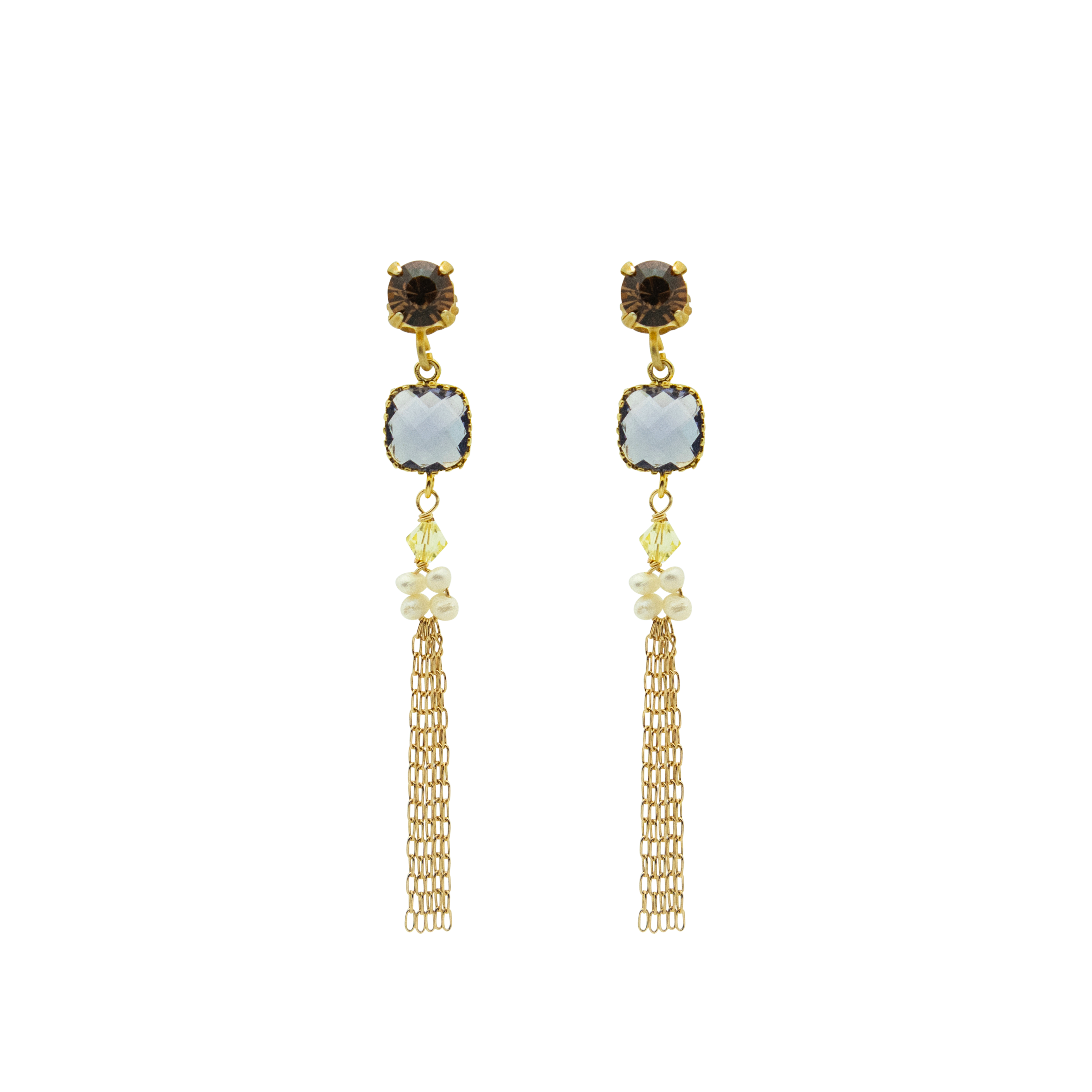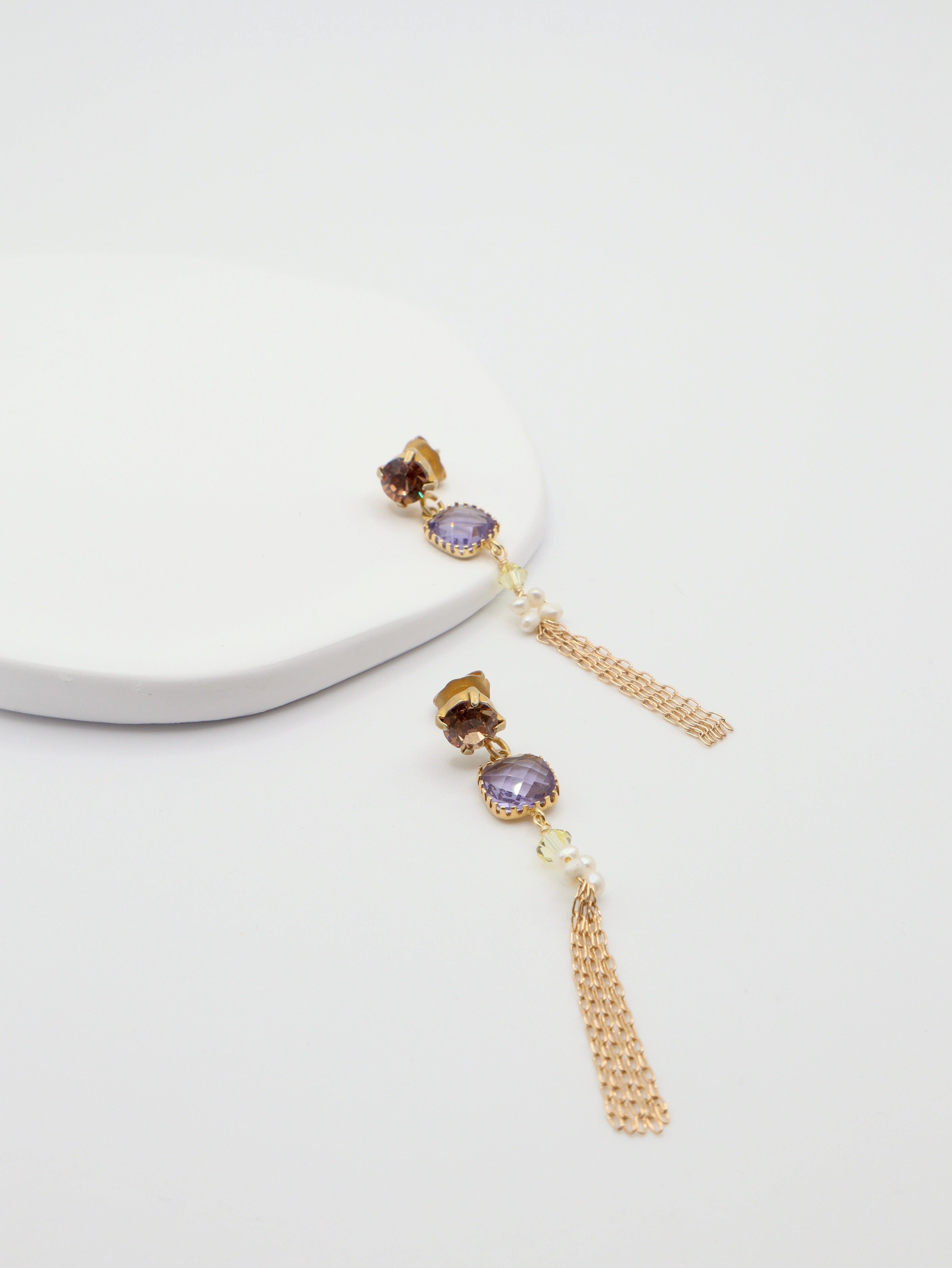 Adorned with glimmering studs and tanzanite square stones, they glimmer down to micro pearls with gold fringe.