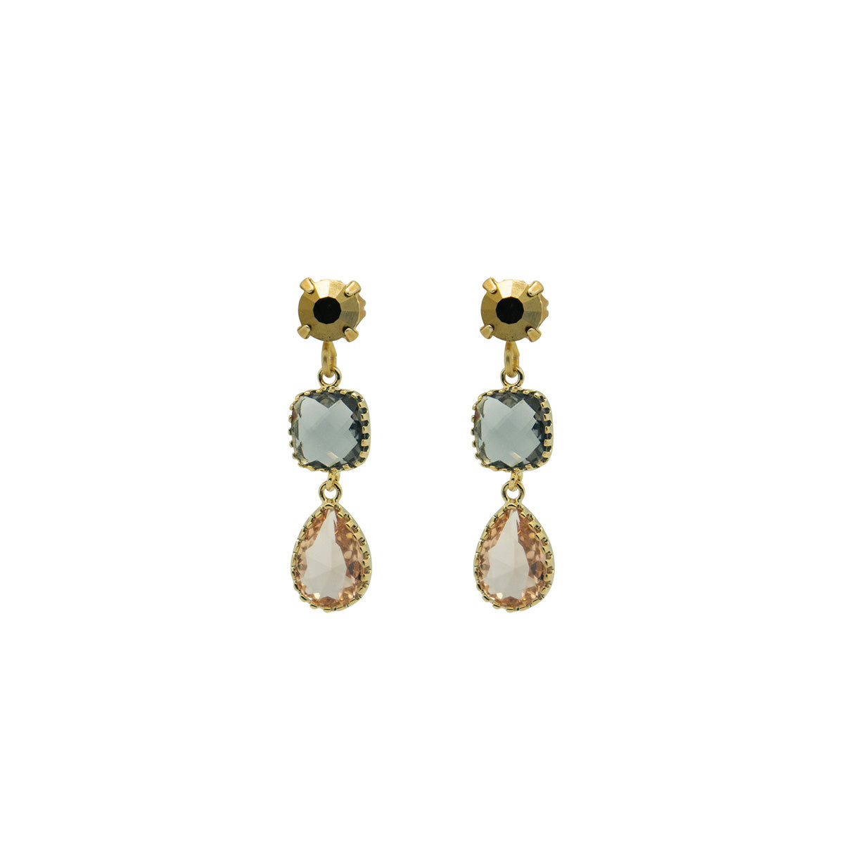 Adorned with bronze studs, the drop-style earrings cascade down to smoke stones and peach-hued teardrops.