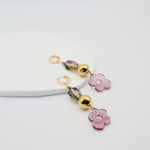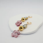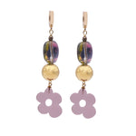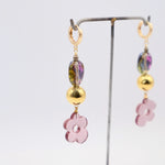 Anchored by polished gold spheres and iridescent glass, the translucent pink flower drop adds a soft yet striking finish.
