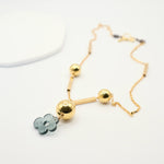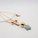 Its dark green floral charm anchors golden spheres and architectural bars, creating a striking balance of softness and strength.