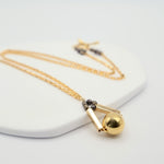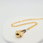 Featuring a bold gold orb suspended from twin gold bars and surrounded by faceted bronze glass beads, it hangs from a refined square-link chain.