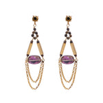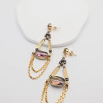 Twin loops of gold chain drape from faceted crystal clusters and metallic accents, finished with a mix of iridescent and high-shine gold beads.