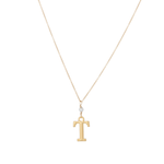 Matte gold plated "T" initial charm necklace. It is suspended on a Swarovski crystal pearl from our classic gold filled chain and closes with a mini toggle clasp surrounded by two little pearls.
