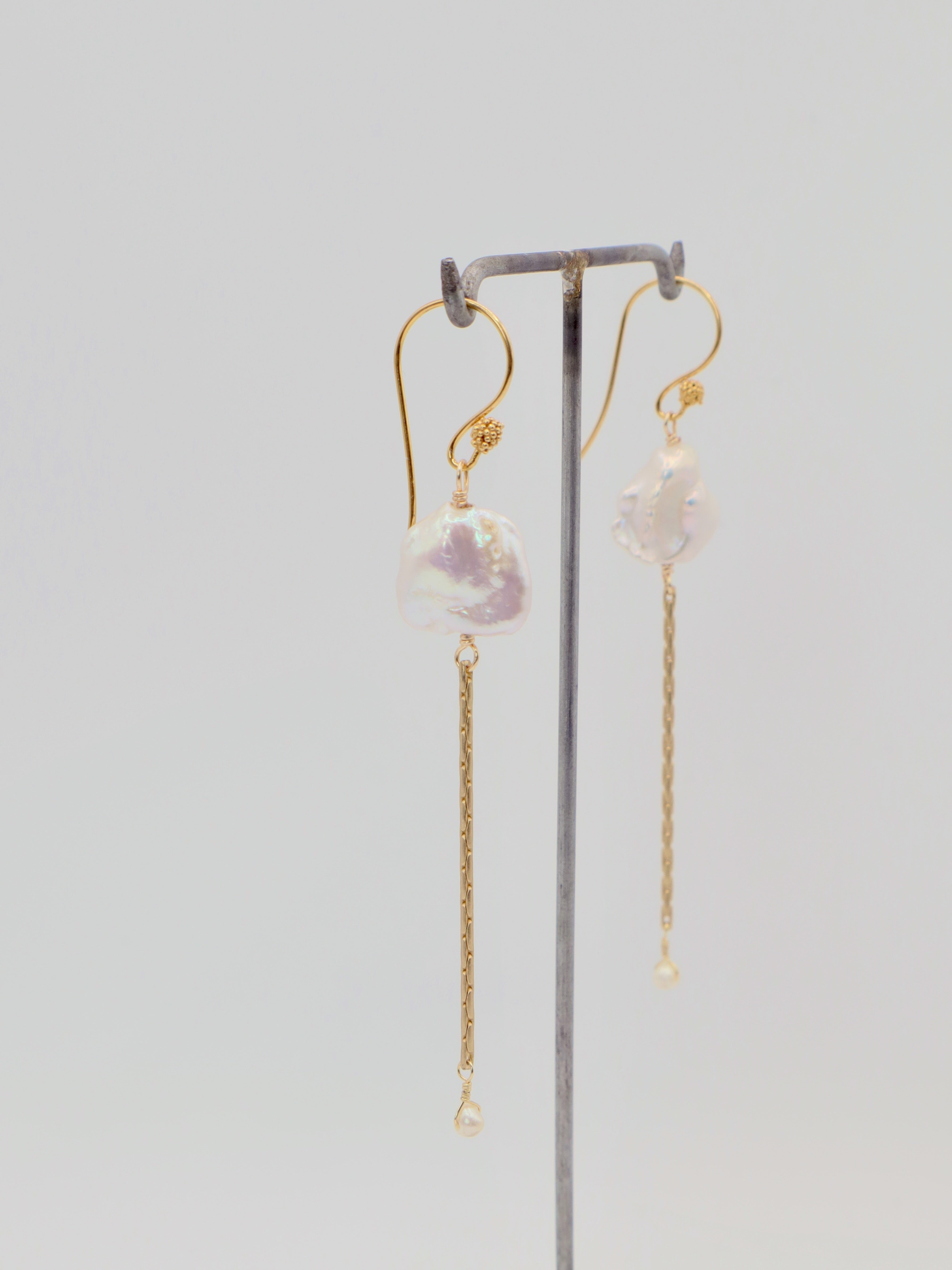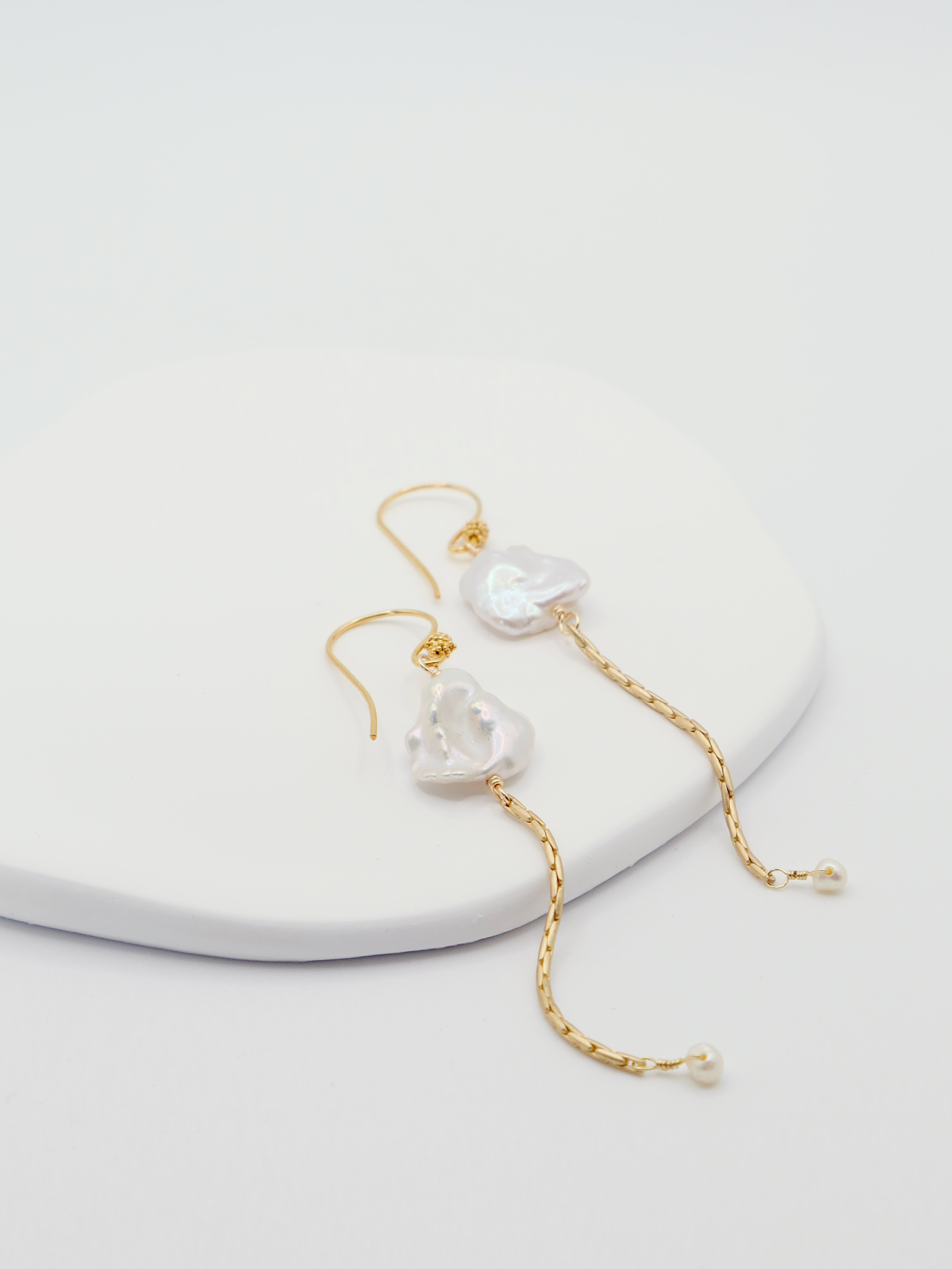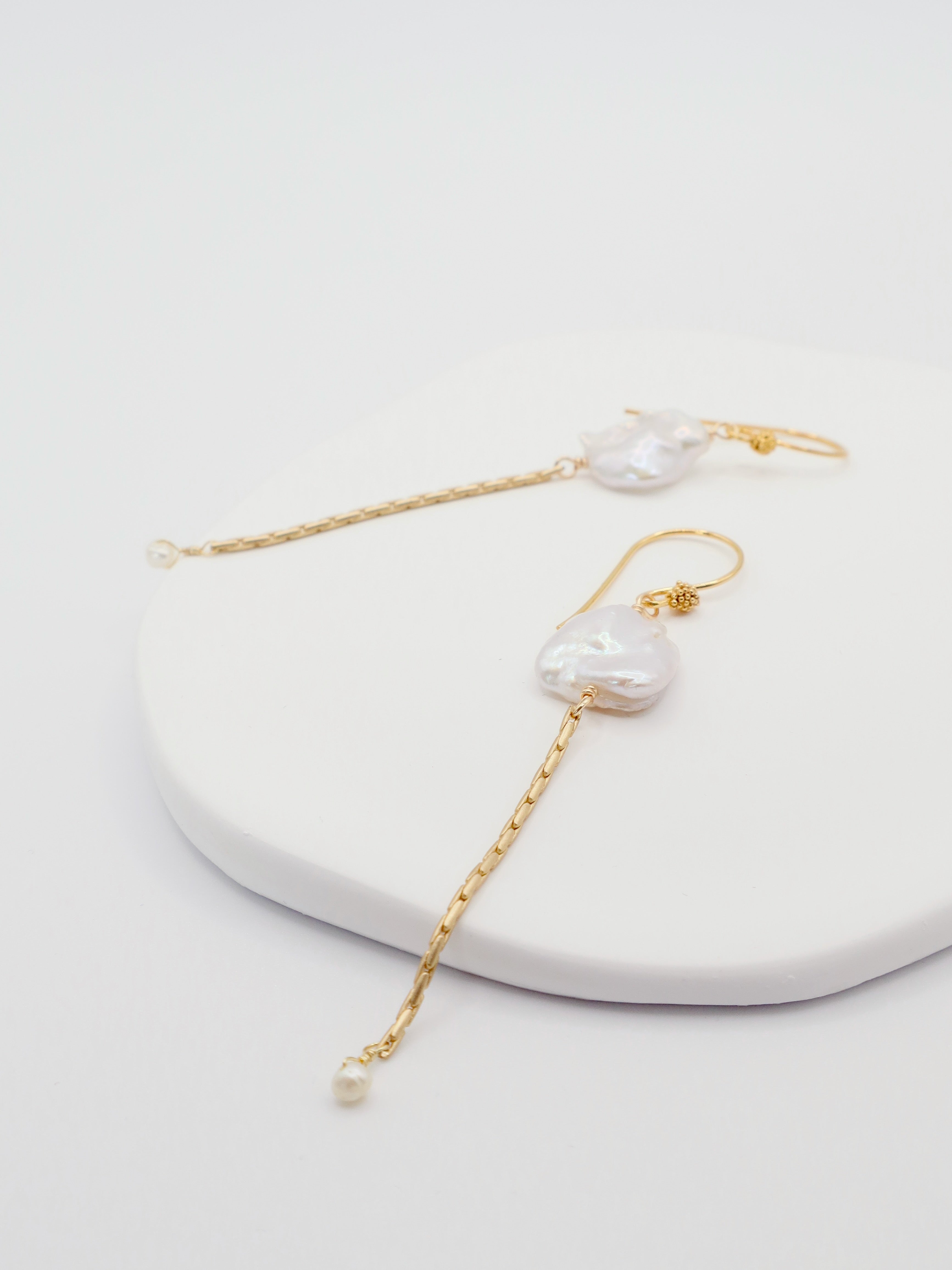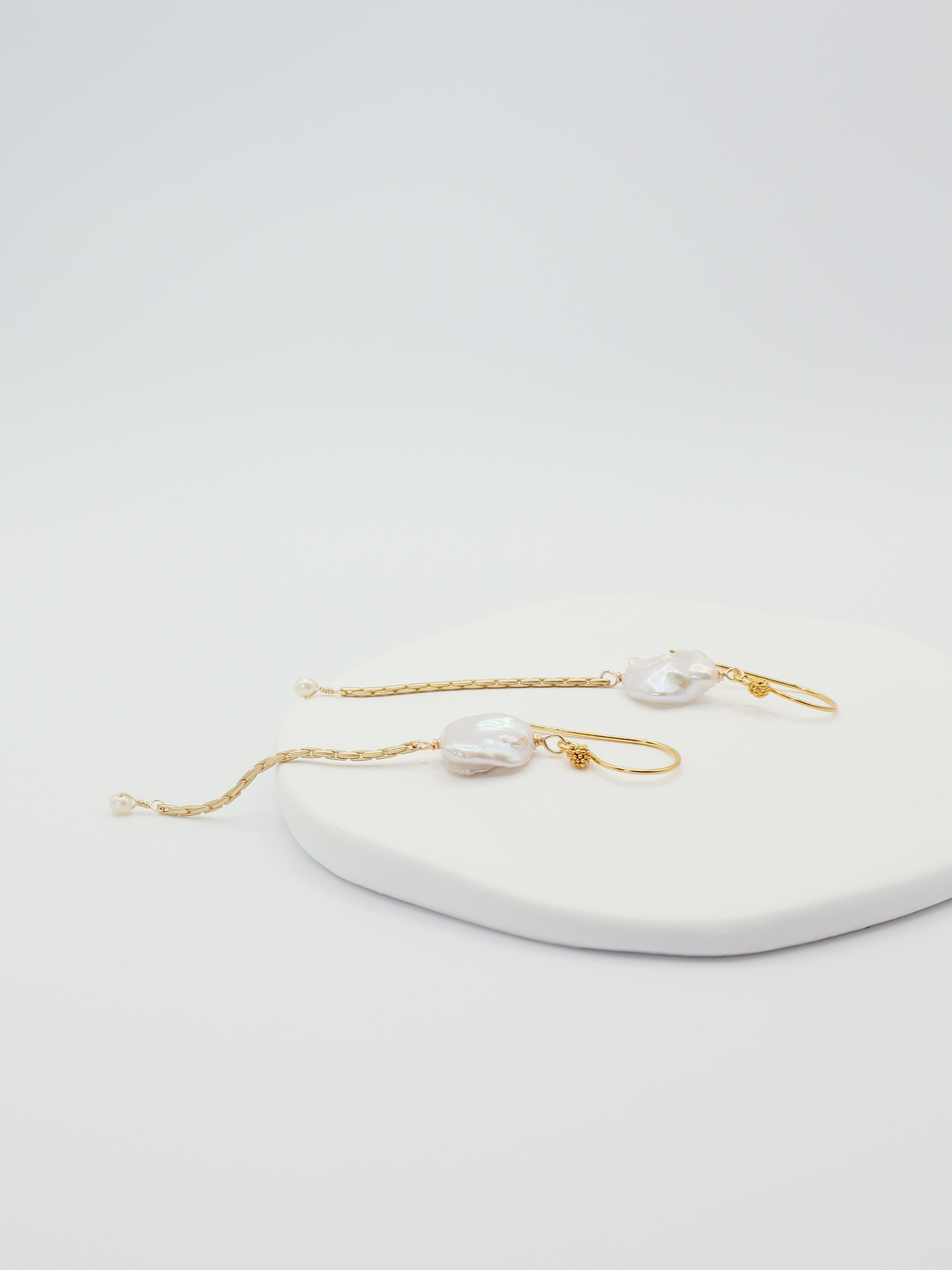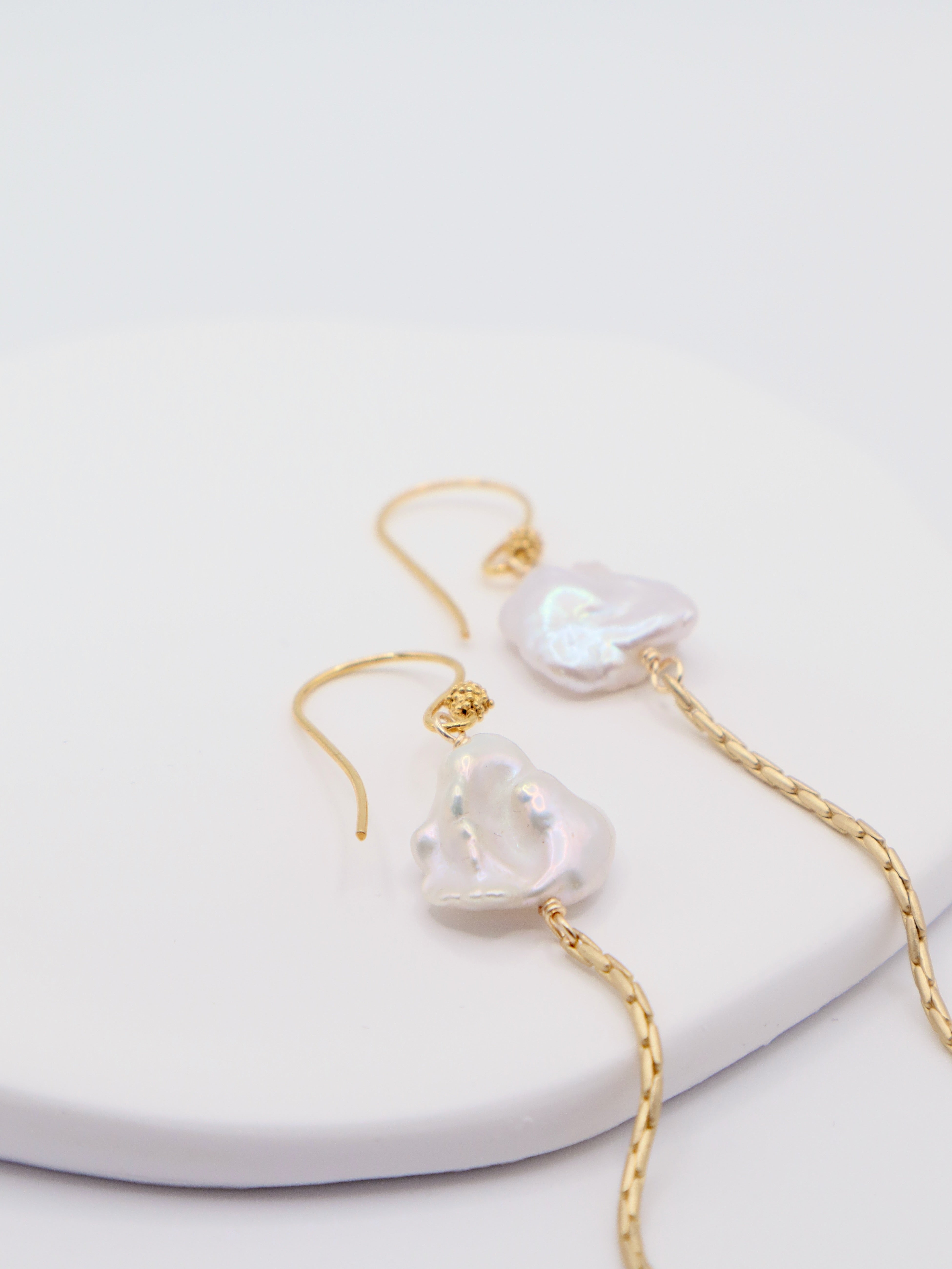 Embrace pure simplicity with the slinky pearl chain earrings, featuring a long matte gold-plated beading chain accented by lustrous freshwater baroque pearls.