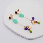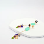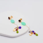 Our Carmel earrings are the perfect accessory for your outfit, featuring aqua glass lozenge beads, a fine gold filled chain, and a multi-coloured cluster drop with Swarovski crystal posts - so sparkly!