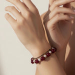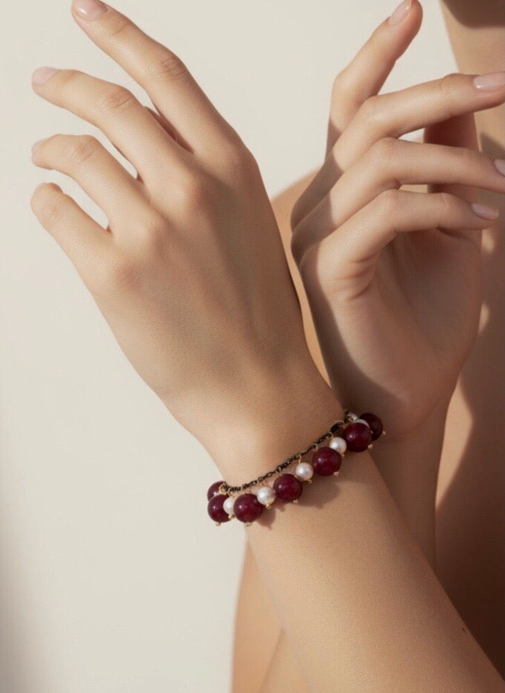 The Callie Bracelet brings richness and movement to your wrist with alternating burgundy shell pearls and luminous white crystal pearls, all set against a dark chain that adds a subtle edge.