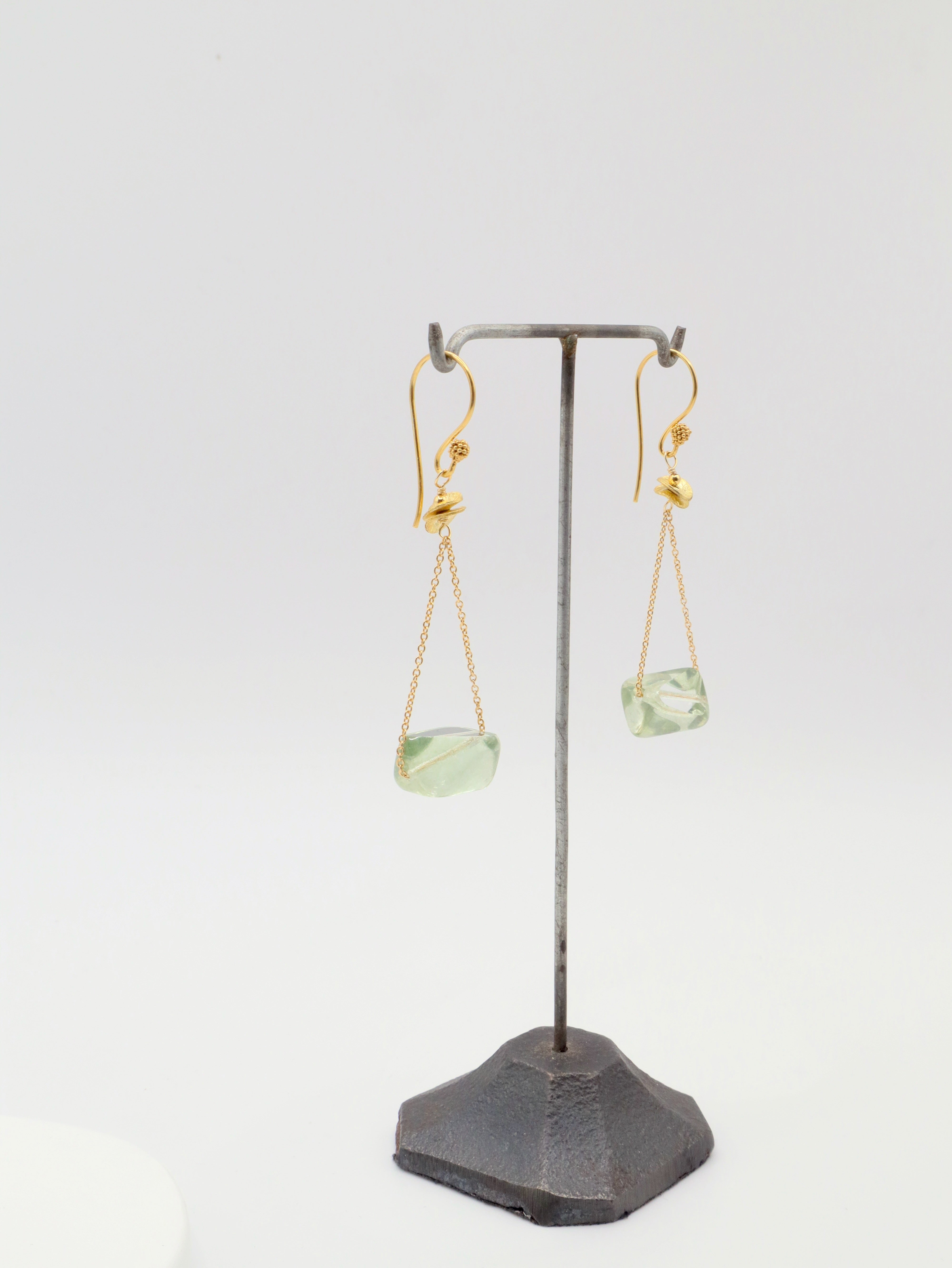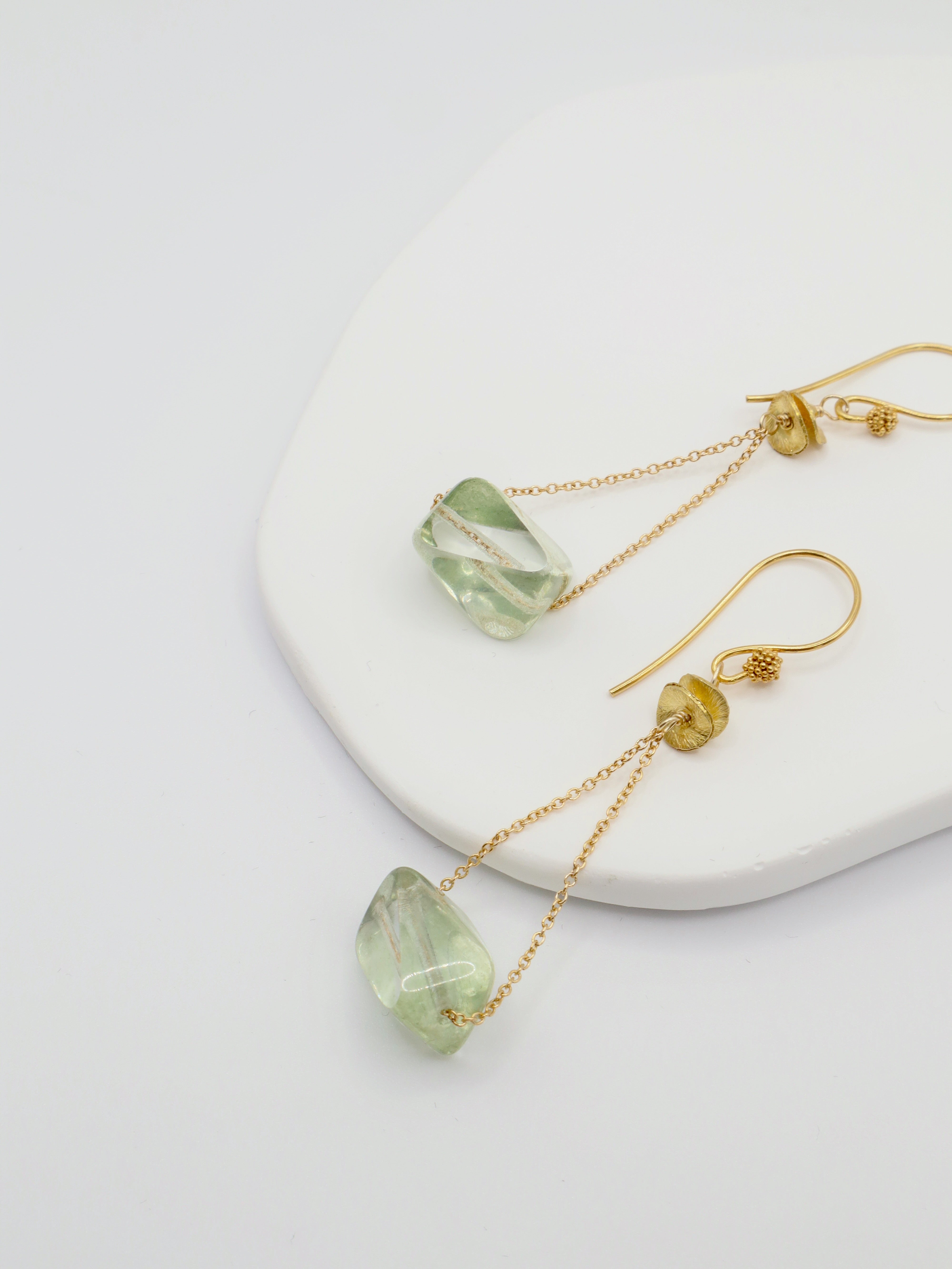 Dangling from vermeil wires are fine gold-filled chains, flowing down to shimmering drops of mint green glass stones.