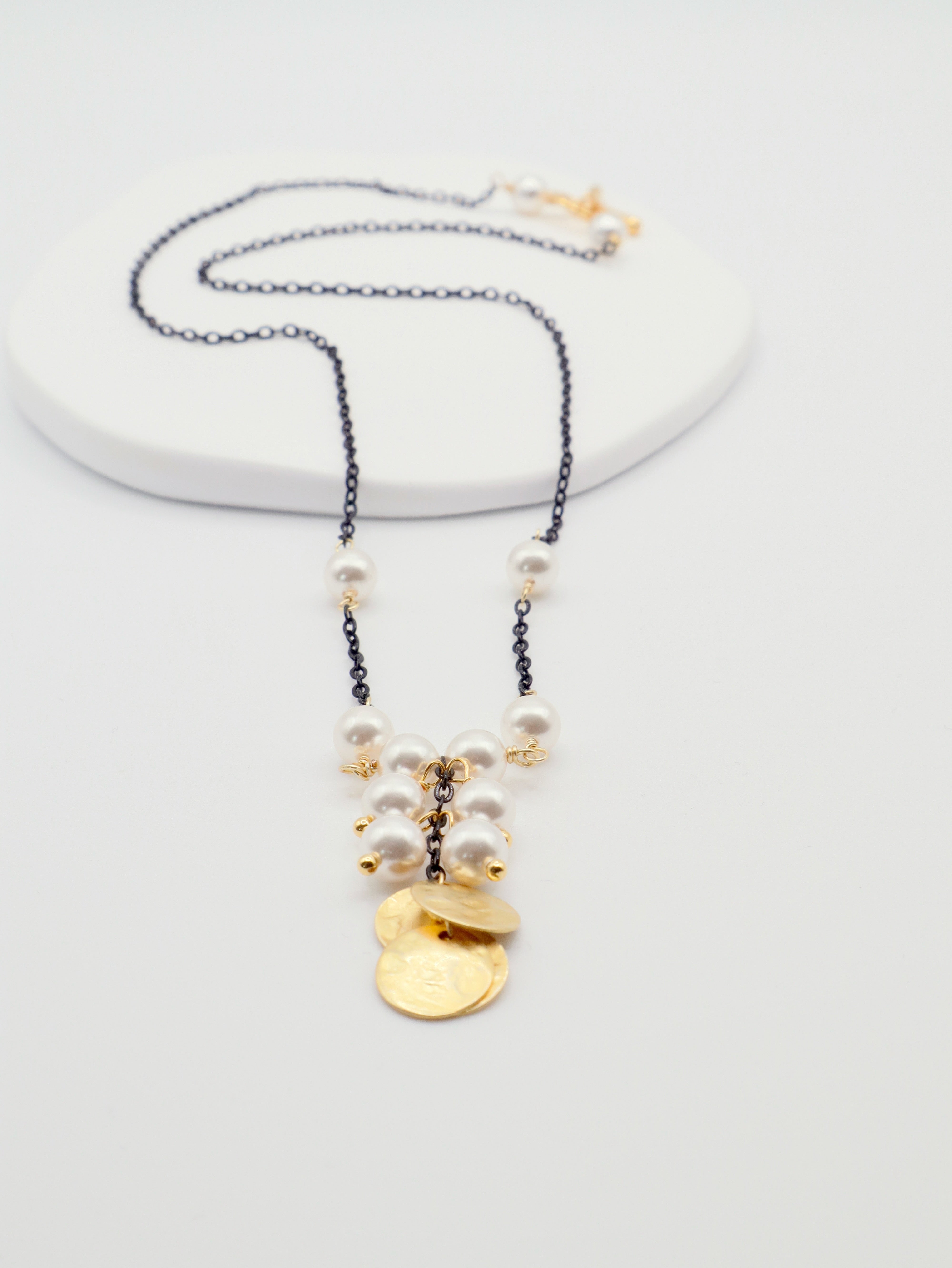 Strung with luminous white crystal pearls on a black chain, it’s finished with a soft cluster of pearls and hammered gold discs that add subtle movement and texture.