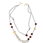 Featuring a mix of burgundy shell pearls, white crystal pearls, textured gold discs, and jet-black crystal accents, it’s artfully arranged along twin black chains for dimension and flow.