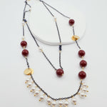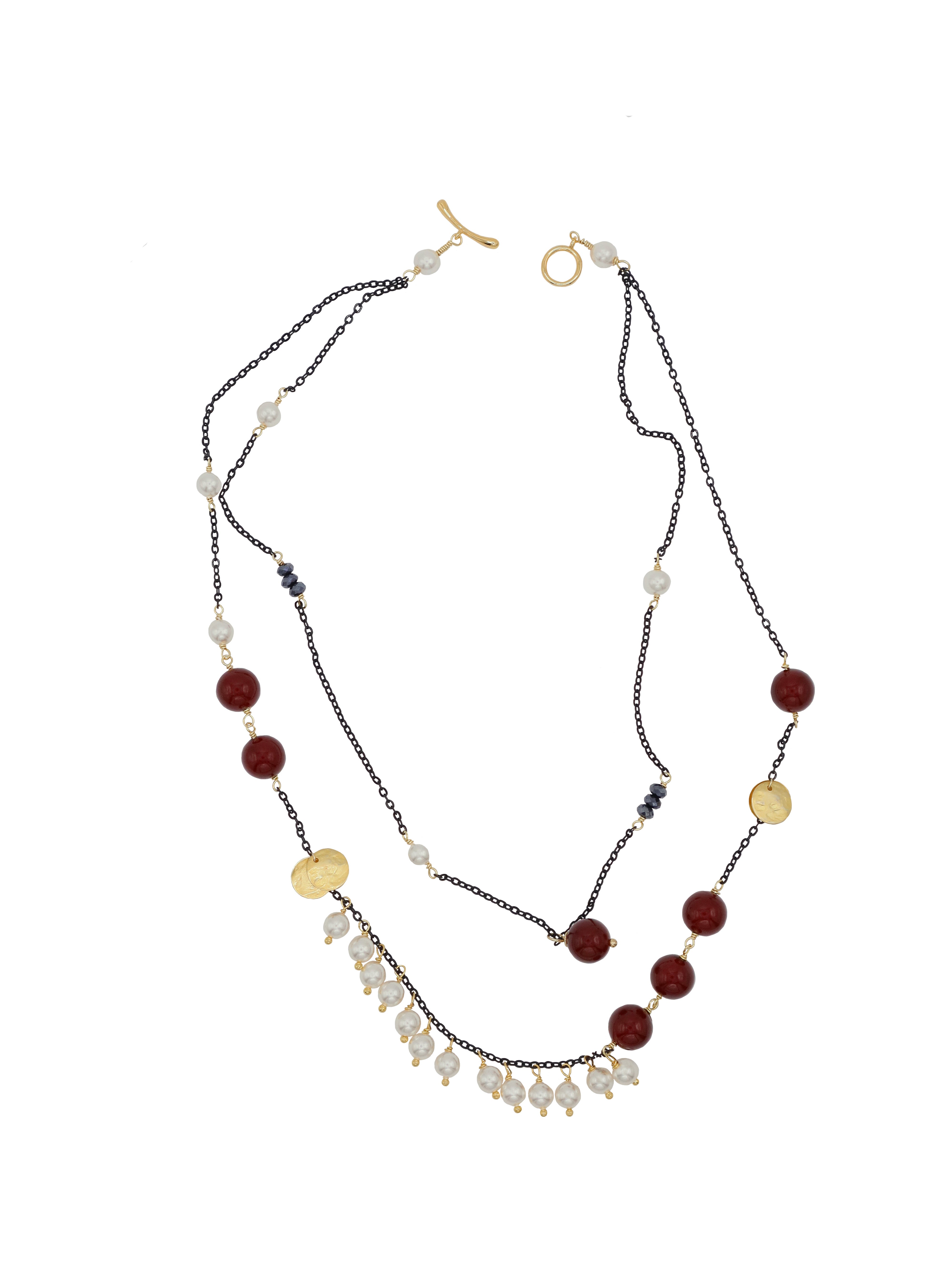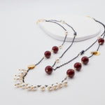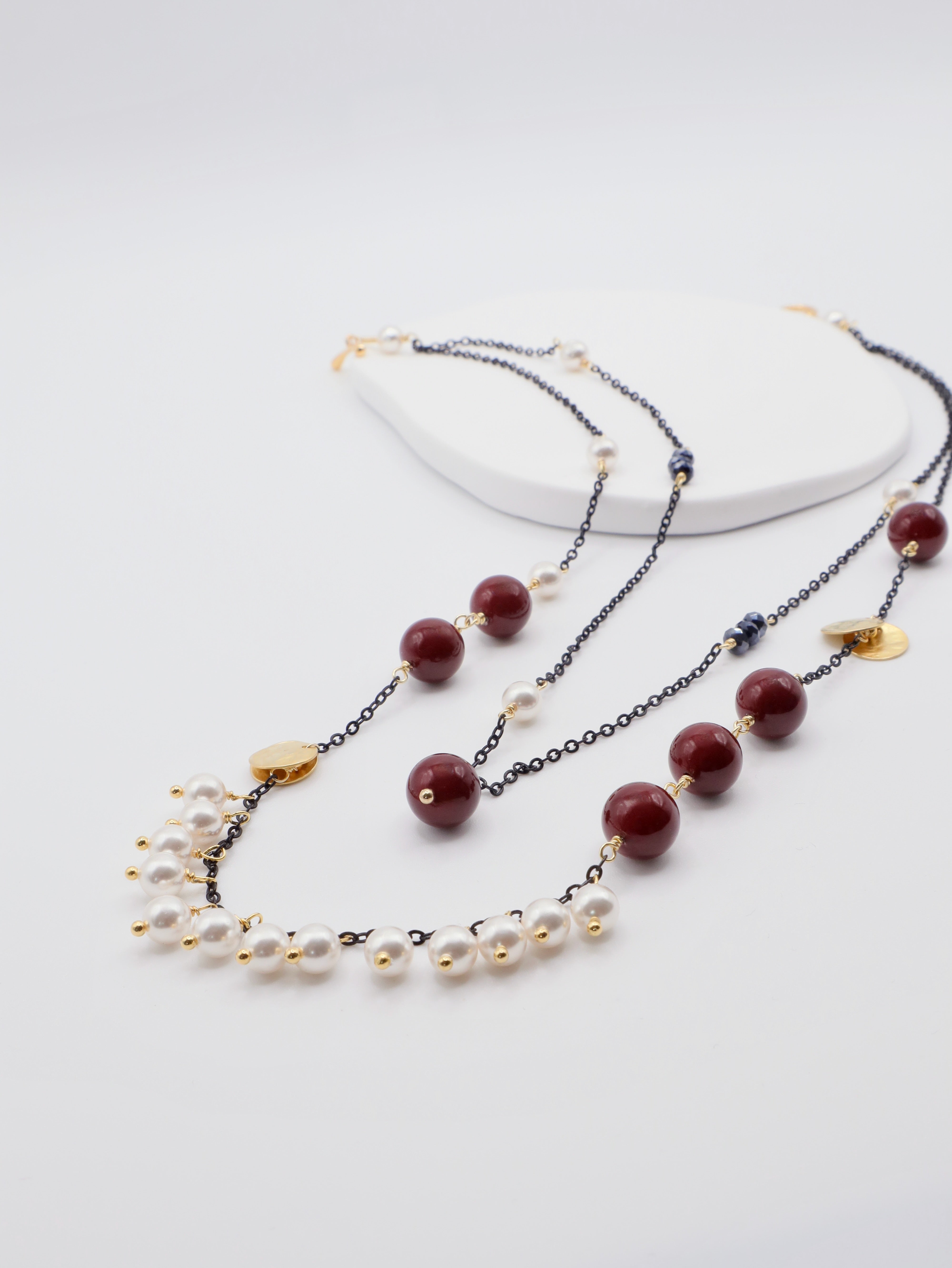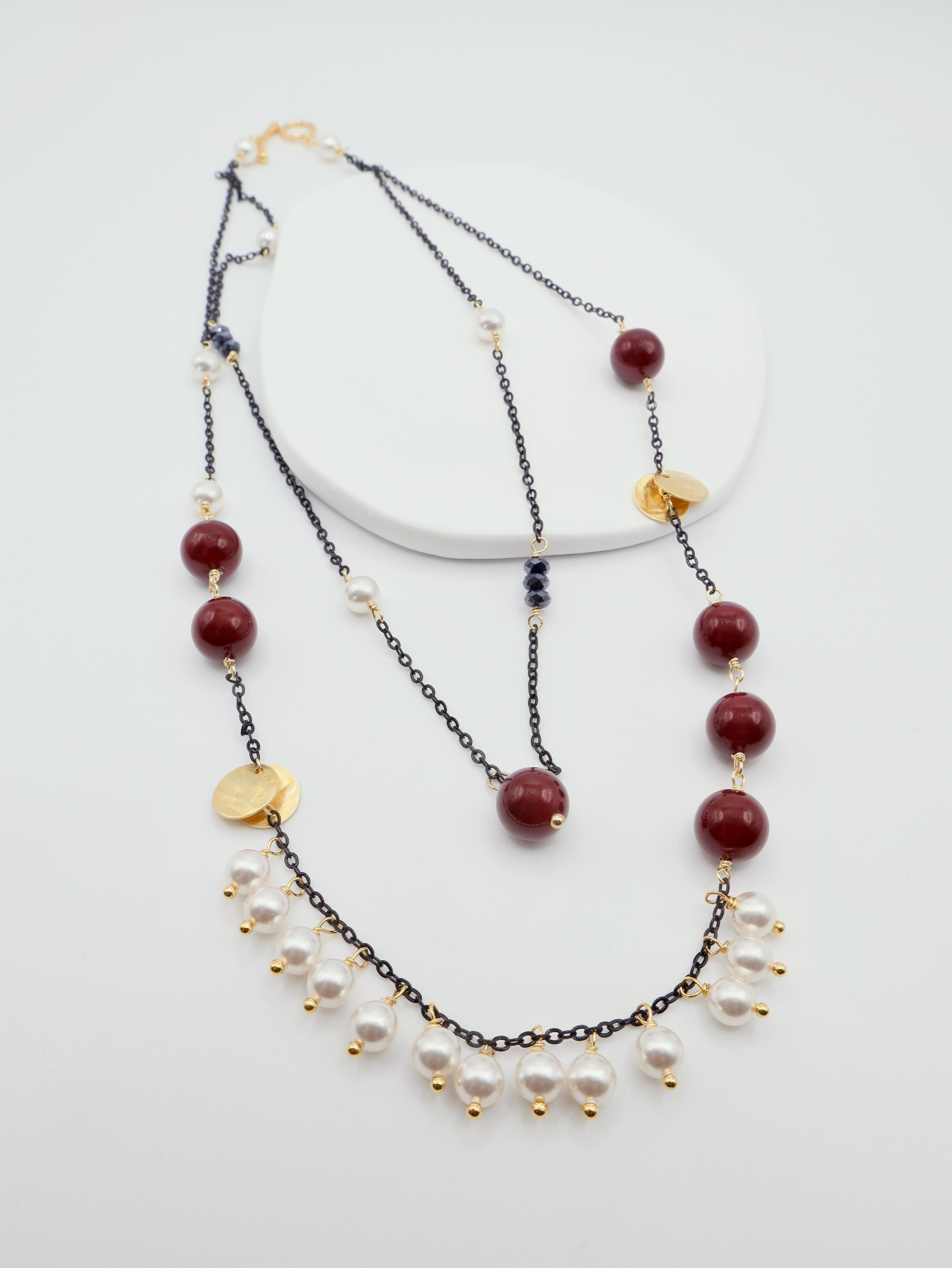 Two layered necklaces with burgundy shell pearls, black chain and gold accents on a white background