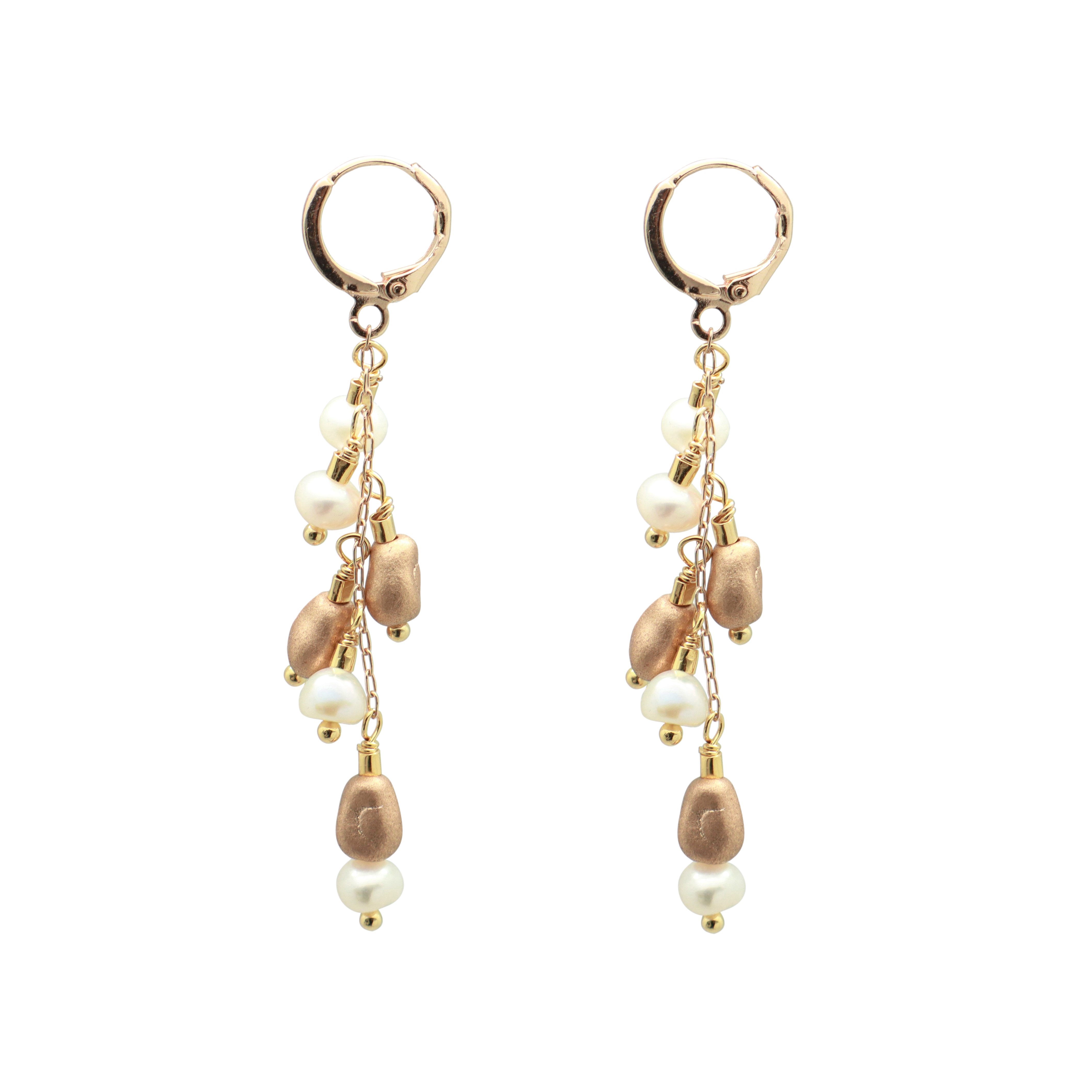 Featuring a cascade of lustrous freshwater pearls and delicate matte gold glass stones, these huggie earrings exude luxury and elegance.