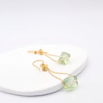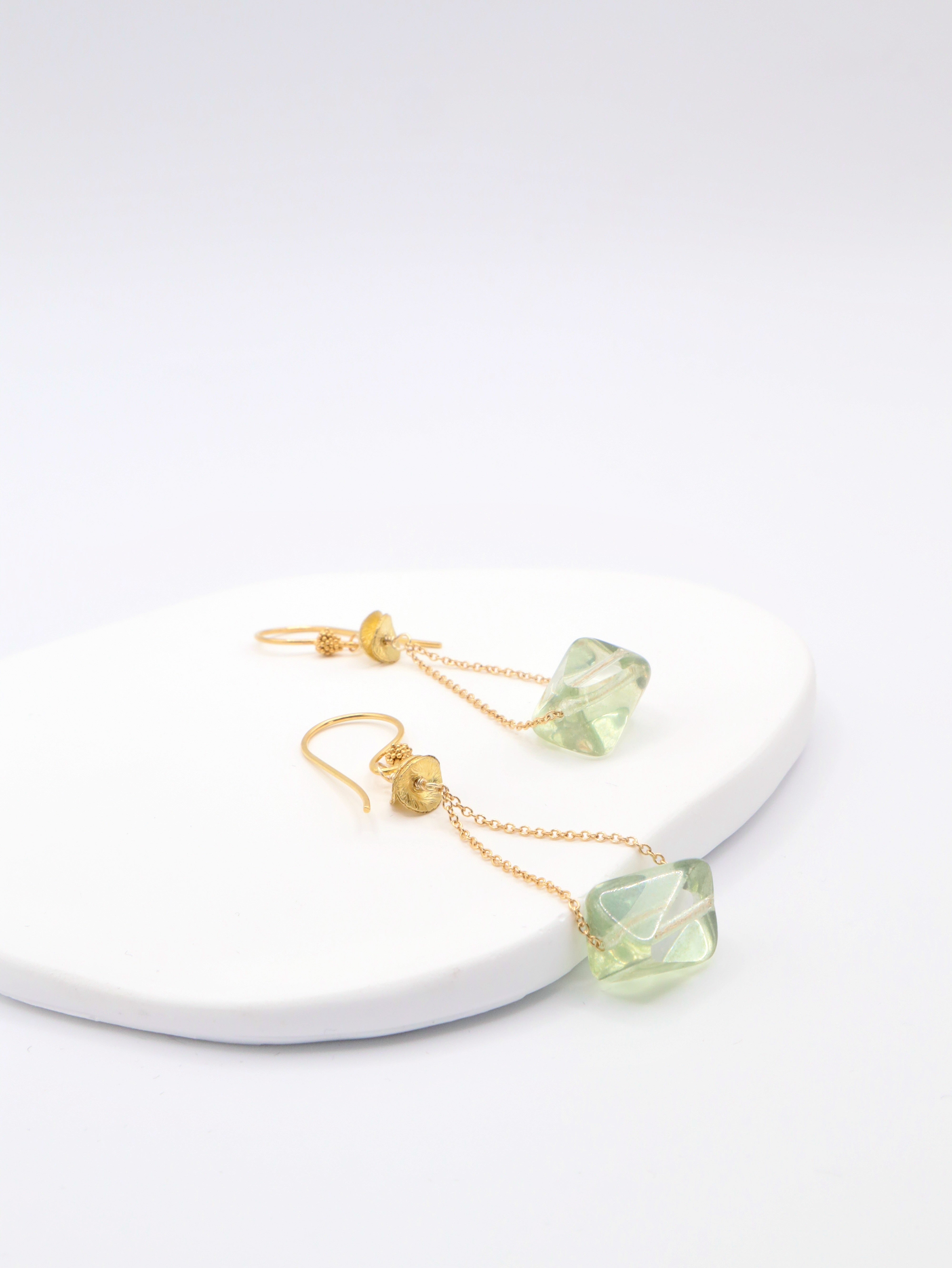 Dangling from vermeil wires are fine gold-filled chains, flowing down to shimmering drops of mint green glass stones.