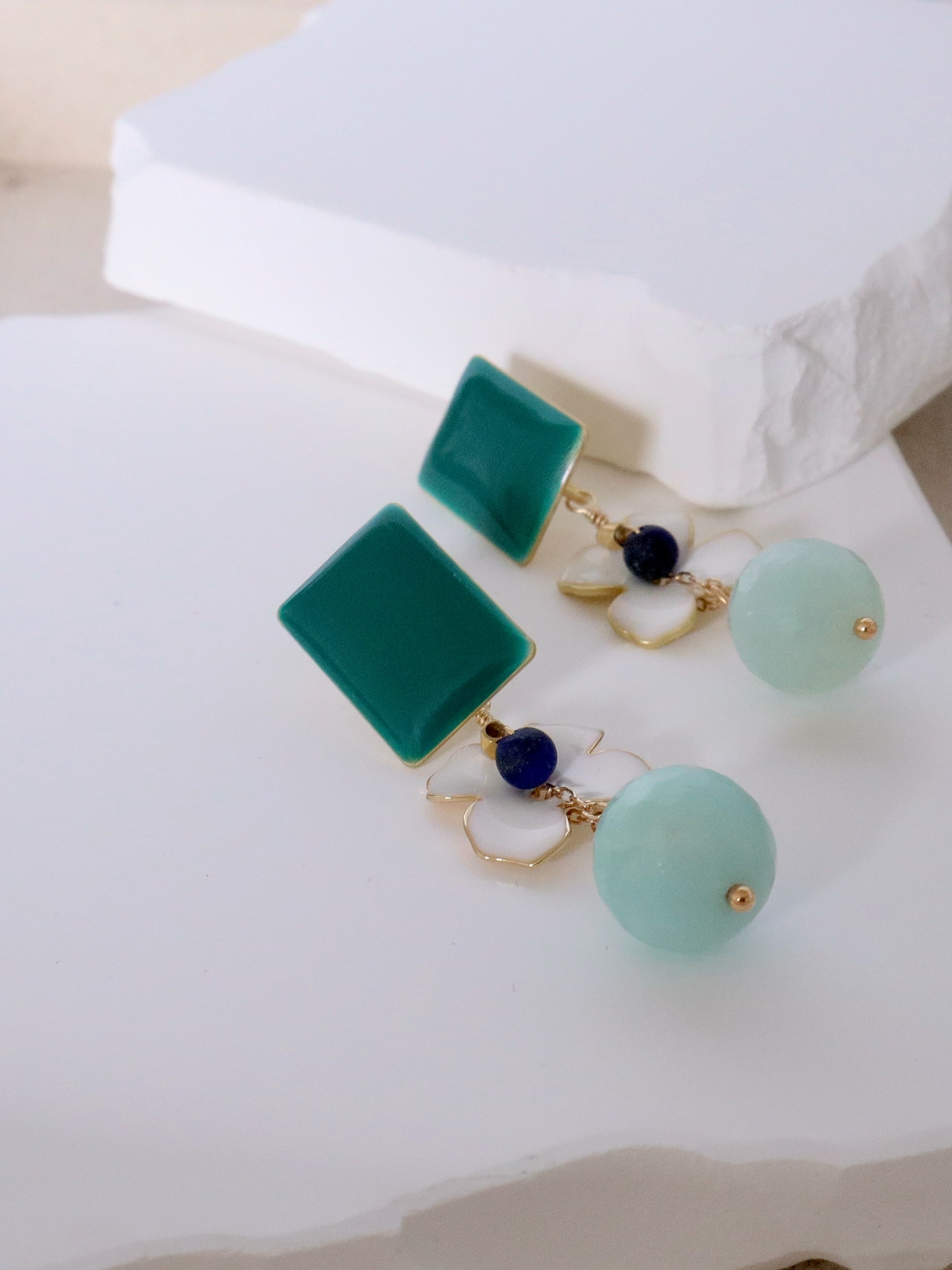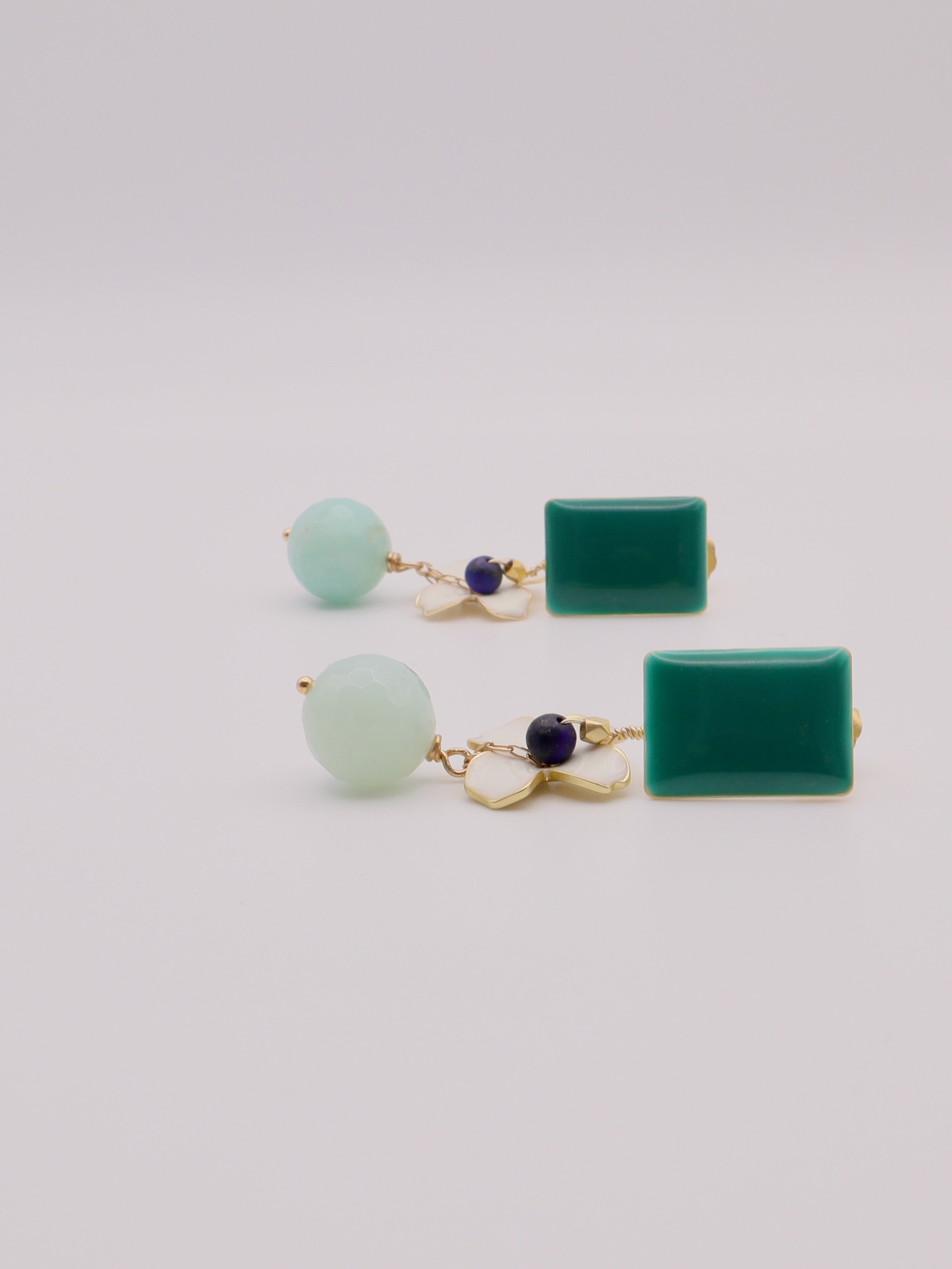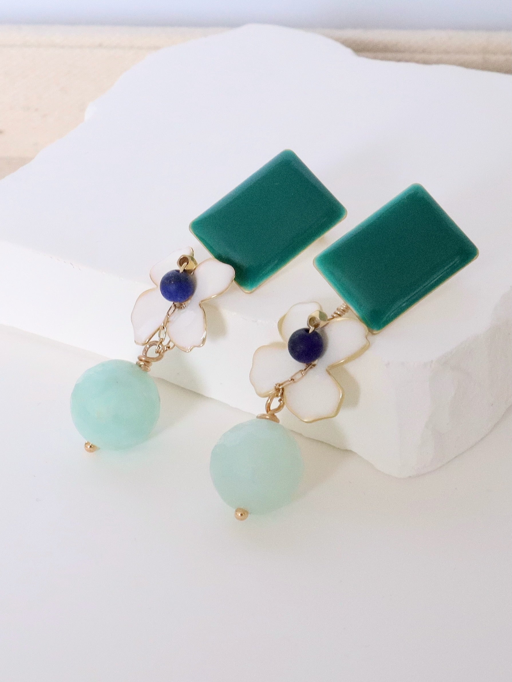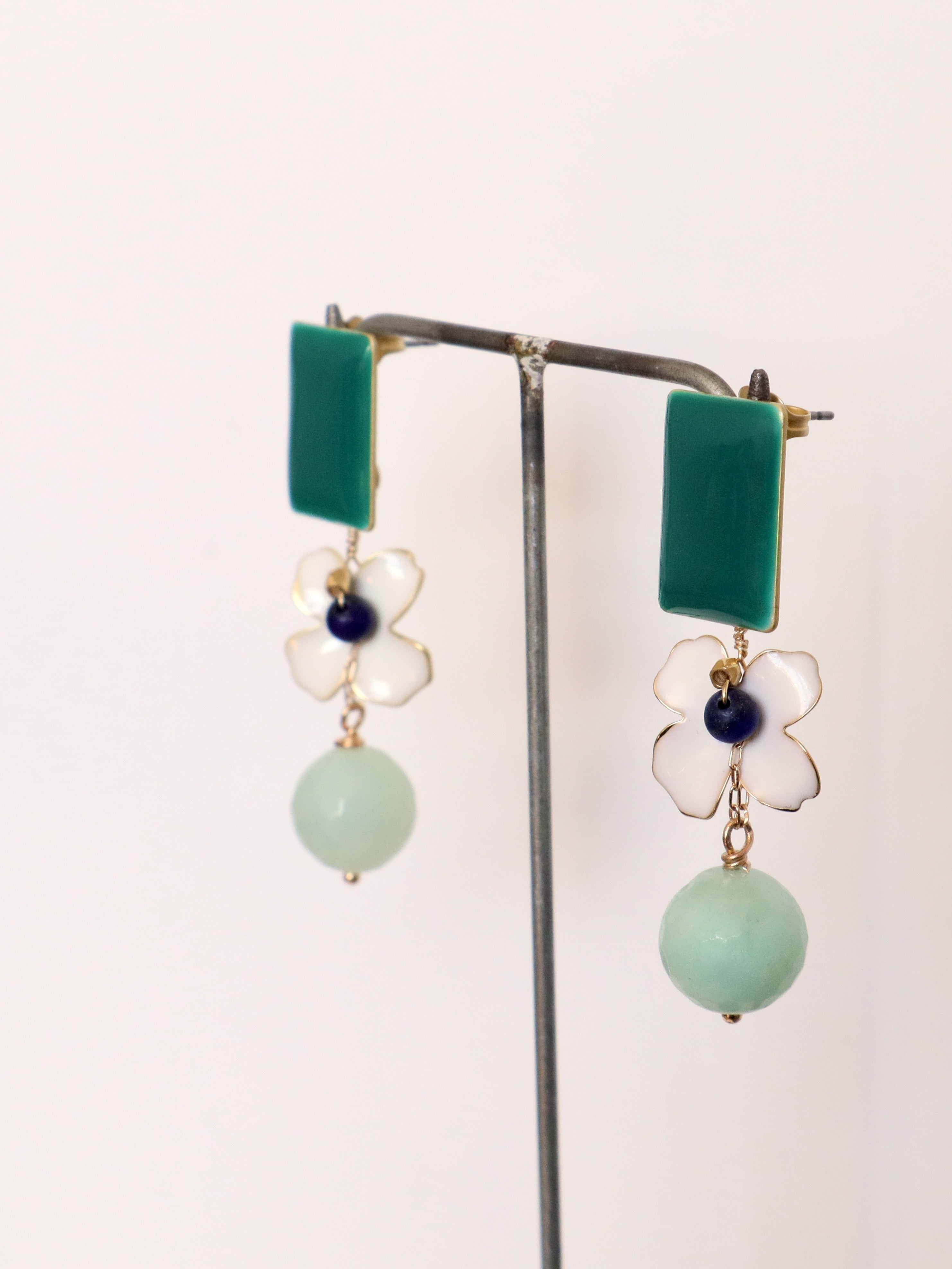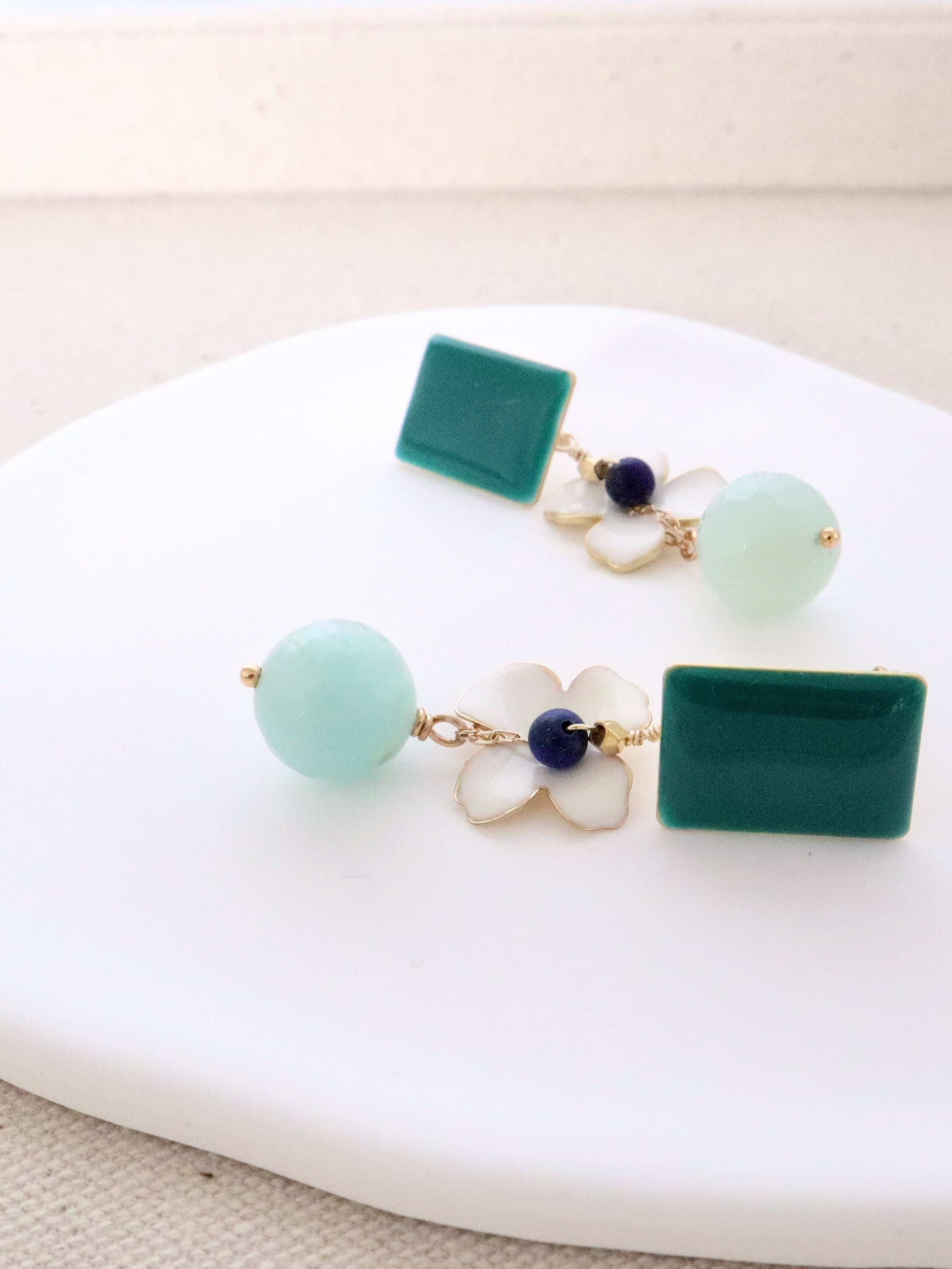 The Gabi earrings blend a cheerful floral motif with amazonite drops in teal, white, and aqua shades.