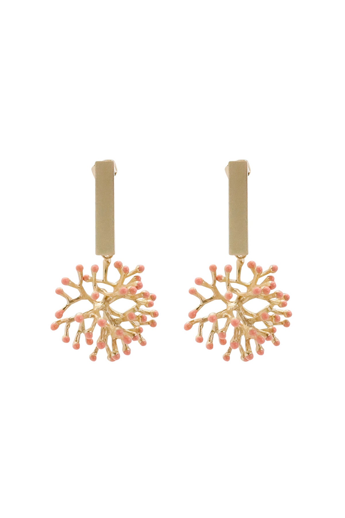 Coral reef charms cascade from matte gold-plated rectangular drops, fusing sculptural elements with nature-inspired touches.
