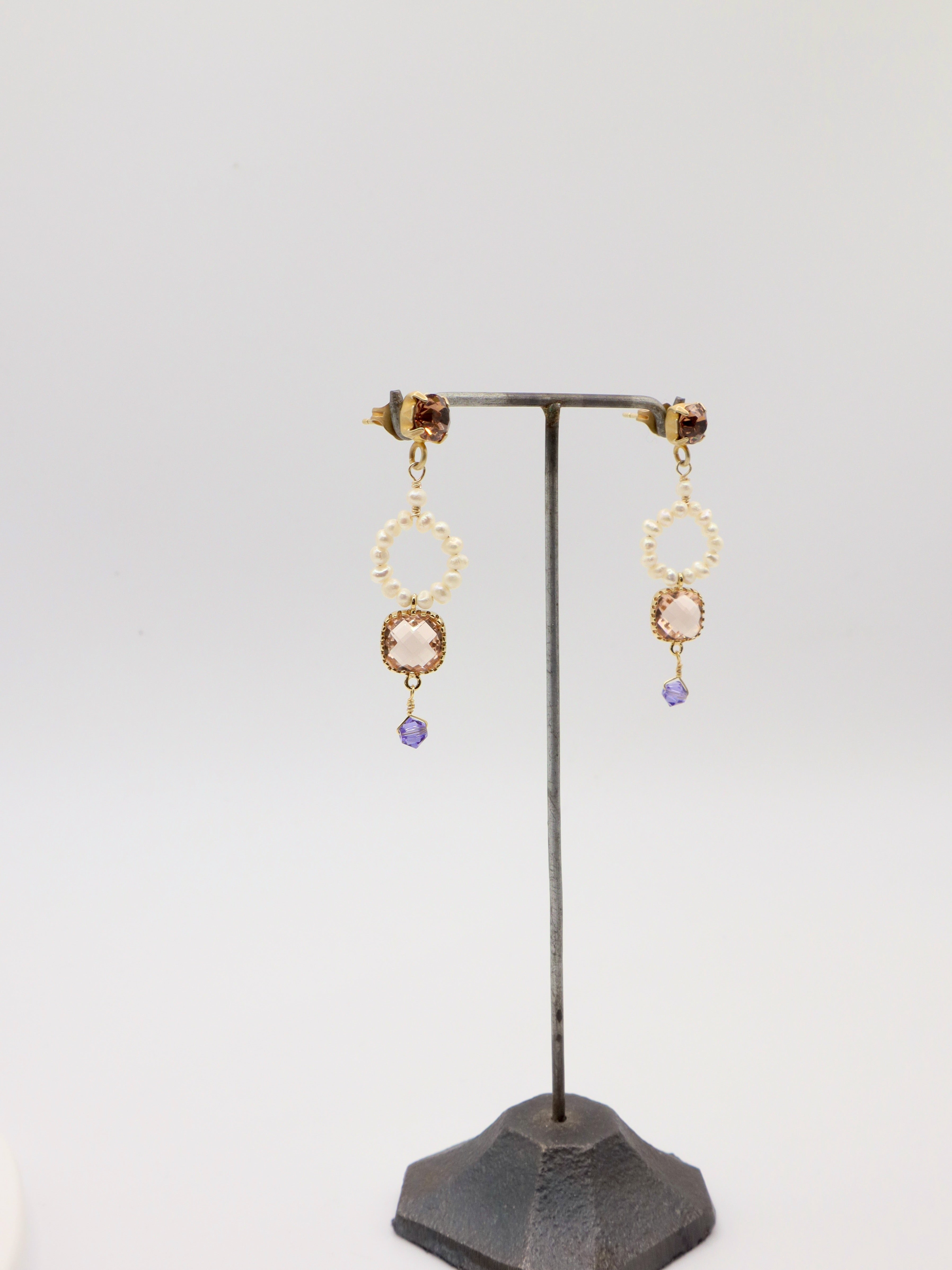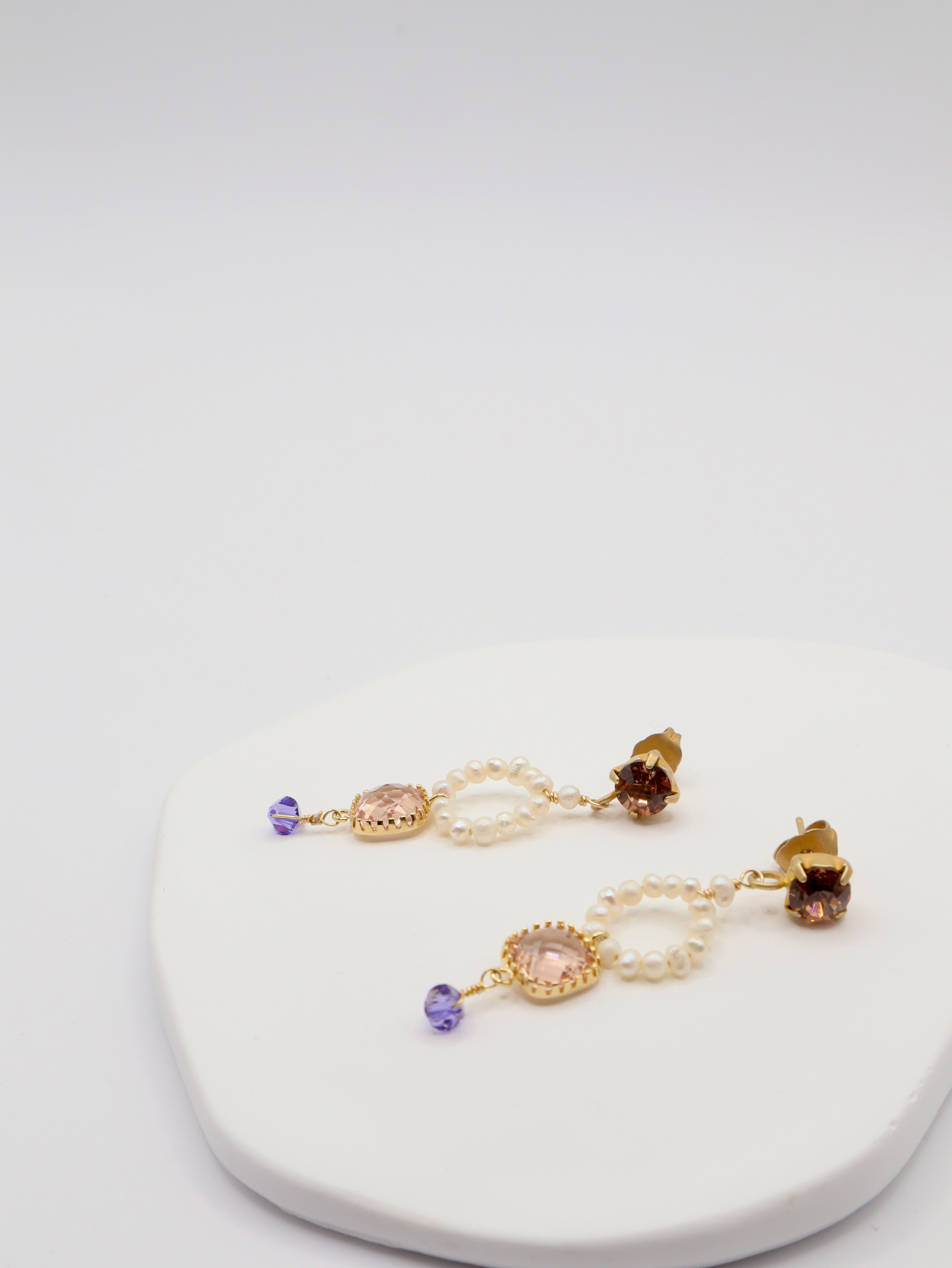Brimming with charm, the pair is secured by topaz studs, winding down to freshwater pearl loops and glimmering peach square drops.