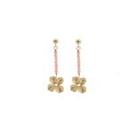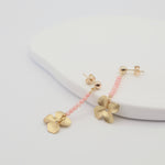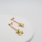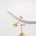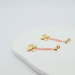 Coral beaded line stud earrings with a matte gold flower drop. Assembled by hand in our Dublin studio.