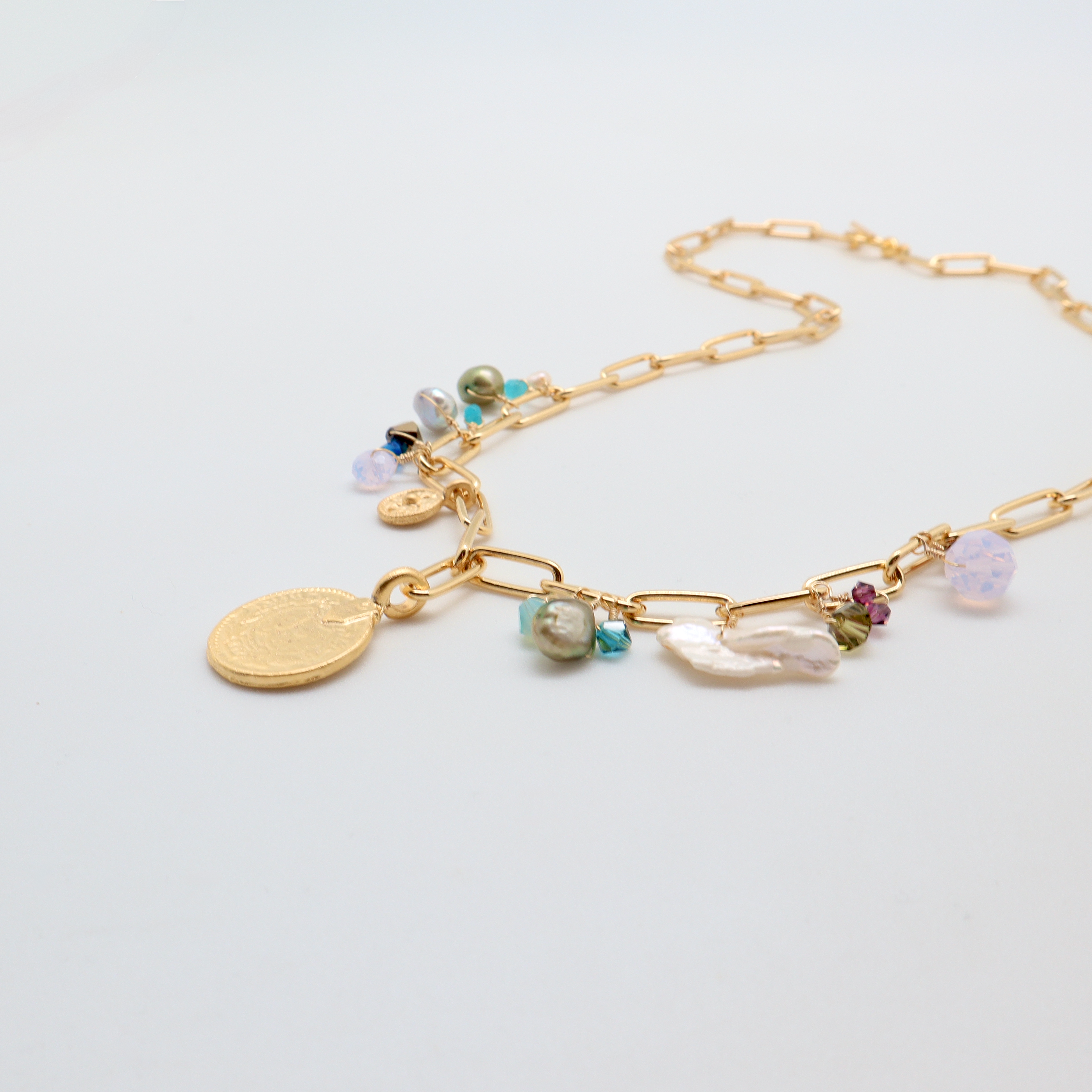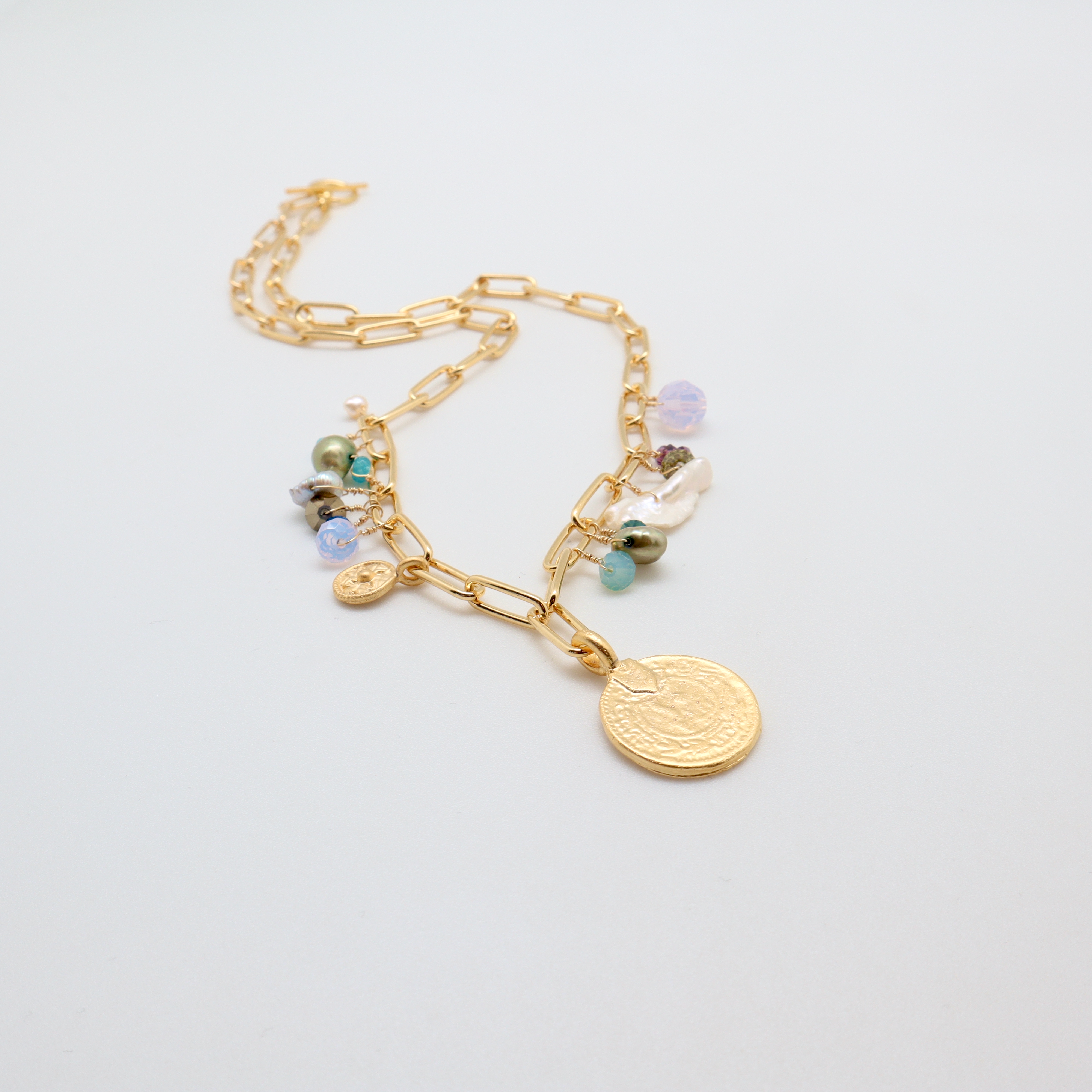 This exquisite piece features a delicate gold link chain with a stunning medallion pendant.