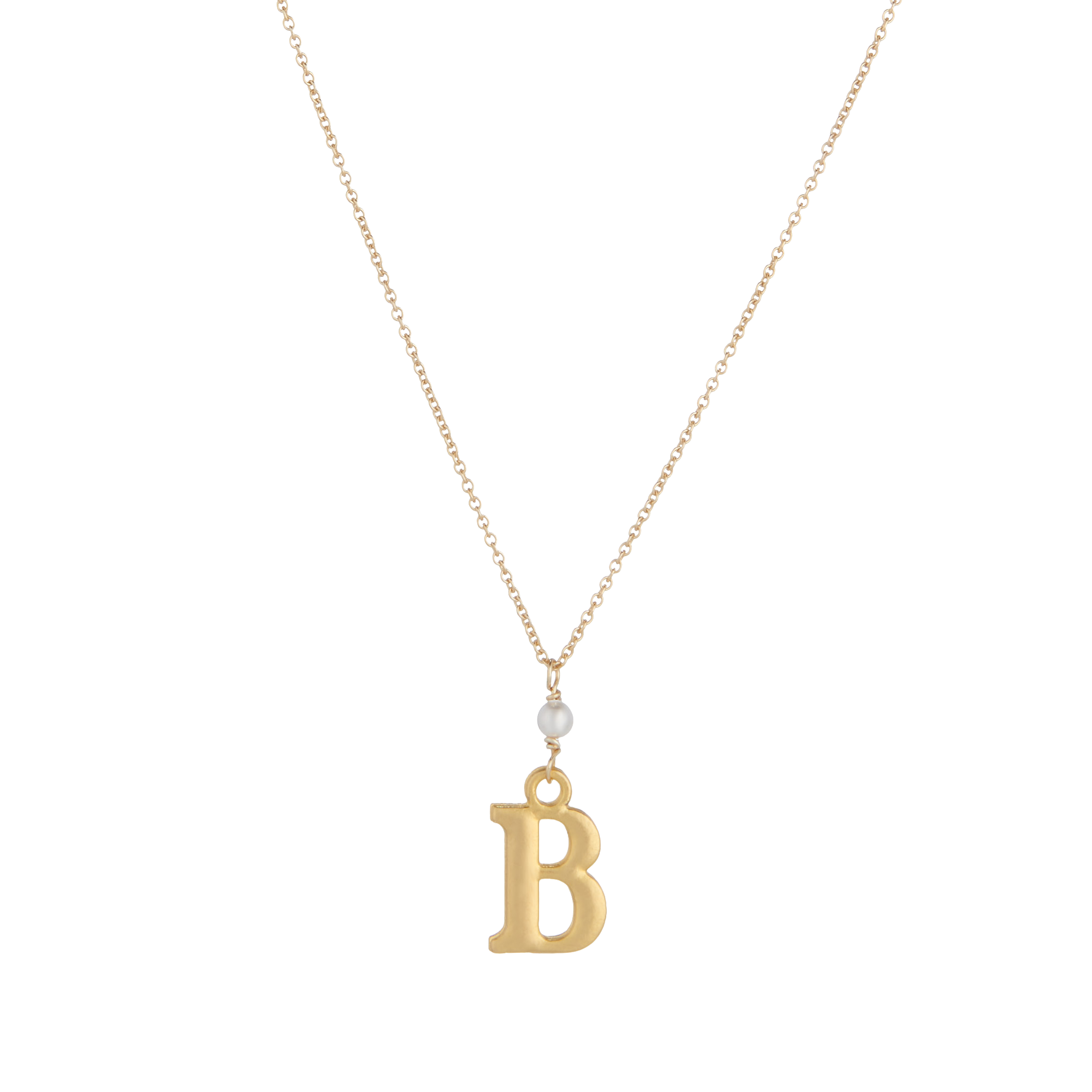 Matte gold plated "B" initial charm necklace. It is suspended on a Swarovski crystal pearl from our classic gold filled chain and closes with a mini toggle clasp surrounded by two little pearls.