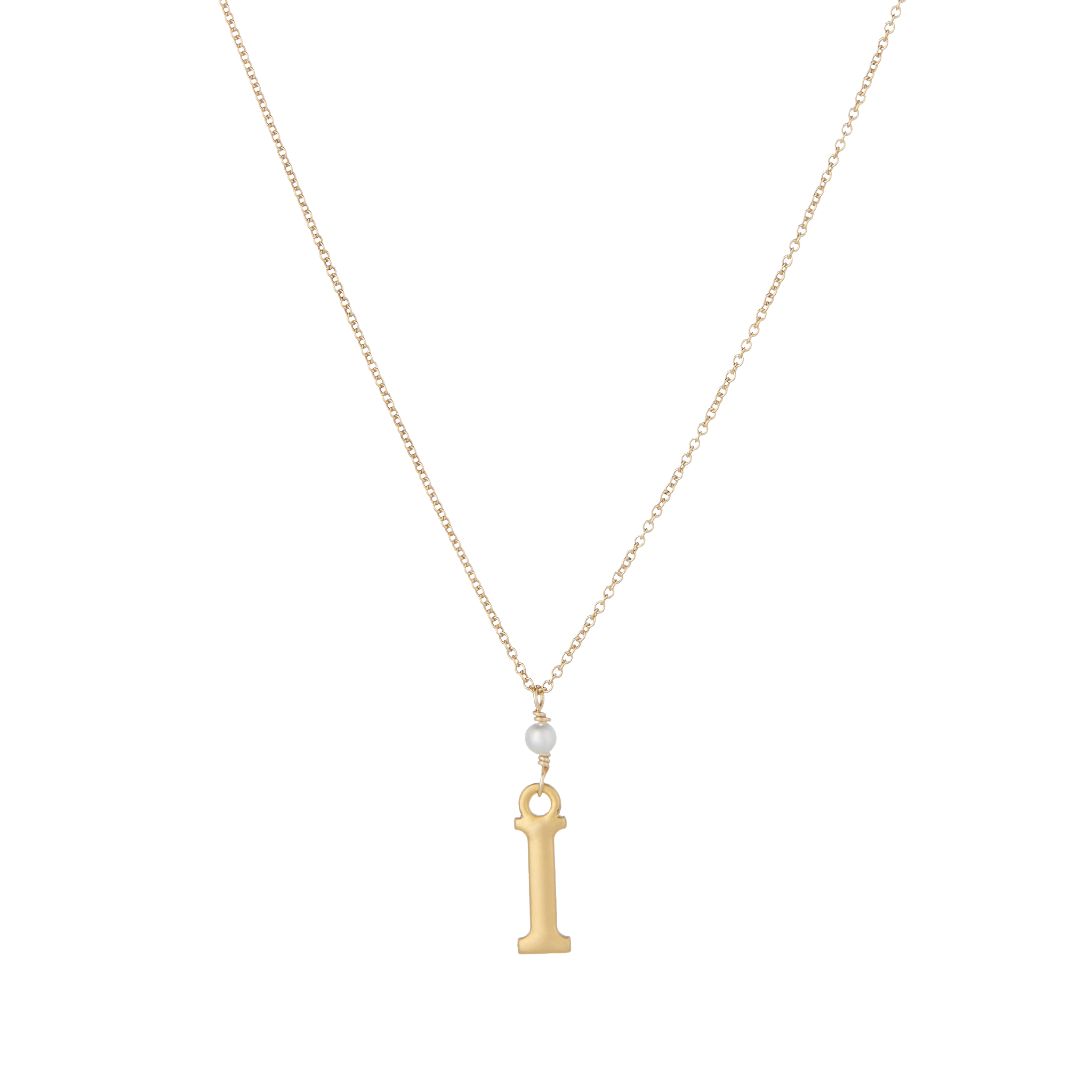 Matte gold plated "I" initial charm necklace. It is suspended on a Swarovski crystal pearl from our classic gold filled chain and closes with a mini toggle clasp surrounded by two little pearls.