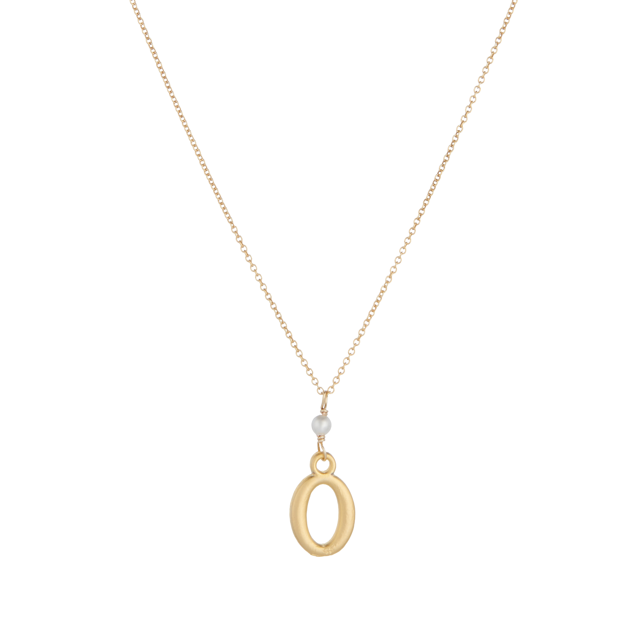 Matte gold plated "O" initial charm necklace. It is suspended on a Swarovski crystal pearl from our classic gold filled chain and closes with a mini toggle clasp surrounded by two little pearls.