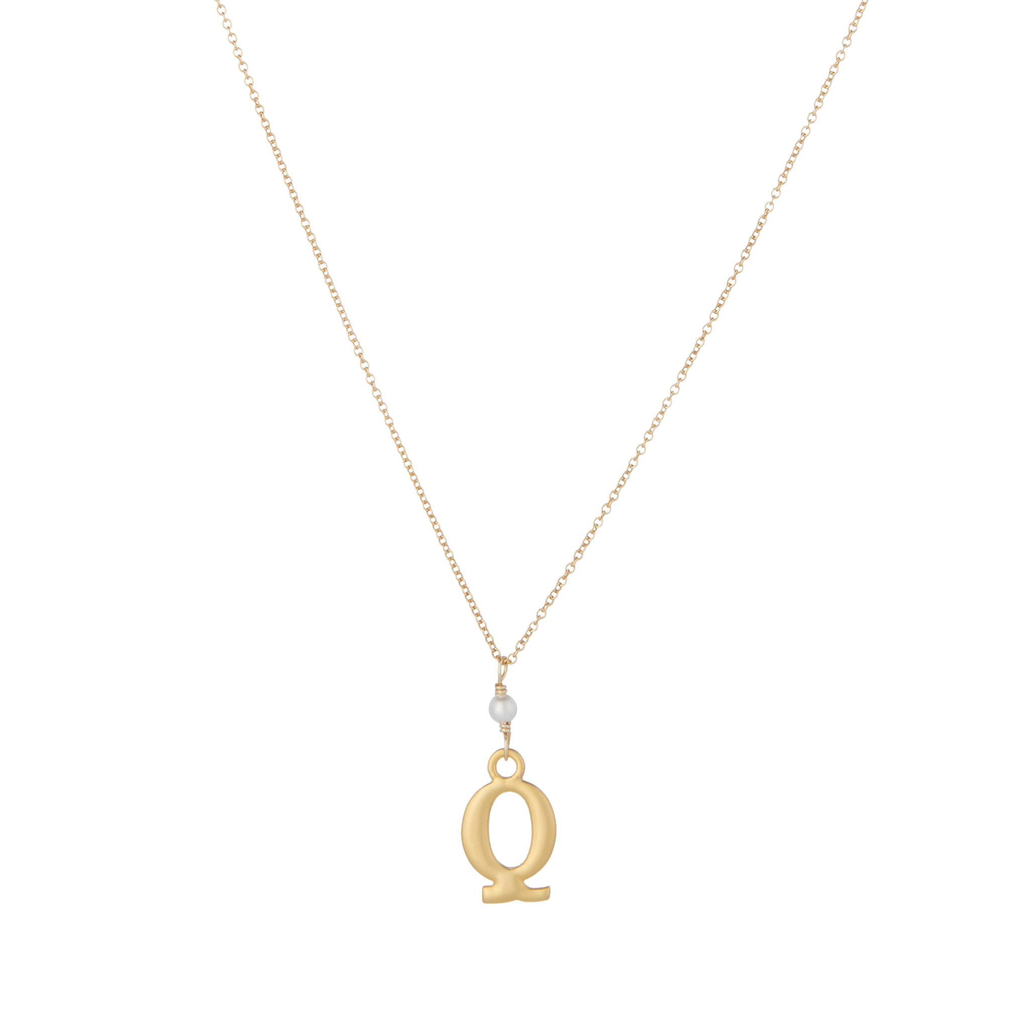 Matte gold plated "Q" initial charm necklace. It is suspended on a Swarovski crystal pearl from our classic gold filled chain and closes with a mini toggle clasp surrounded by two little pearls.