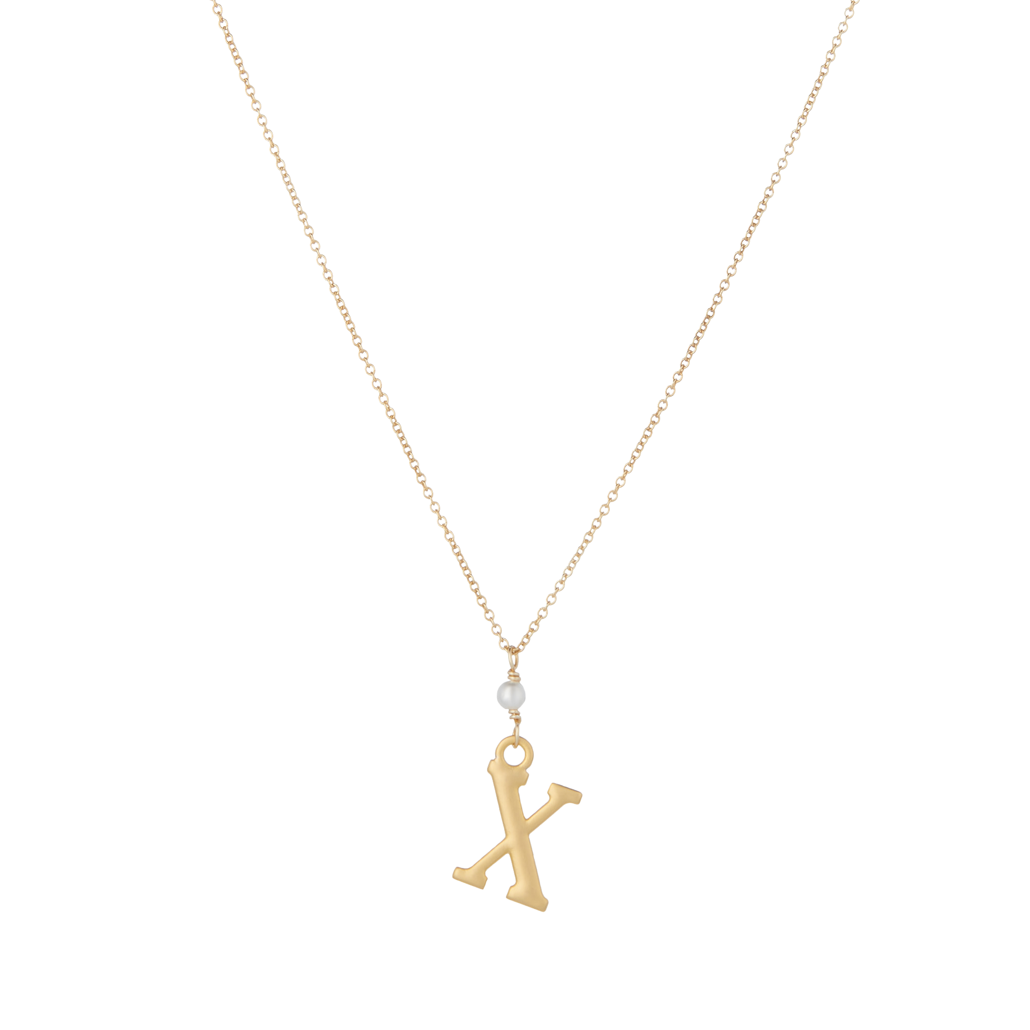 Matte gold plated "X" initial charm necklace. It is suspended on a Swarovski crystal pearl from our classic gold filled chain and closes with a mini toggle clasp surrounded by two little pearls.