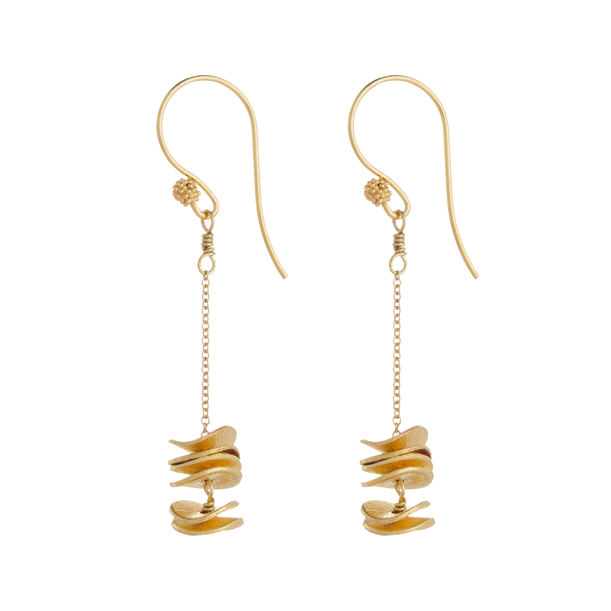 Gold plated curved discs hang from a fine chain attached to vermeil ear wires.