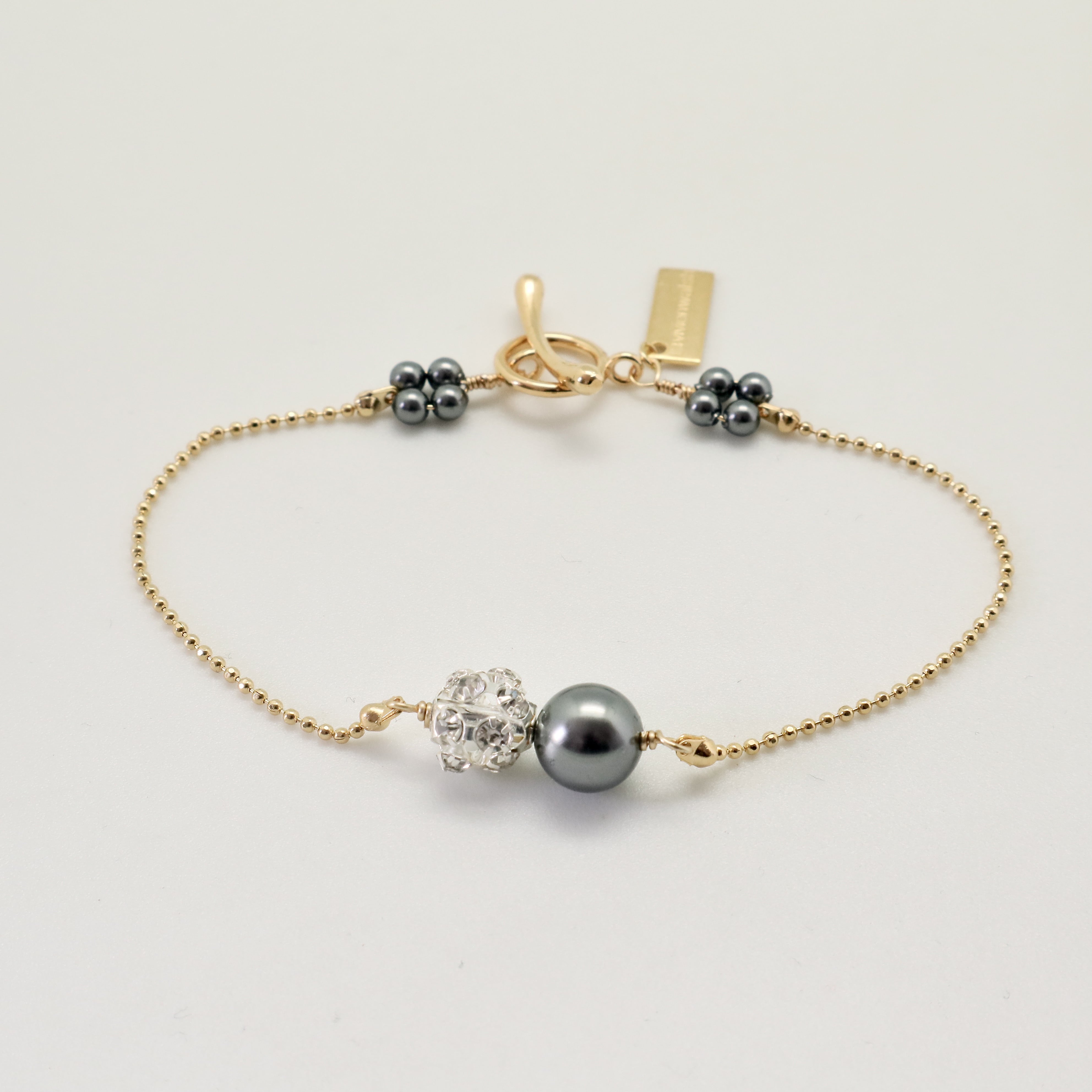 This modern minimalist chain bracelet is adorned with elegant grey pearls and a sparkling rhinestone ball for a touch of glamour.