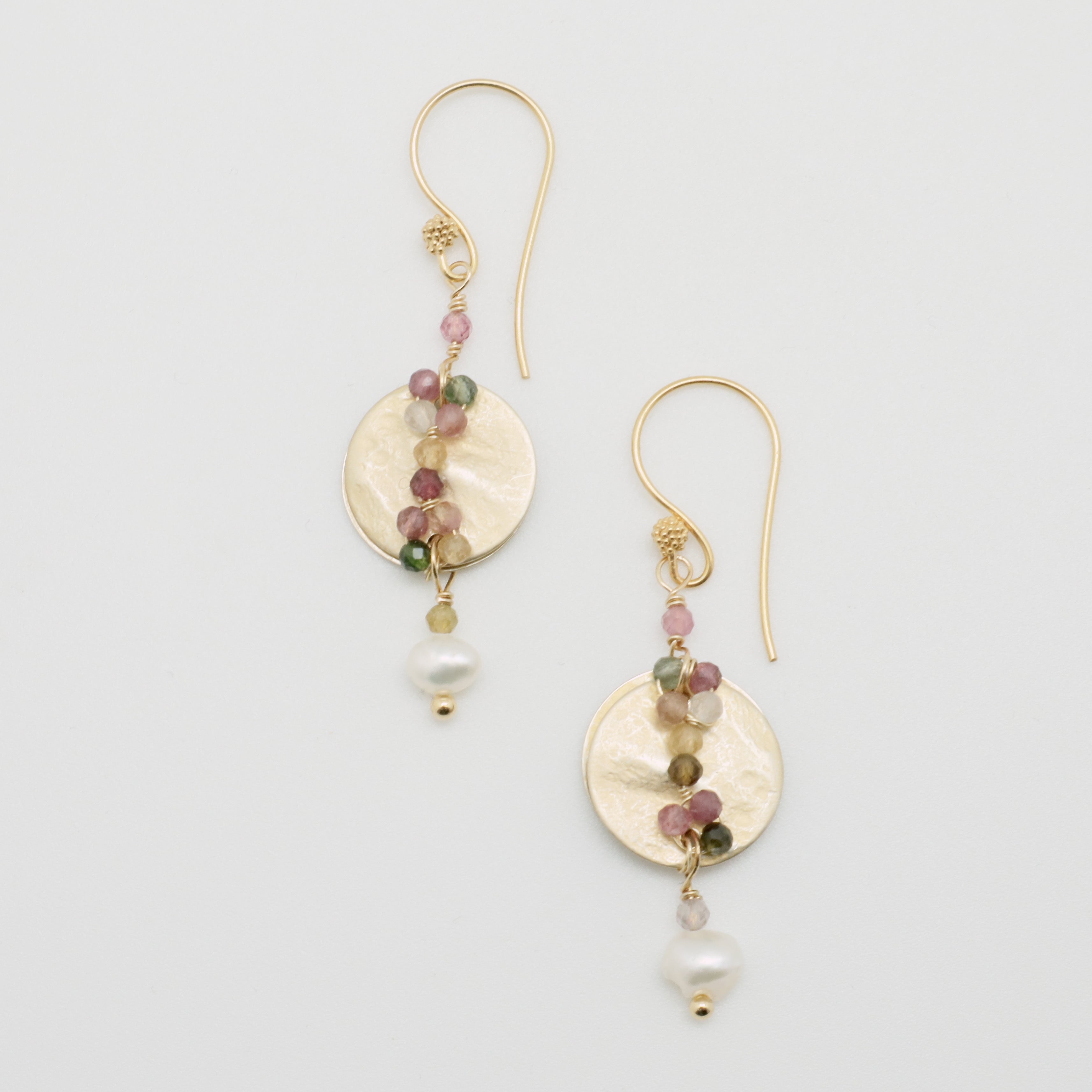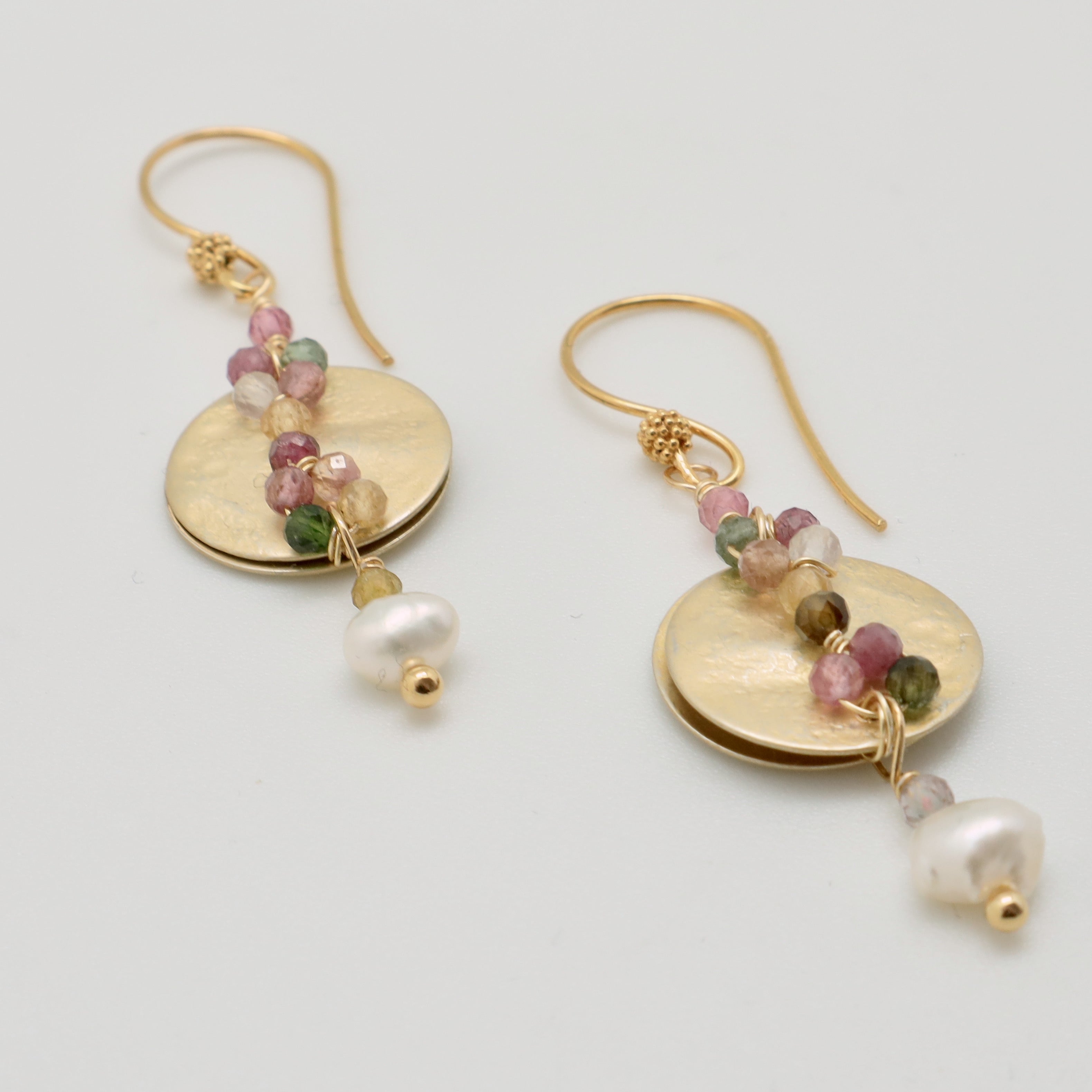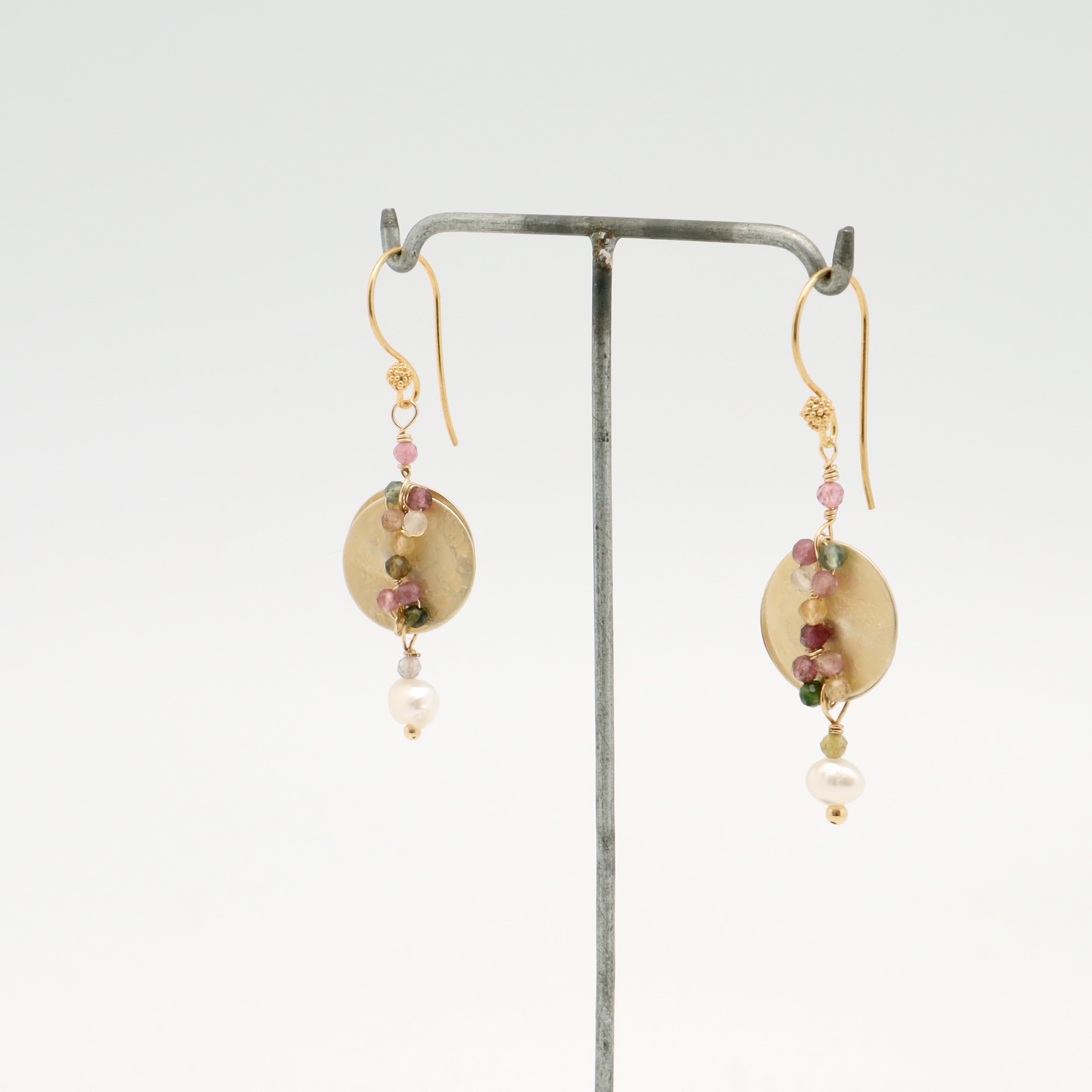 These stunning hammered disc earrings feature gorgeous multi coloured tourmalines and a delicate freshwater pearl drop.