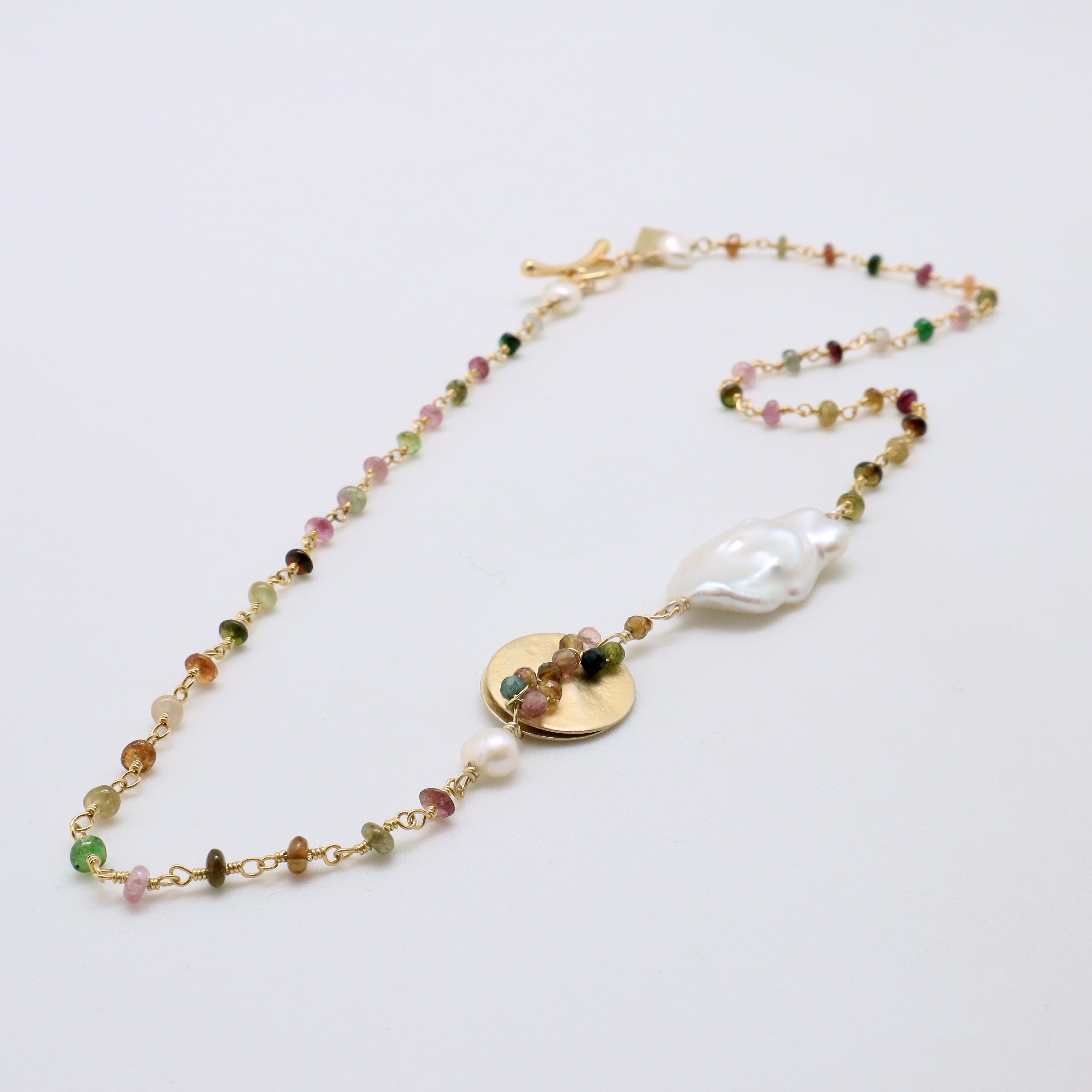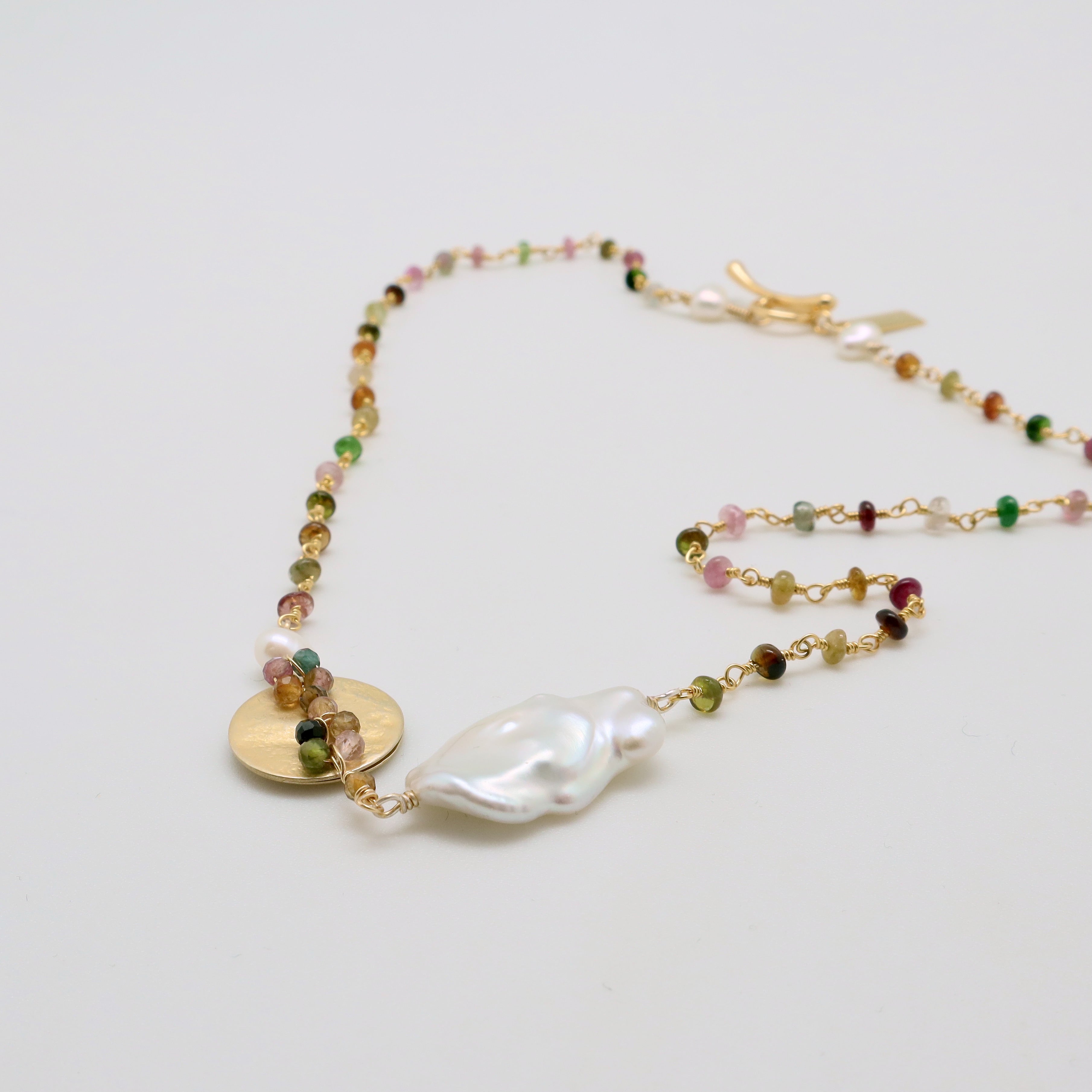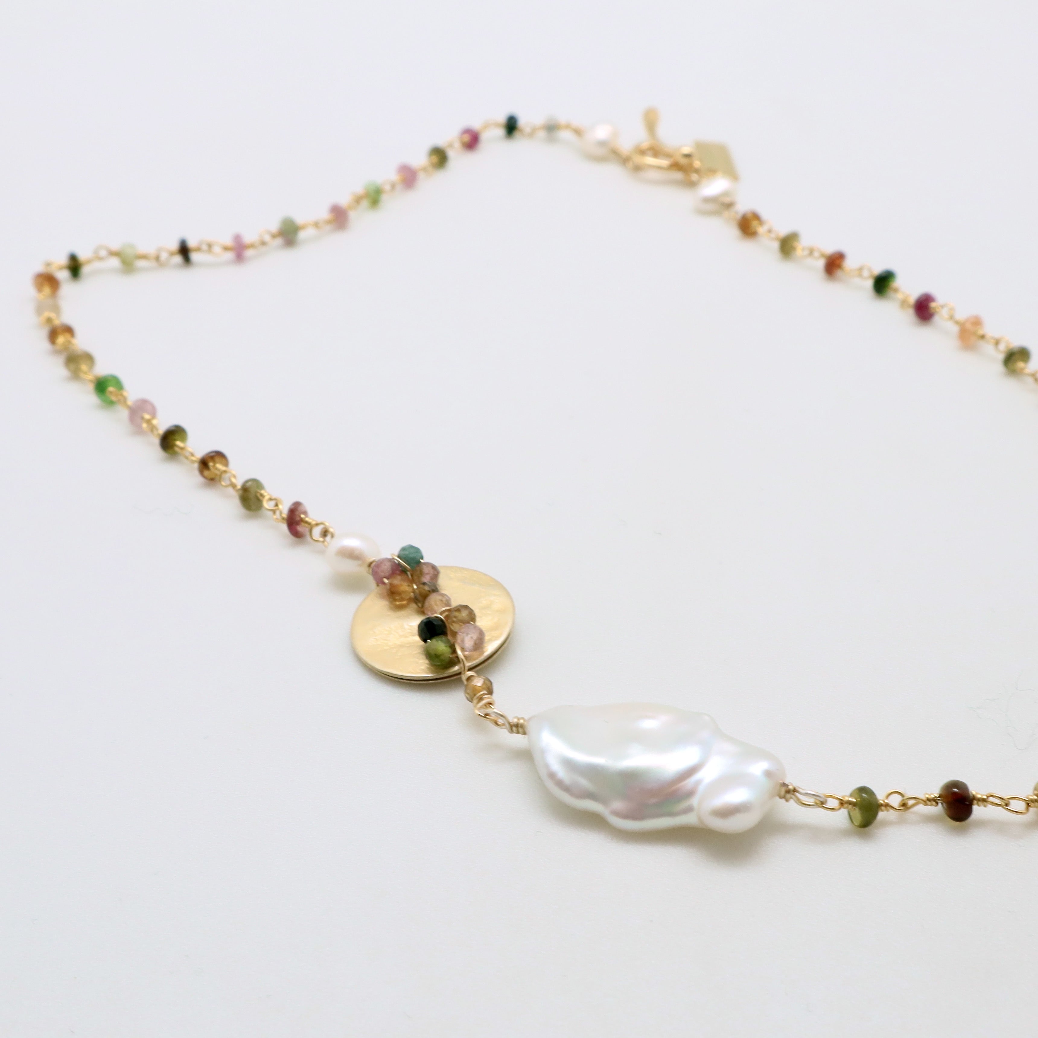 This stunning tourmaline chain necklace features a hammered disc and a statement baroque freshwater pearl.