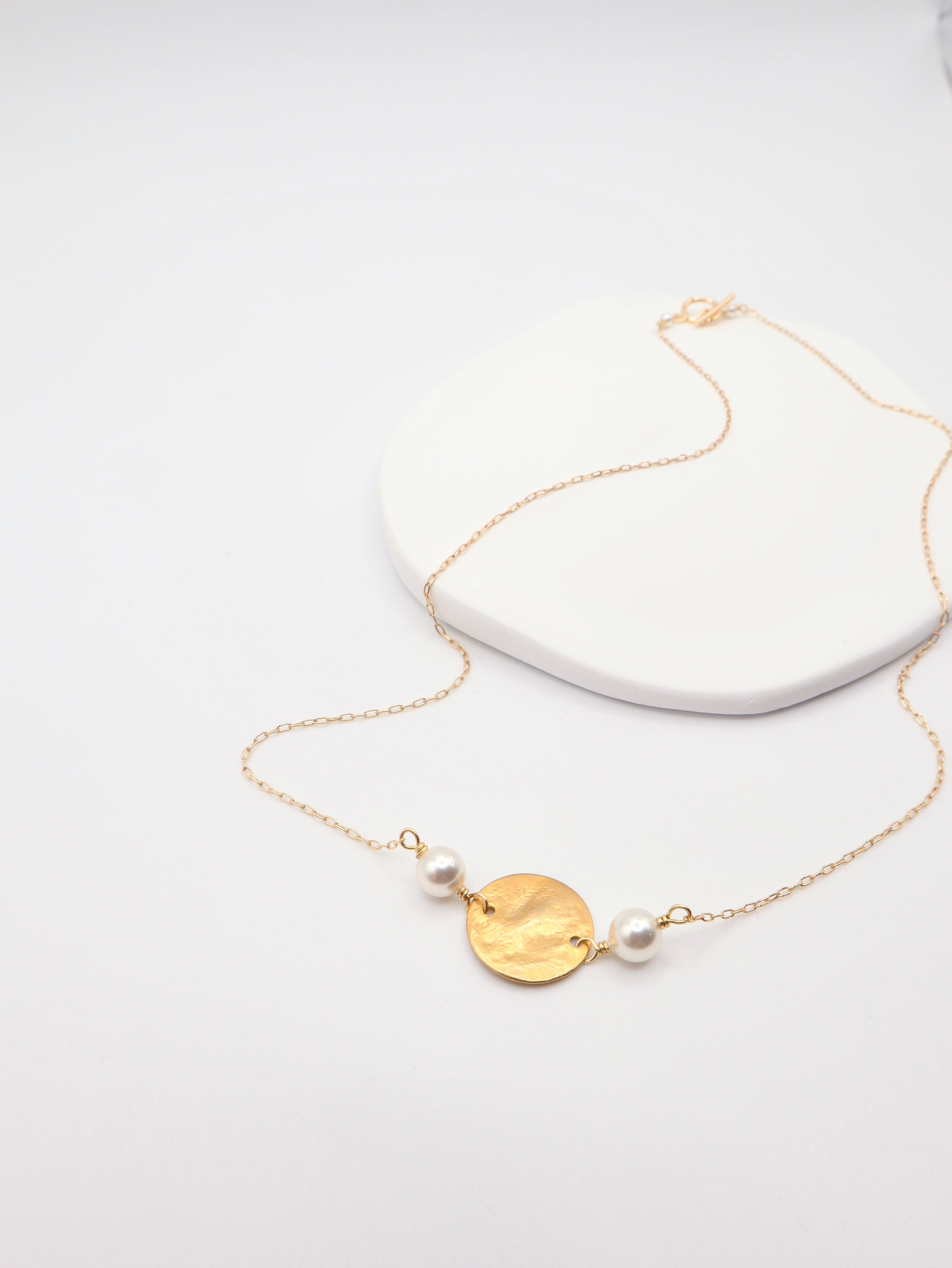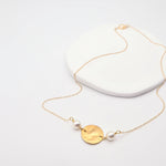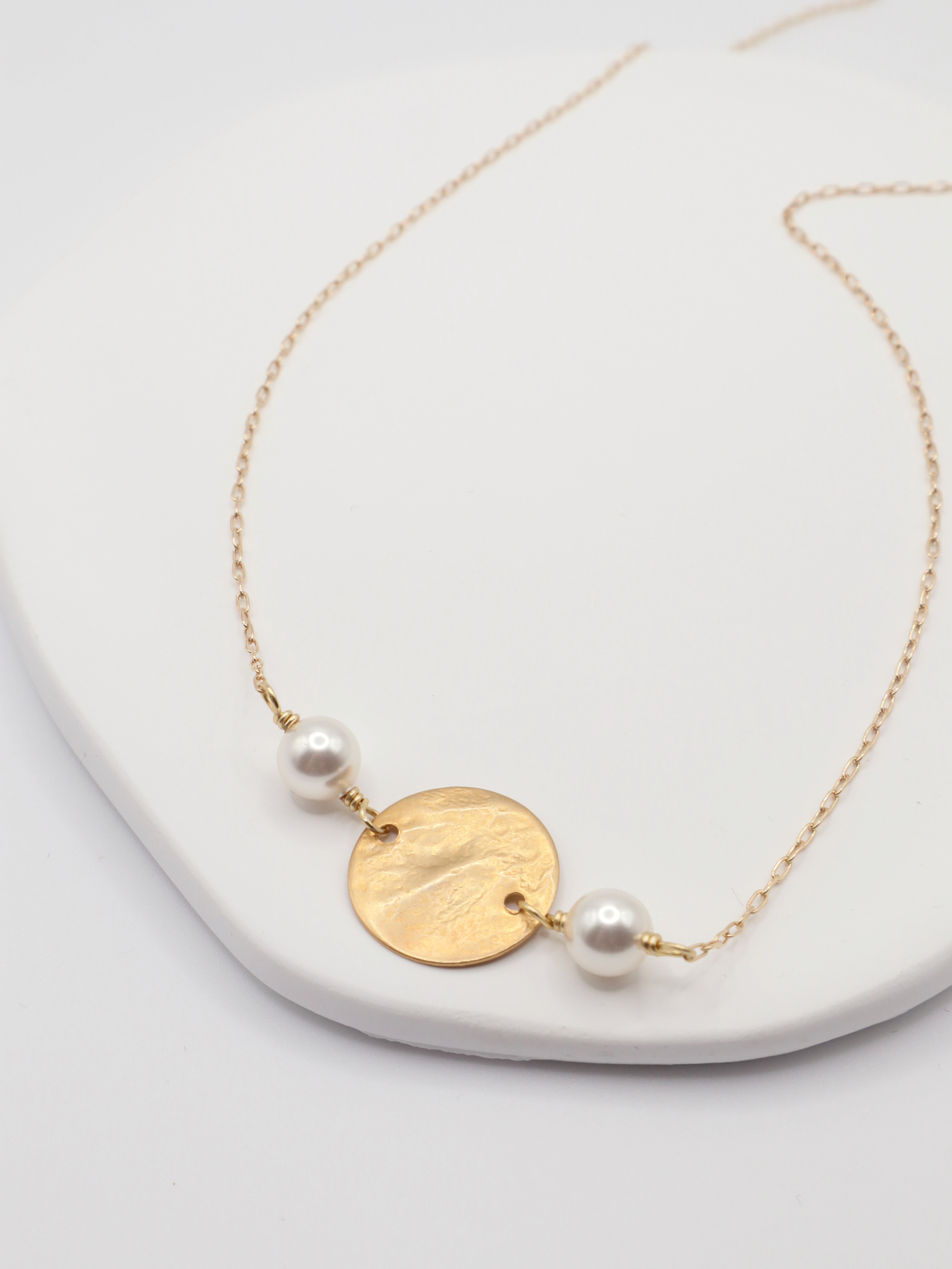 Crafted with a hammered gold plated disc and a gold-filled chain, this piece clearly stands out.