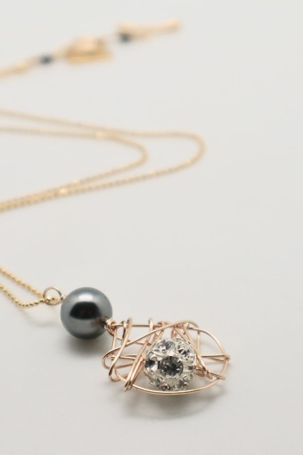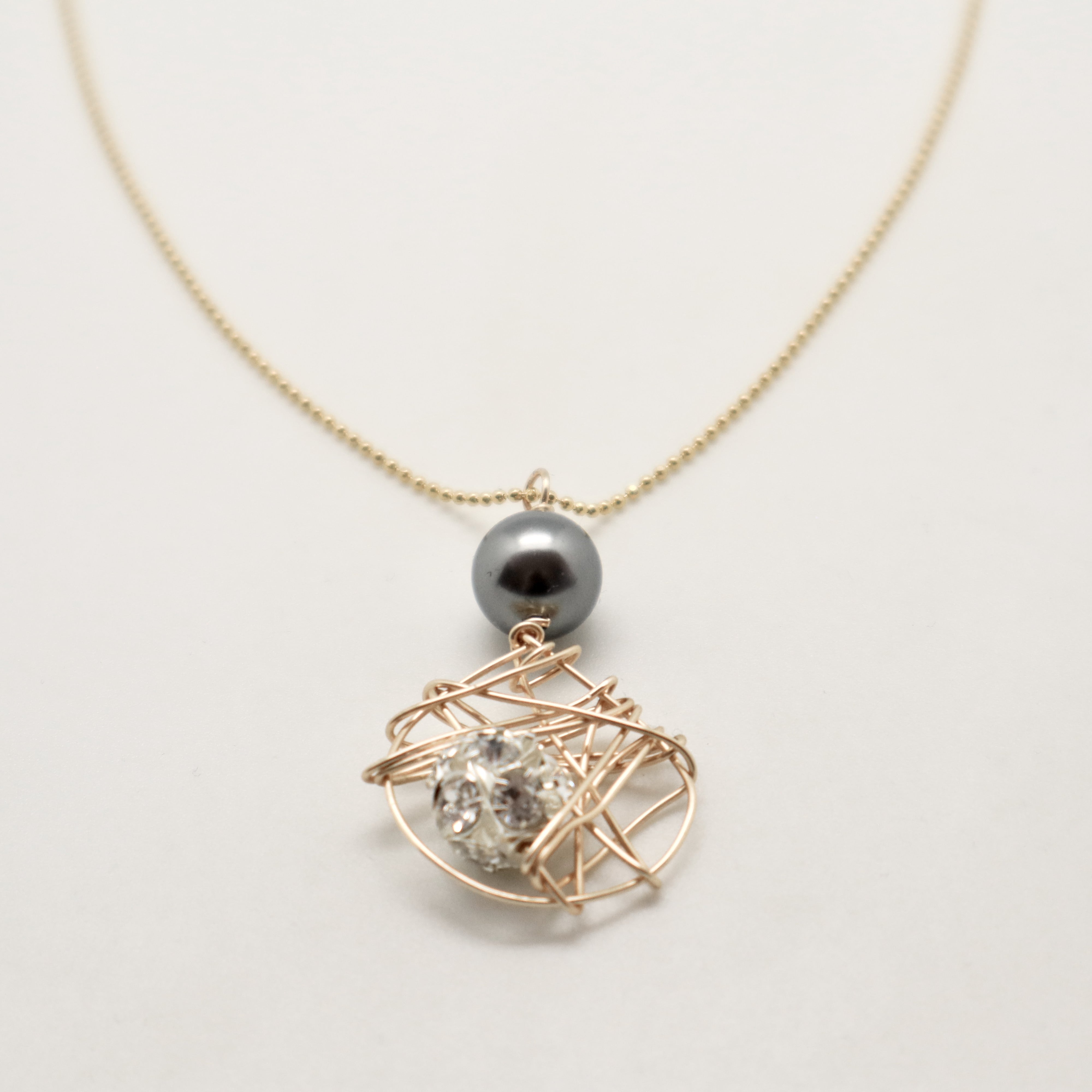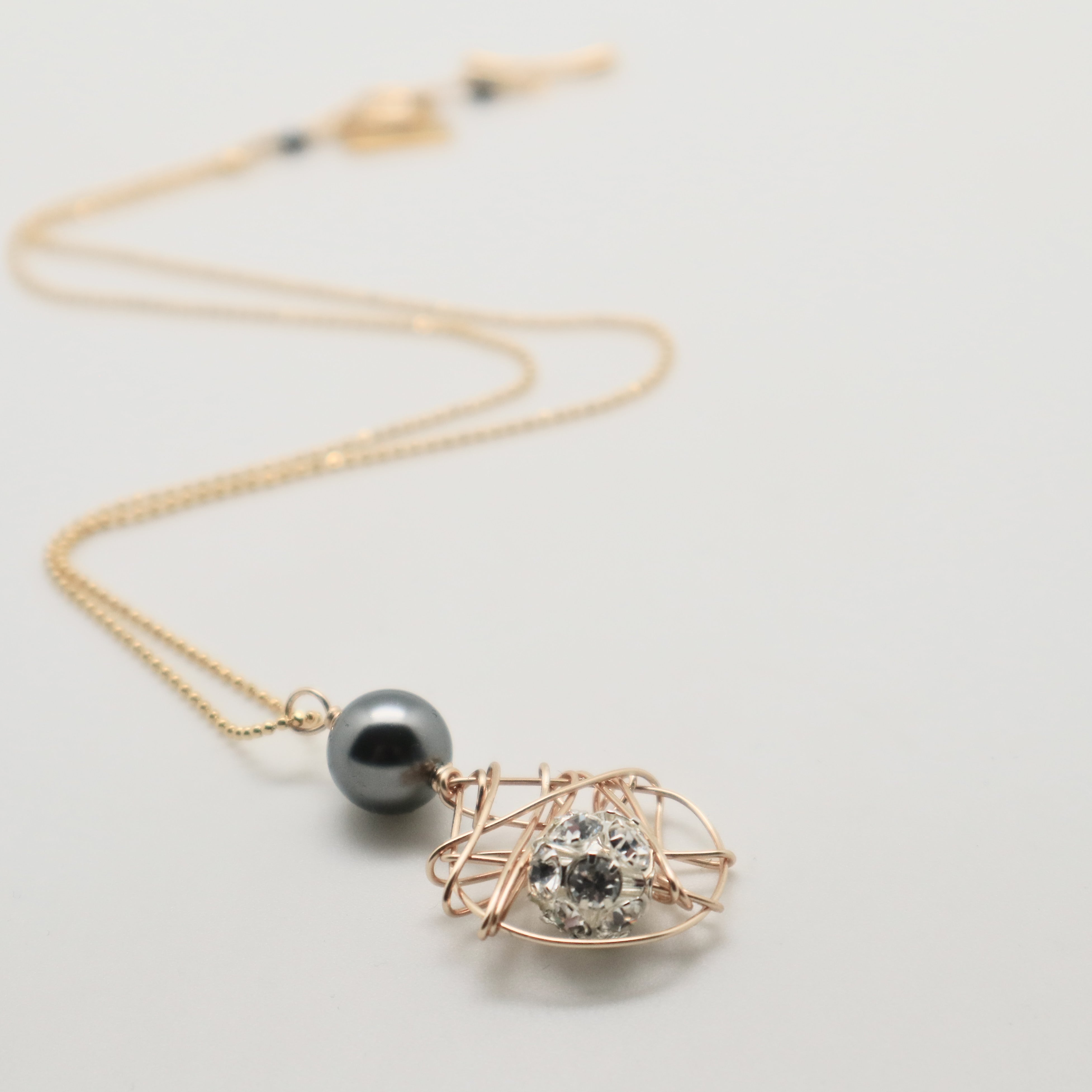 Each one-of-a-kind cage holds a sparkling rhinestone and a lustrous grey pearl, all on a sleek ball chain.