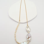 This freestyle baroque pearl necklace combines the natural beauty of unique baroque pearls with the subtle shine of a matte gold beaded chain.