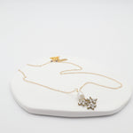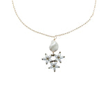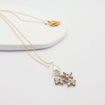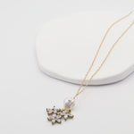 A luminous baroque pearl and floral-shaped rhinestones are strung on a gold-filled fine chain, catching the light with every movement.