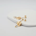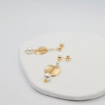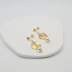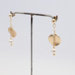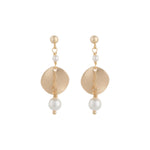 Discover the perfect blend of modern design and classic beauty with these matte gold ripple disc earrings, featuring a stunning white pearl drop.