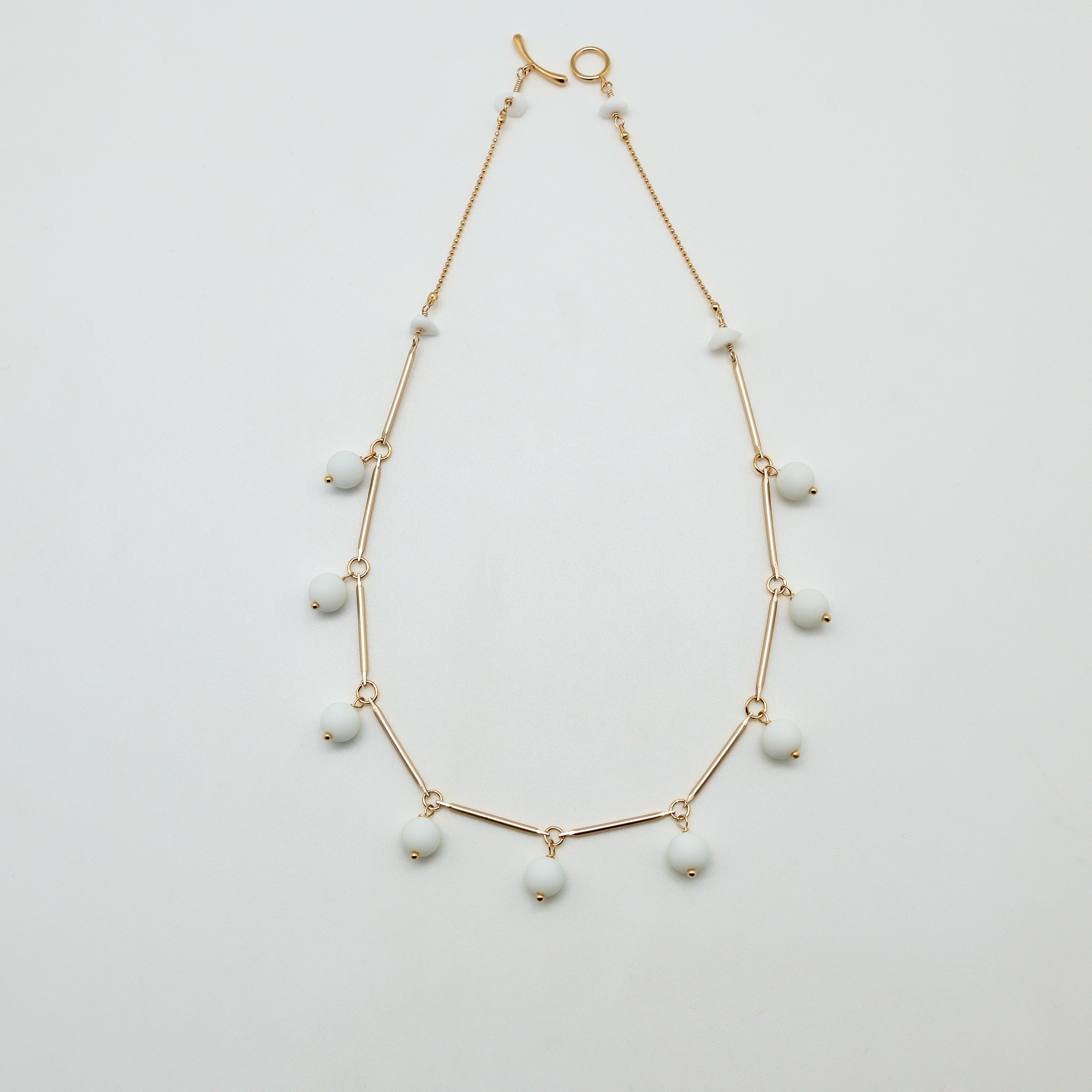 This versatile piece features a matte gold bar collar adorned with delicate white seaglass droplets.