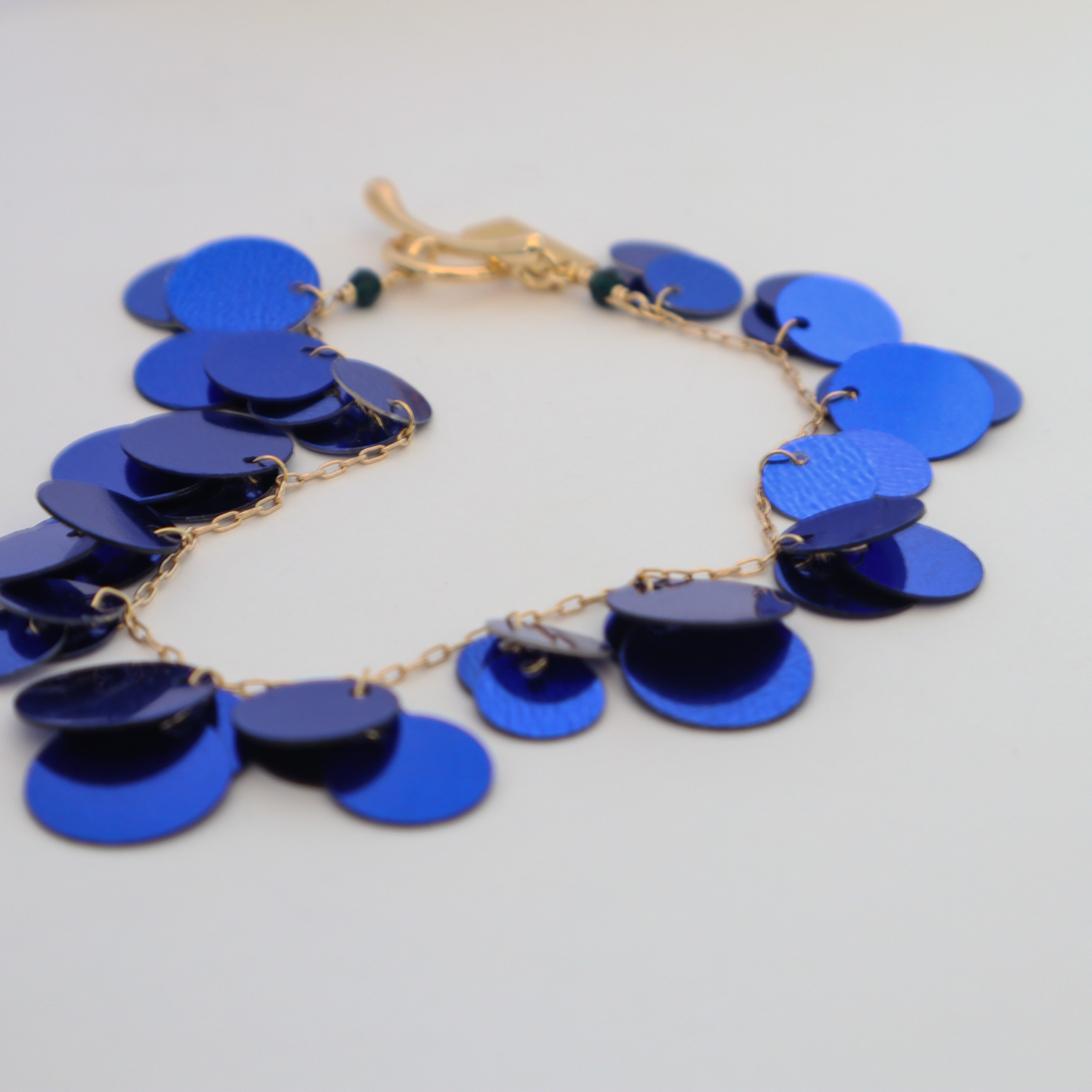 Flaunt your high glamour style with the Siena Bracelet in Cobalt, a unique charm bracelet featuring shimmering sequins in an electric blue hue.