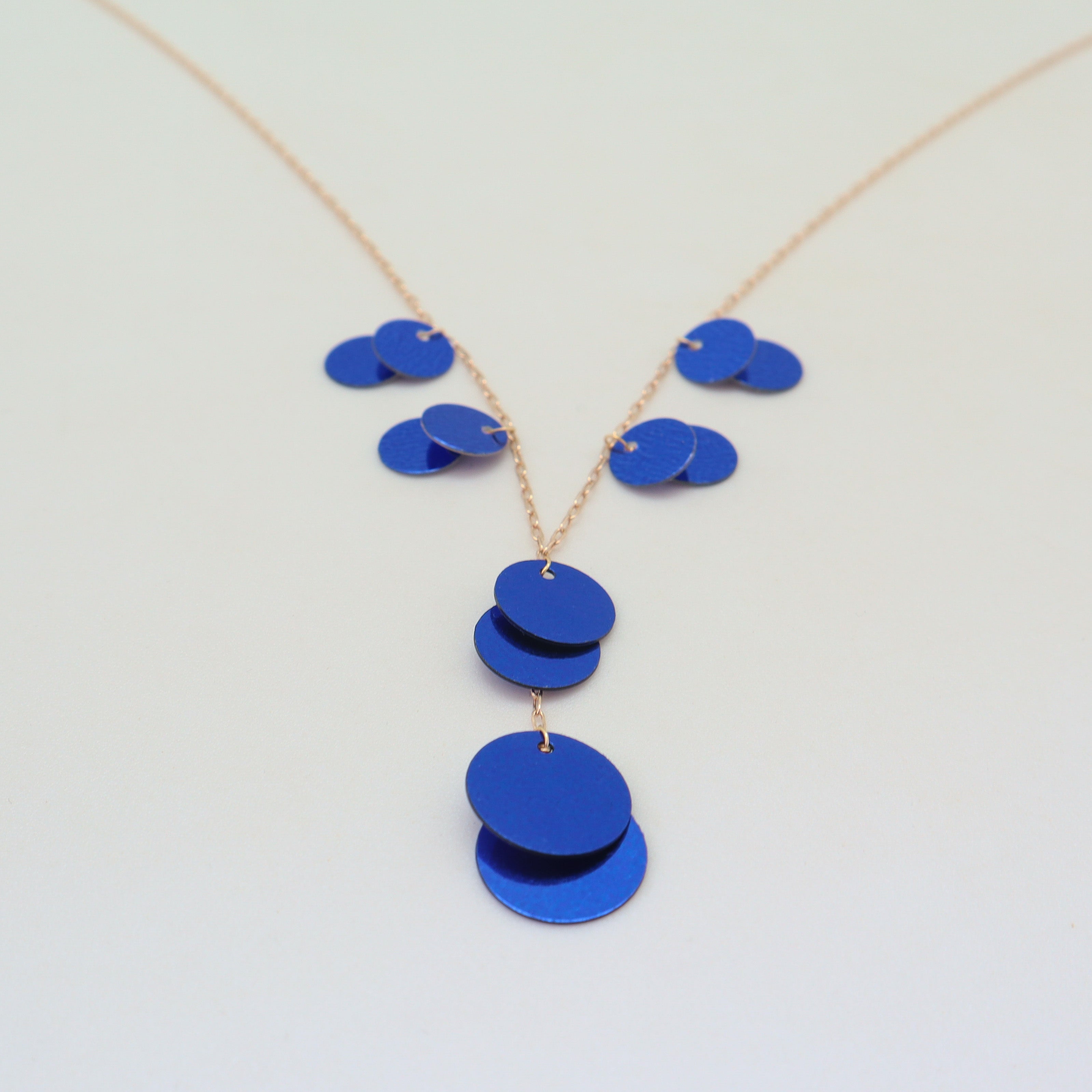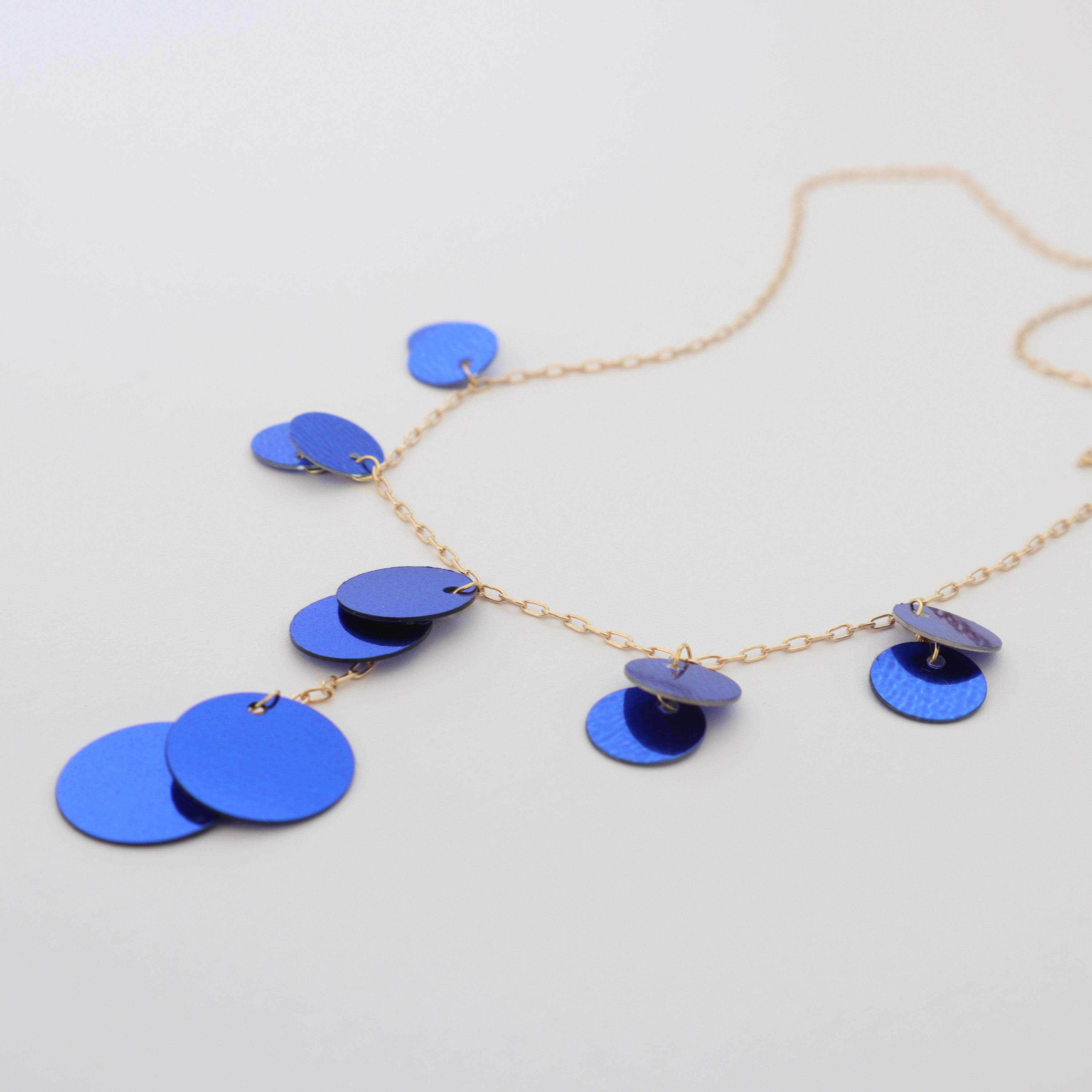 The Sylvie Necklace in Cobalt is alluringly eye-catching with its striking cobalt blue sequins and gold-filled chain.
