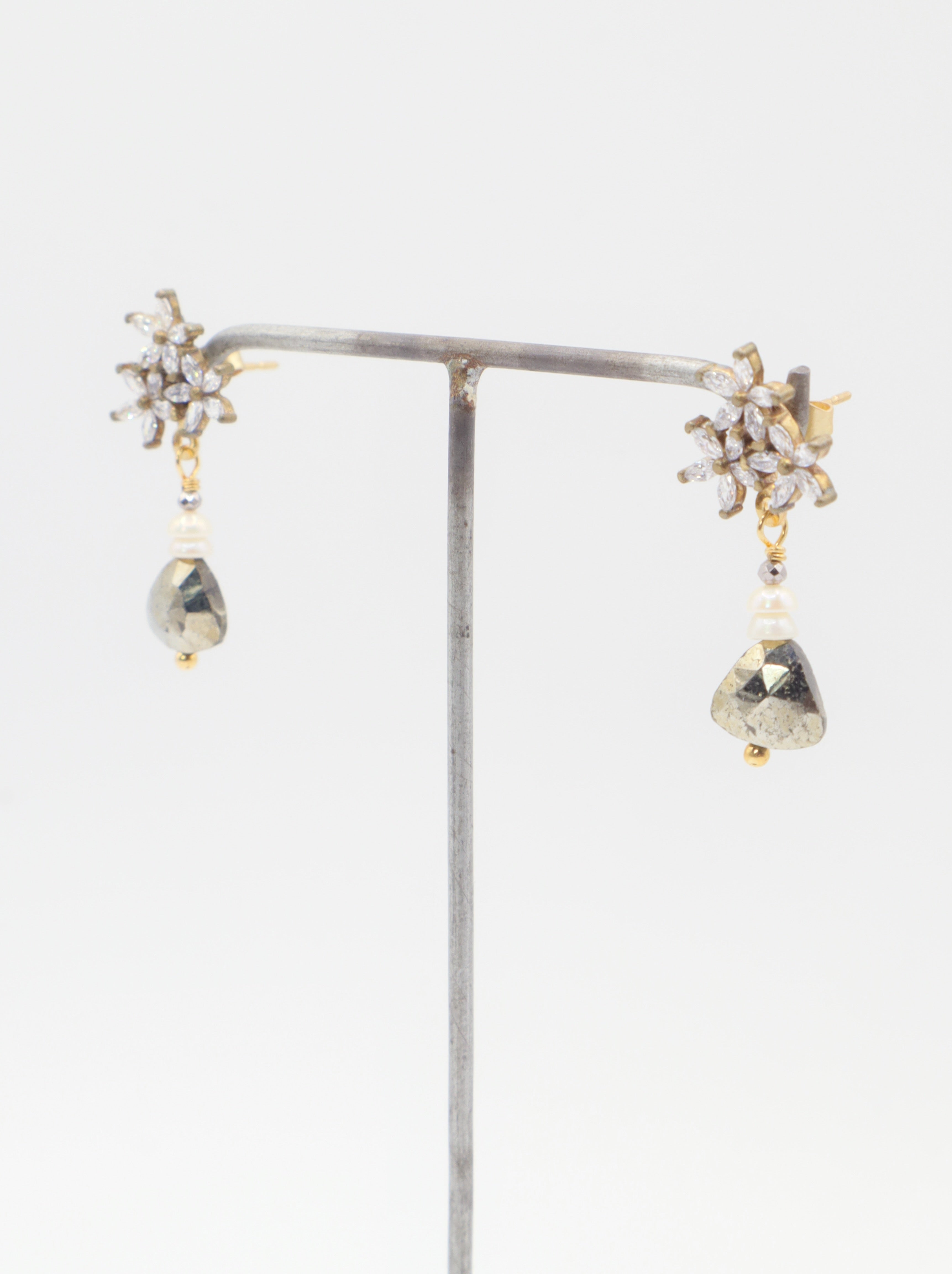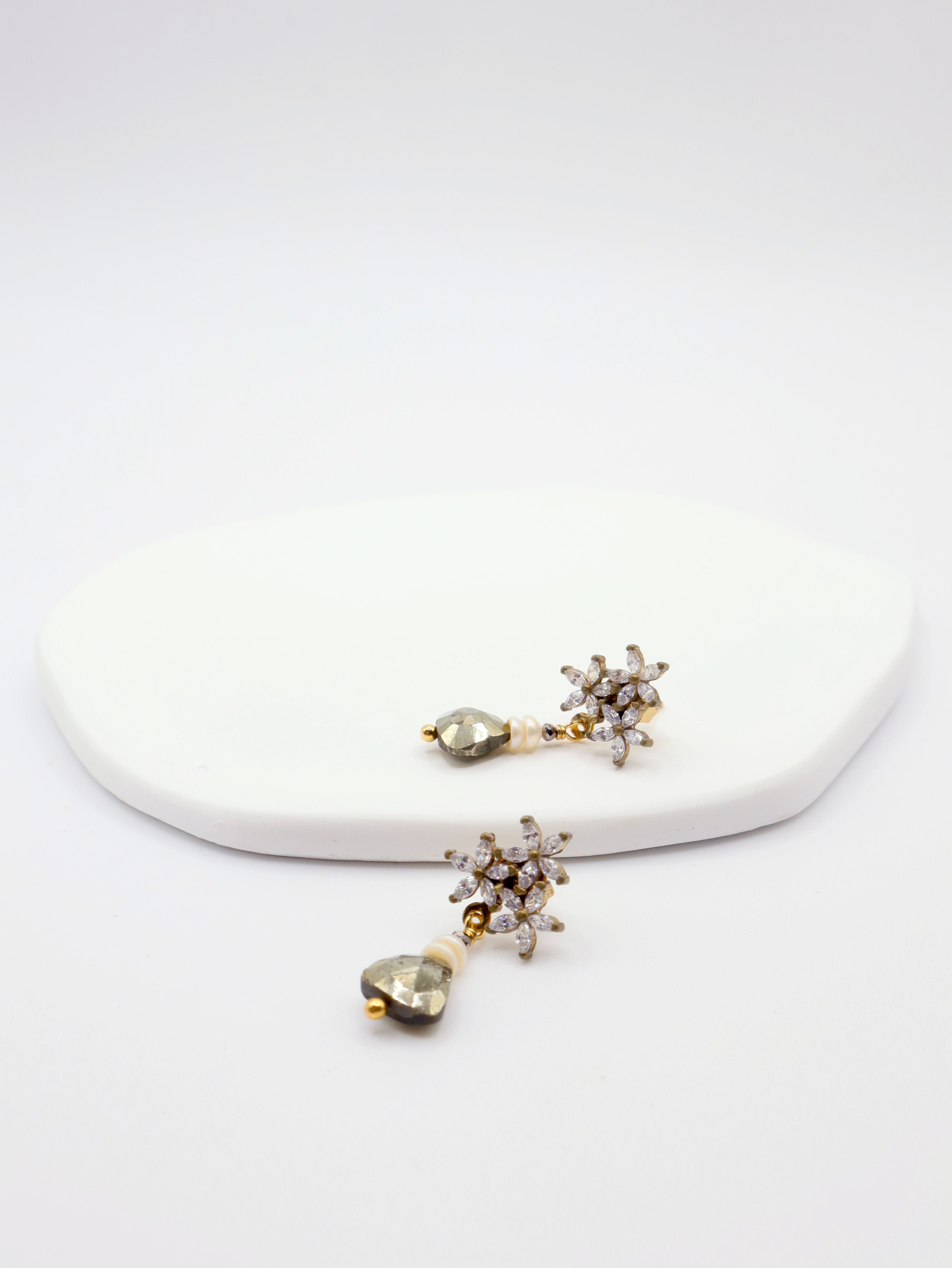 Radiating with a trio of floral-shaped stones, they also feature drops of lustrous pearls and faceted crystal beads.