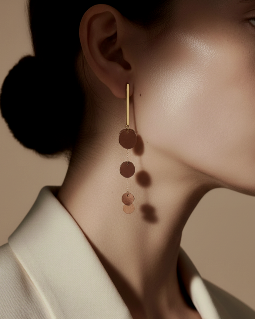 Eye-catching bronze sequin discs, matte gold bar posts and gold-filled chain will have you catching the light in style.