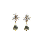Radiating with a trio of floral-shaped stones, they also feature drops of lustrous pearls and faceted crystal beads.
